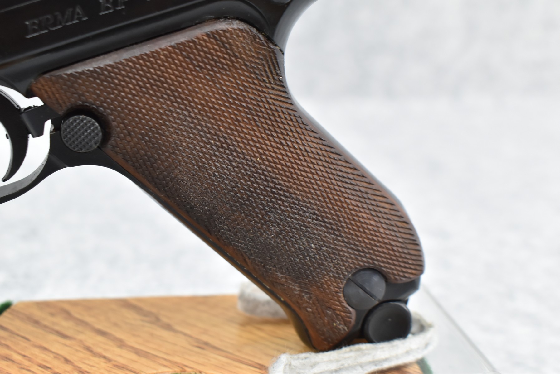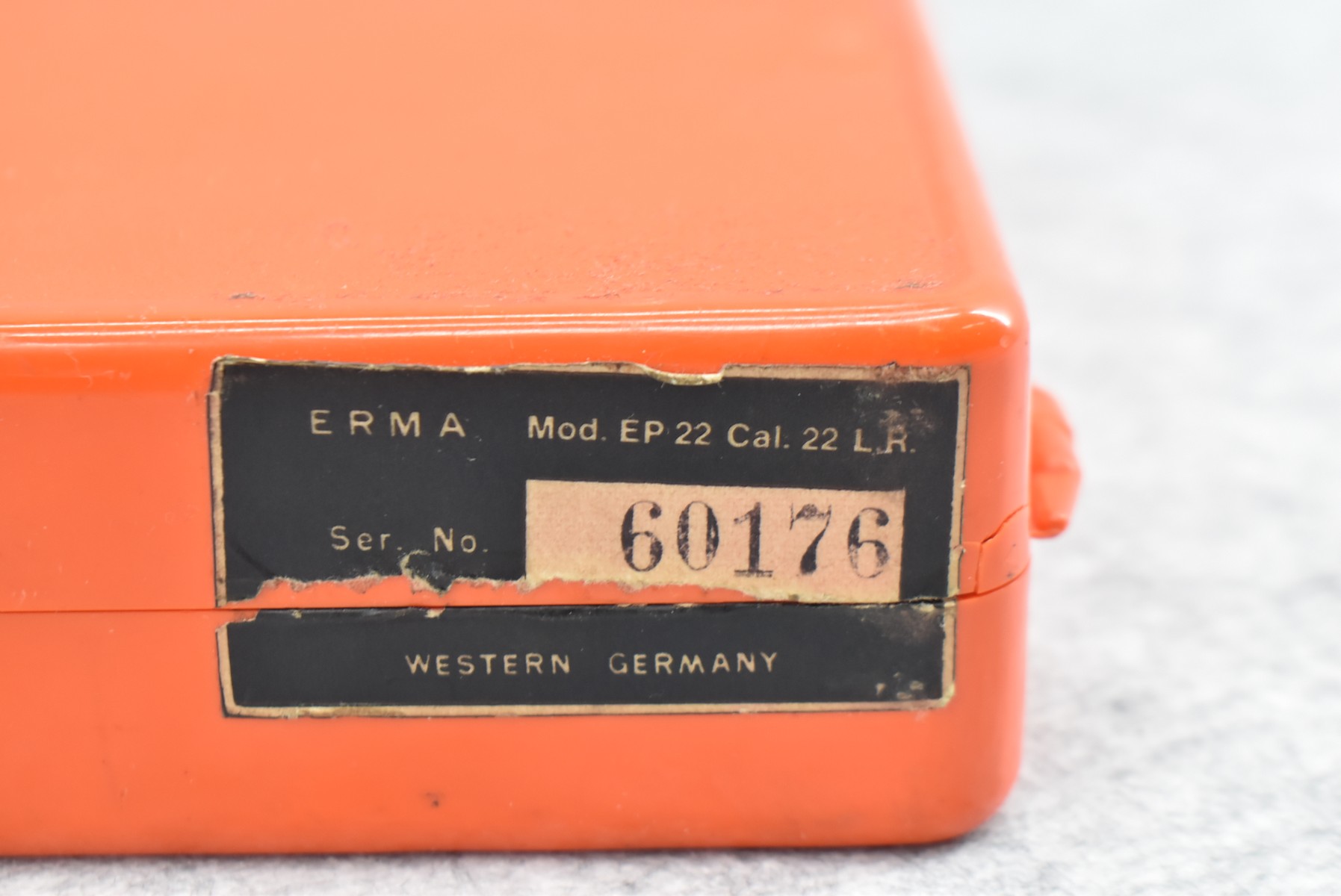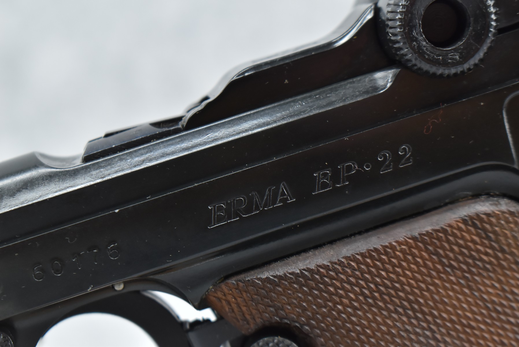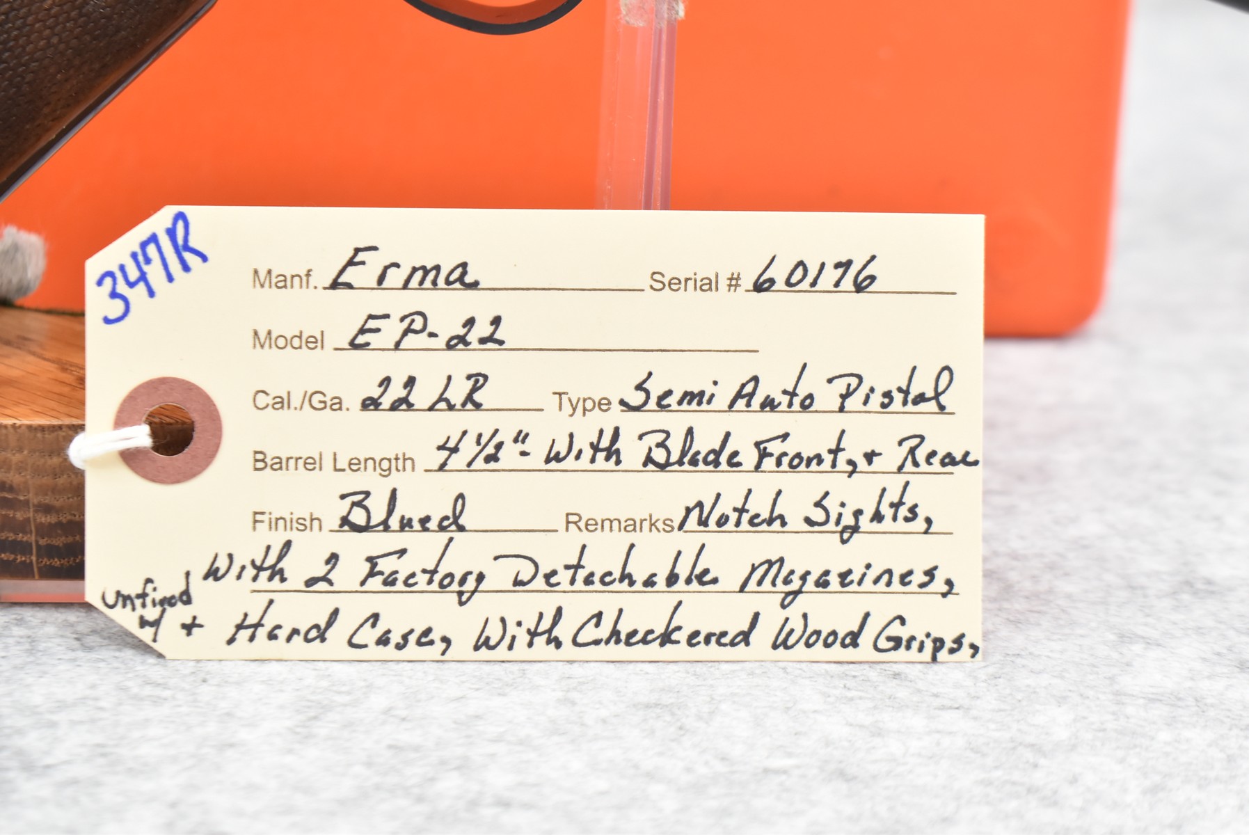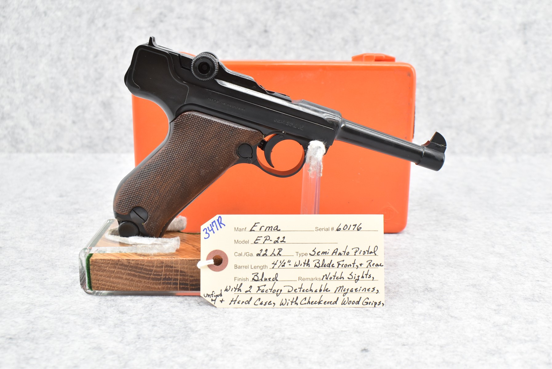 347R. Erma – Mod. EP-22 – 22LR Cal. Semi-Auto Pistol – w/4½” Barrel w/Blade Front and Rear Notch Sights – Blued Finish – w/Checkered Wood Grips – w/2 Factory Detachable Magazines – Unfired w/Hard Case