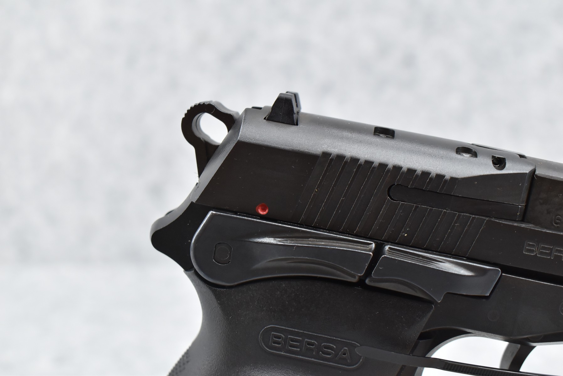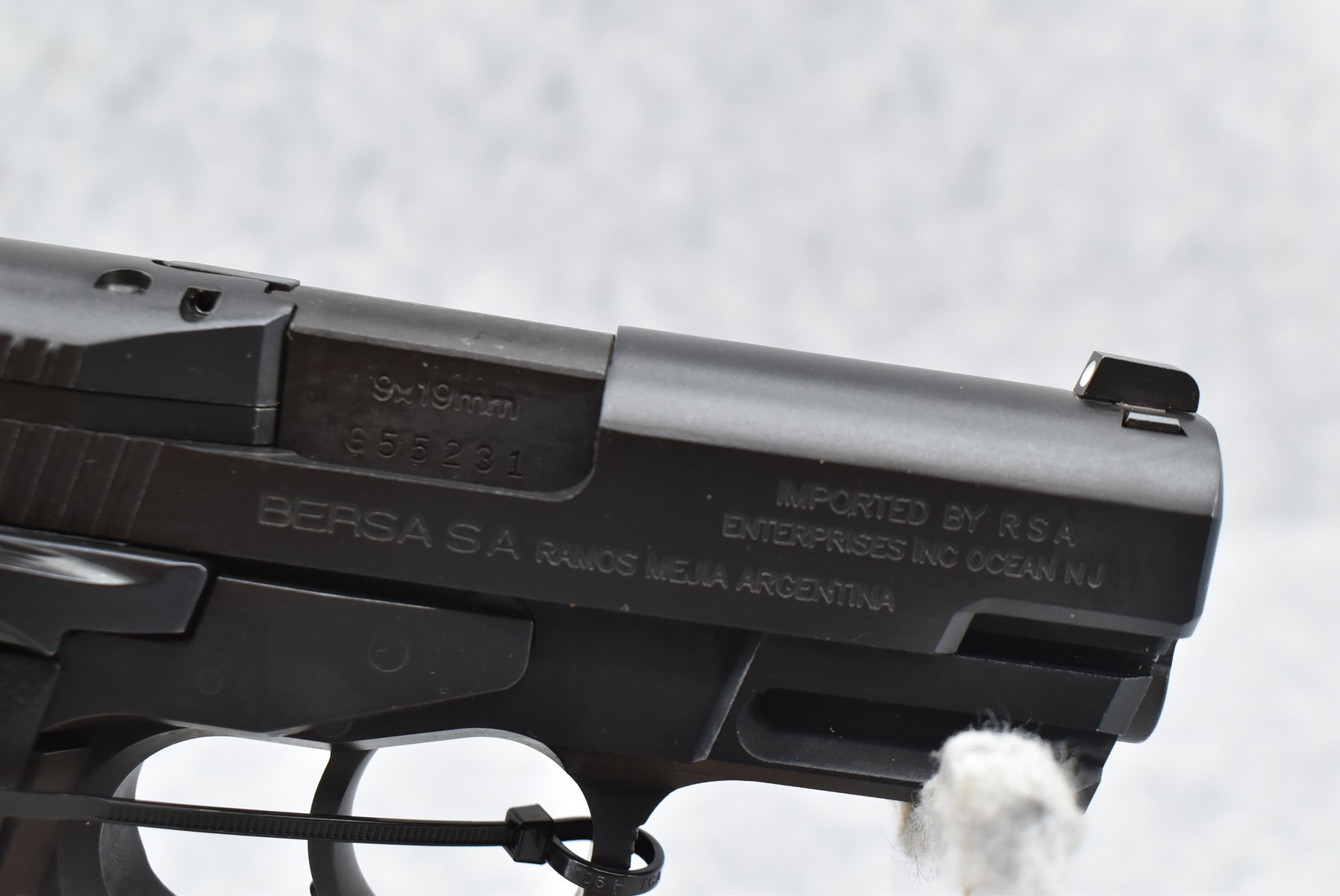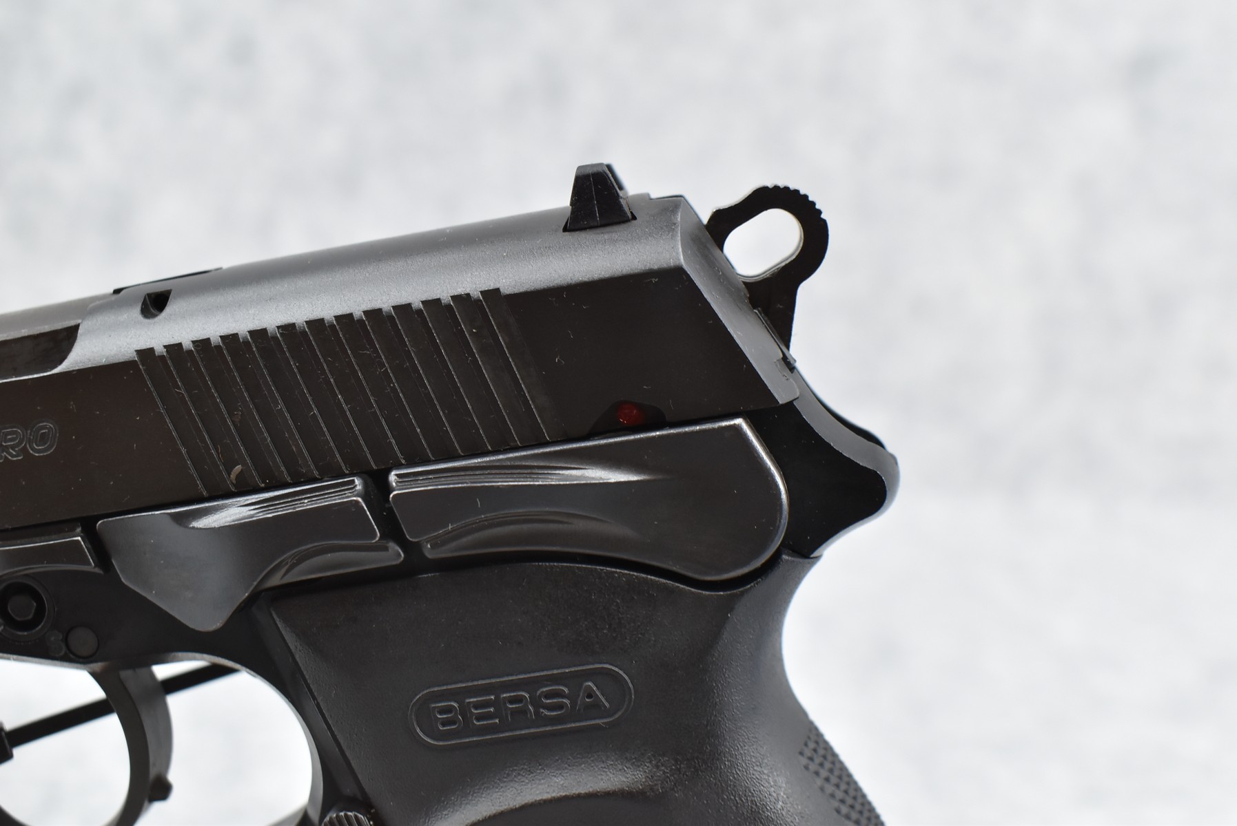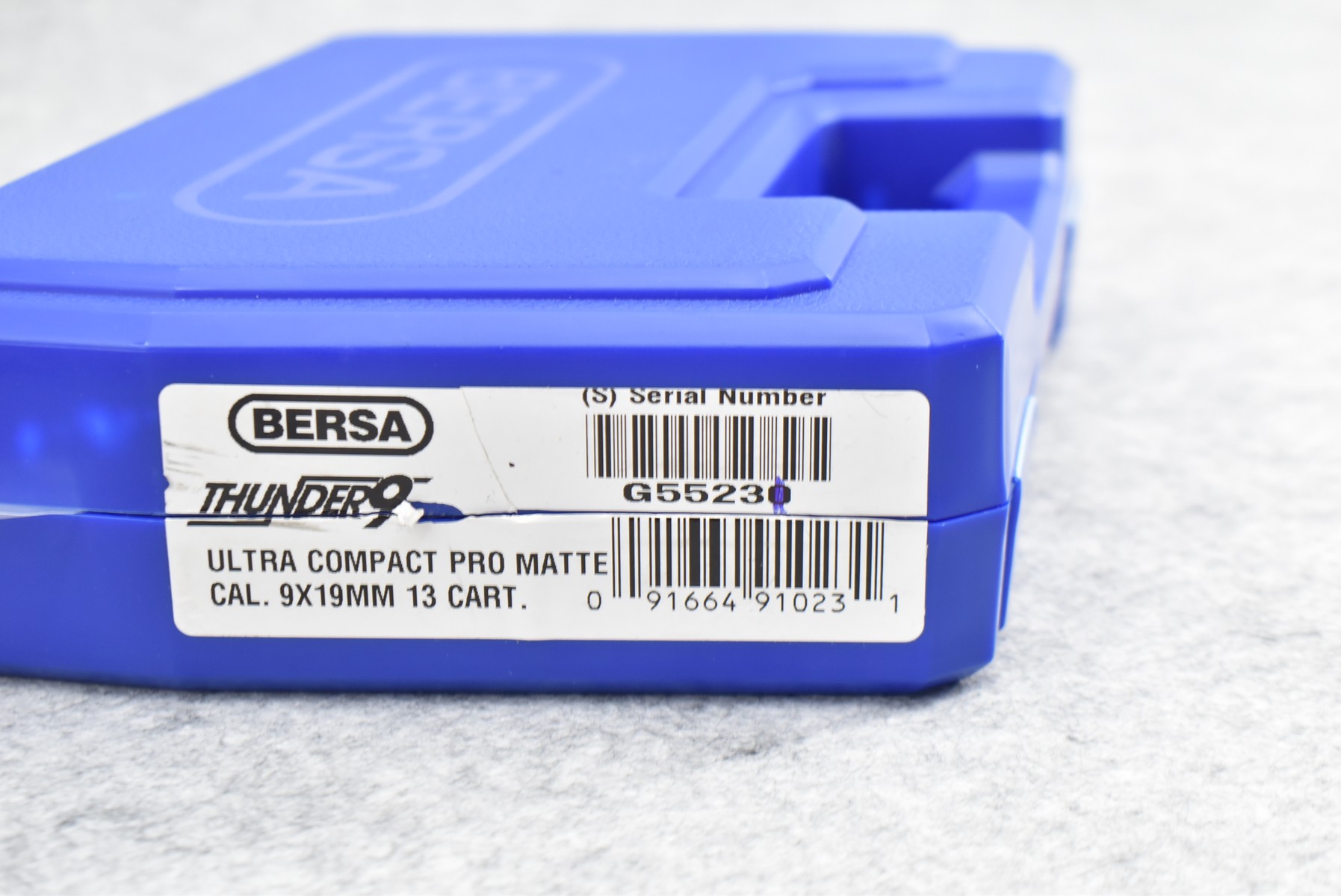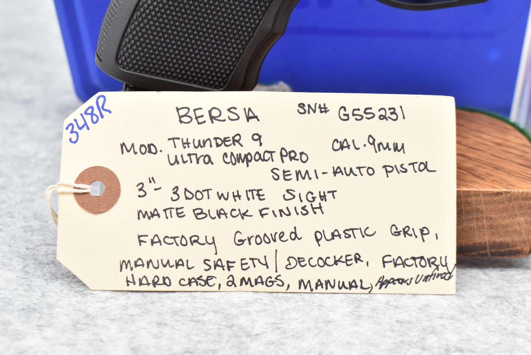 348R. Bersa – Mod. Thunder 9 Ultra Compact Pro – 9mm Cal. Semi-Auto Pistol – w/3” Barrel w/3-Dot White Sight – Matte Black Finish – w/Factory Grips – w/Manual Safety/Decocker – w/2 Magazines – Appears Unfired w/Factory Hard Case and Manual