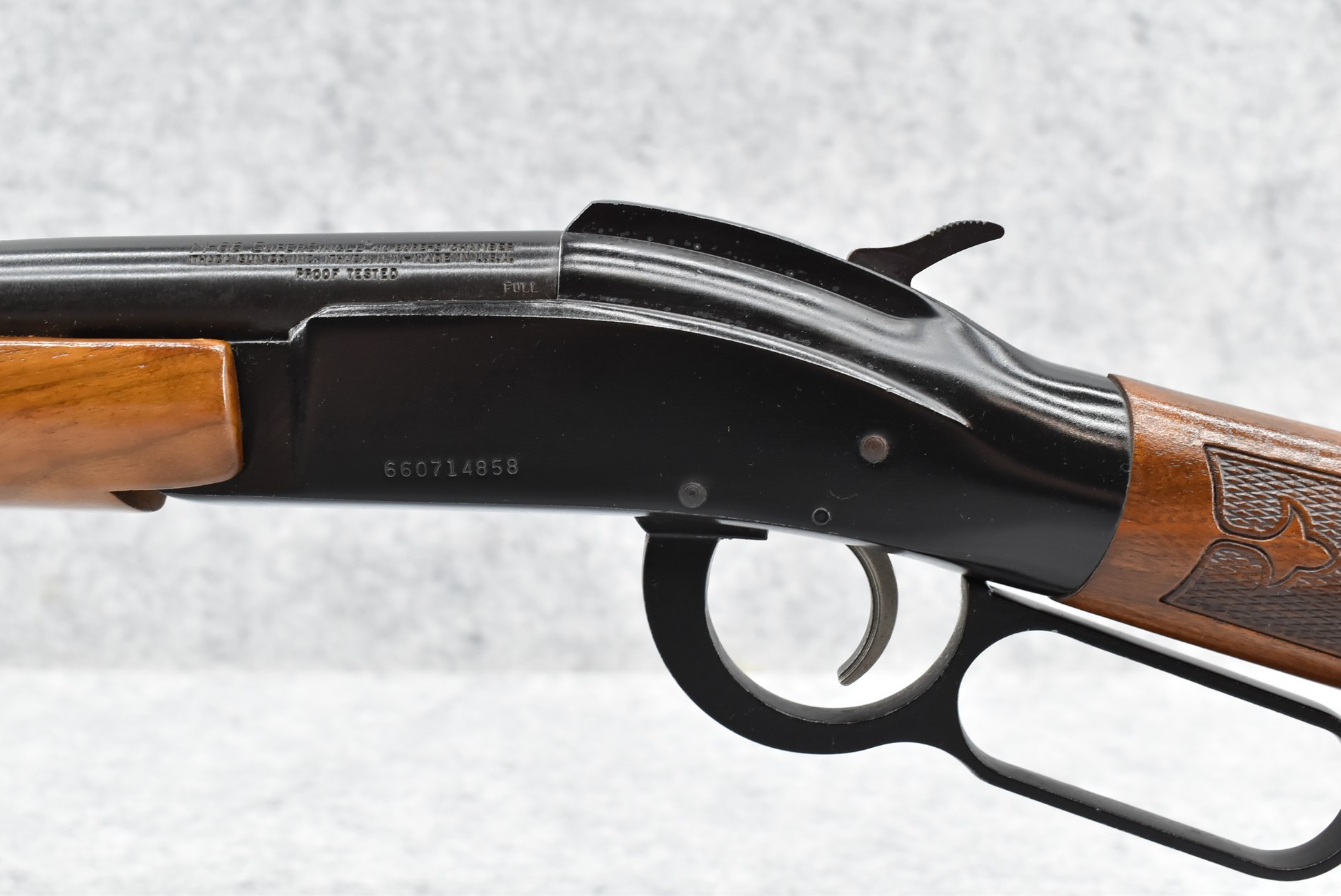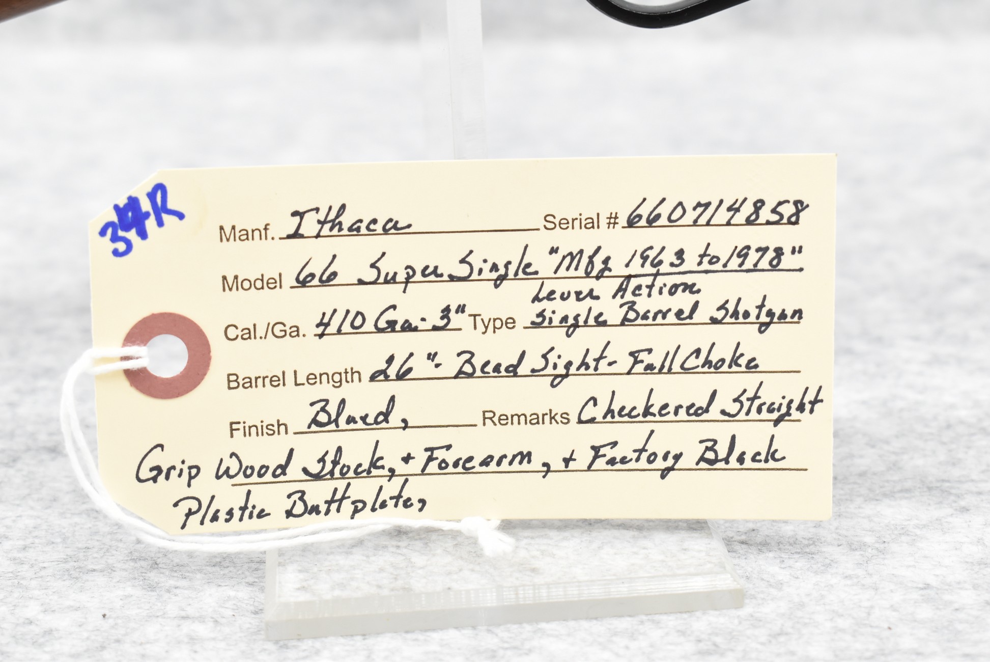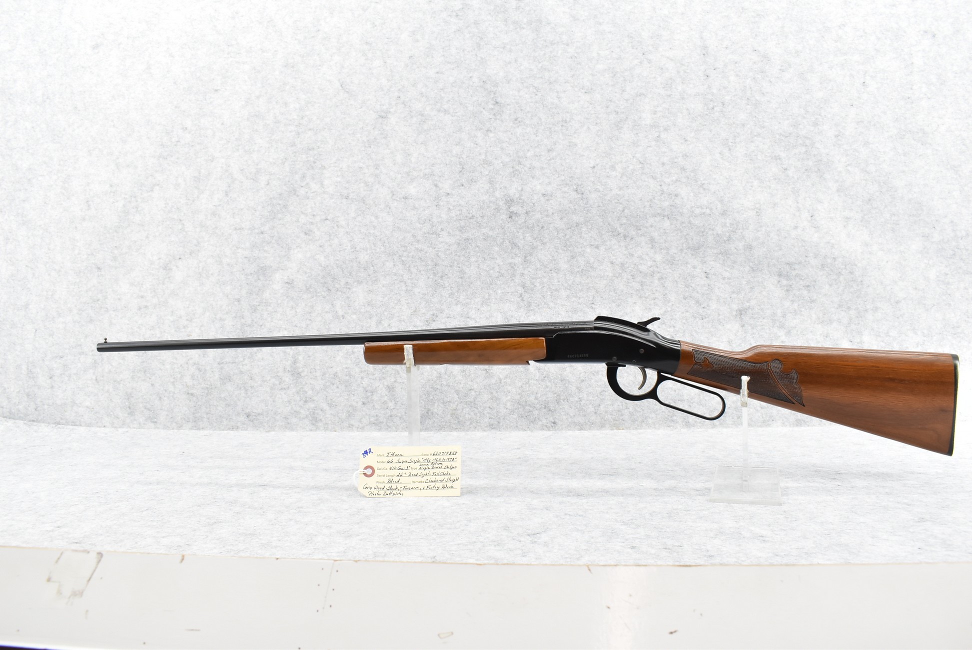 34R. Ithaca – Mod. 66 Super Single – 410ga. 3” Lever Action Single Shot Shotgun – w/26” Full Choke Barrel w/Bead Sight – Blued Finish – w/Checkered Straight Grip Wood Stocks w/Factory Butt Plate