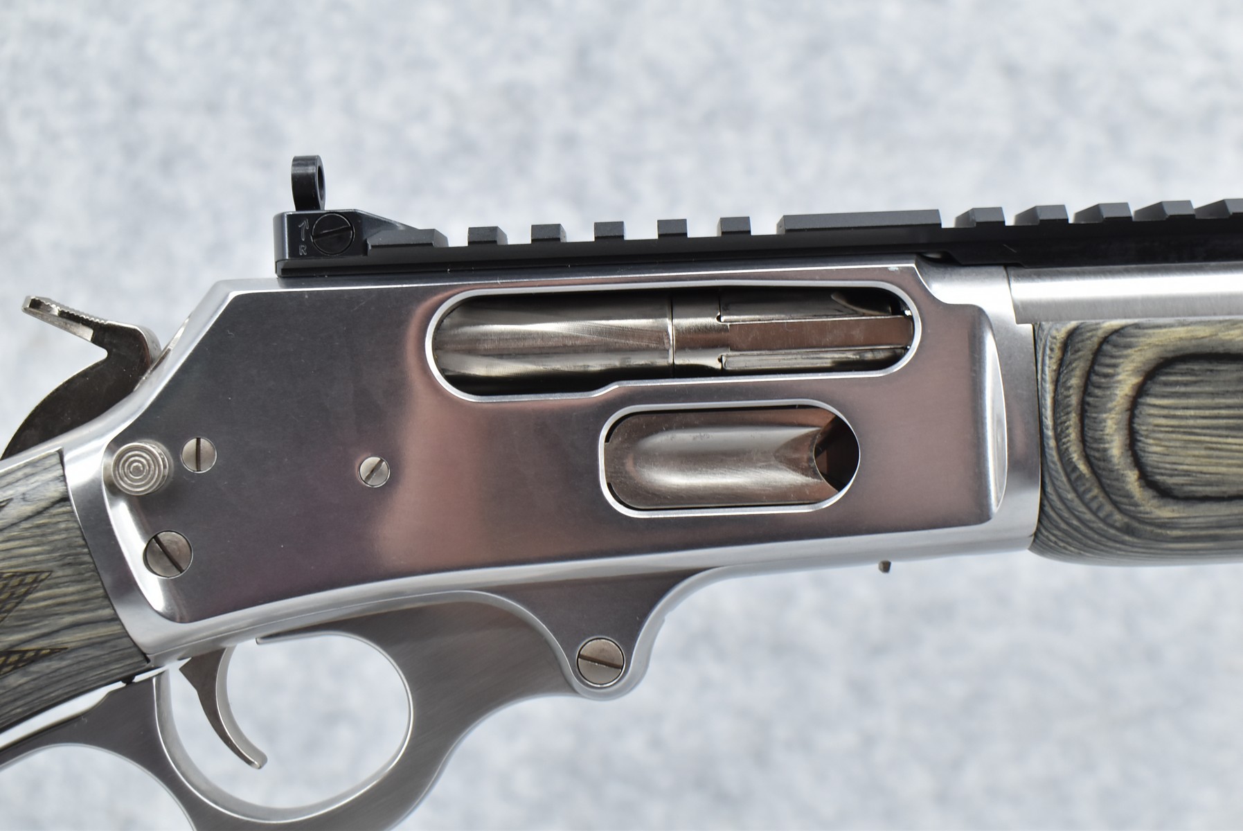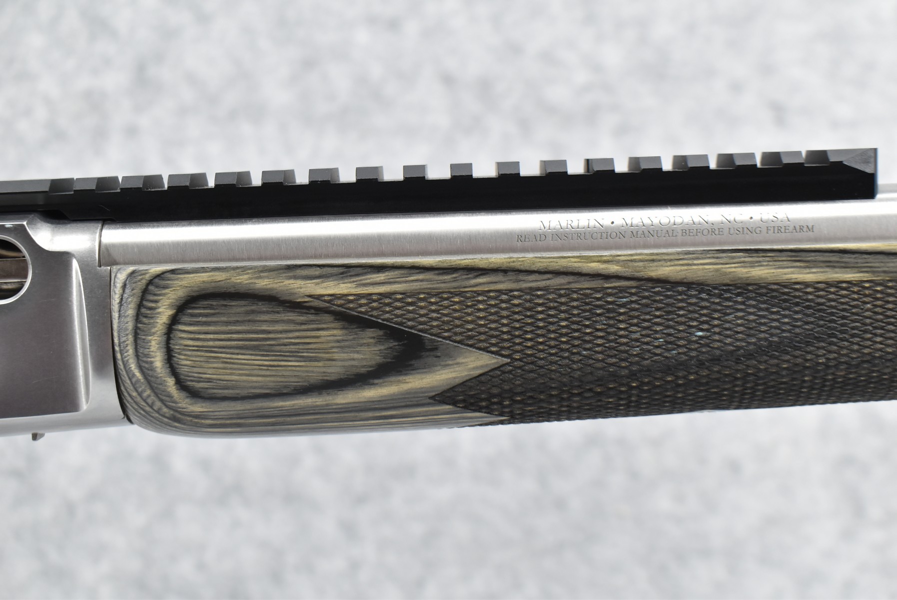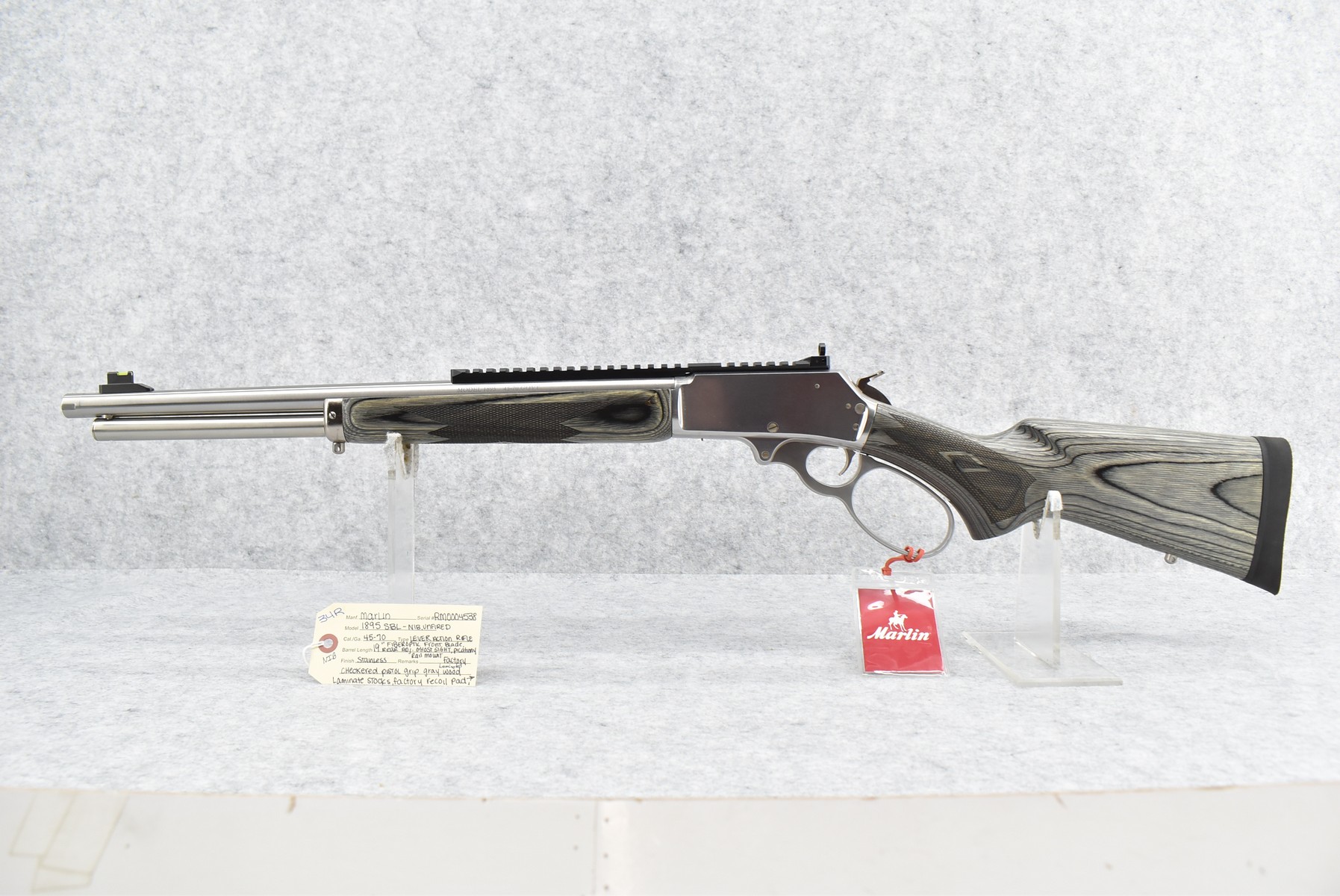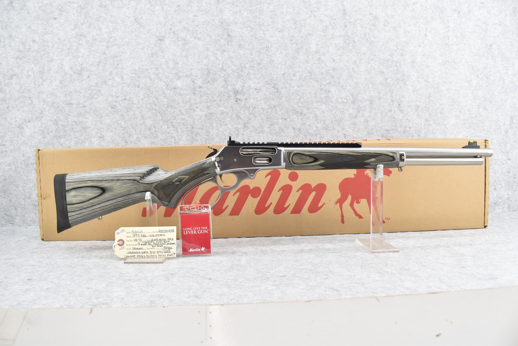 34R. Marlin – Mod. 1895 SBL – 45-70 Cal. Lever Action Rifle – w/19” Barrel w/Fiber Optic Front Blade & Rear Adj. Ghost Sights – Stainless Finish – w/Factory Checkered Pistol Grip Gray Laminated Wood Stocks w/Factory Recoil Pad – w/Picatinny Rail Mount – Unfired w/Factory Box, Manual & Ext. Hammer Spur