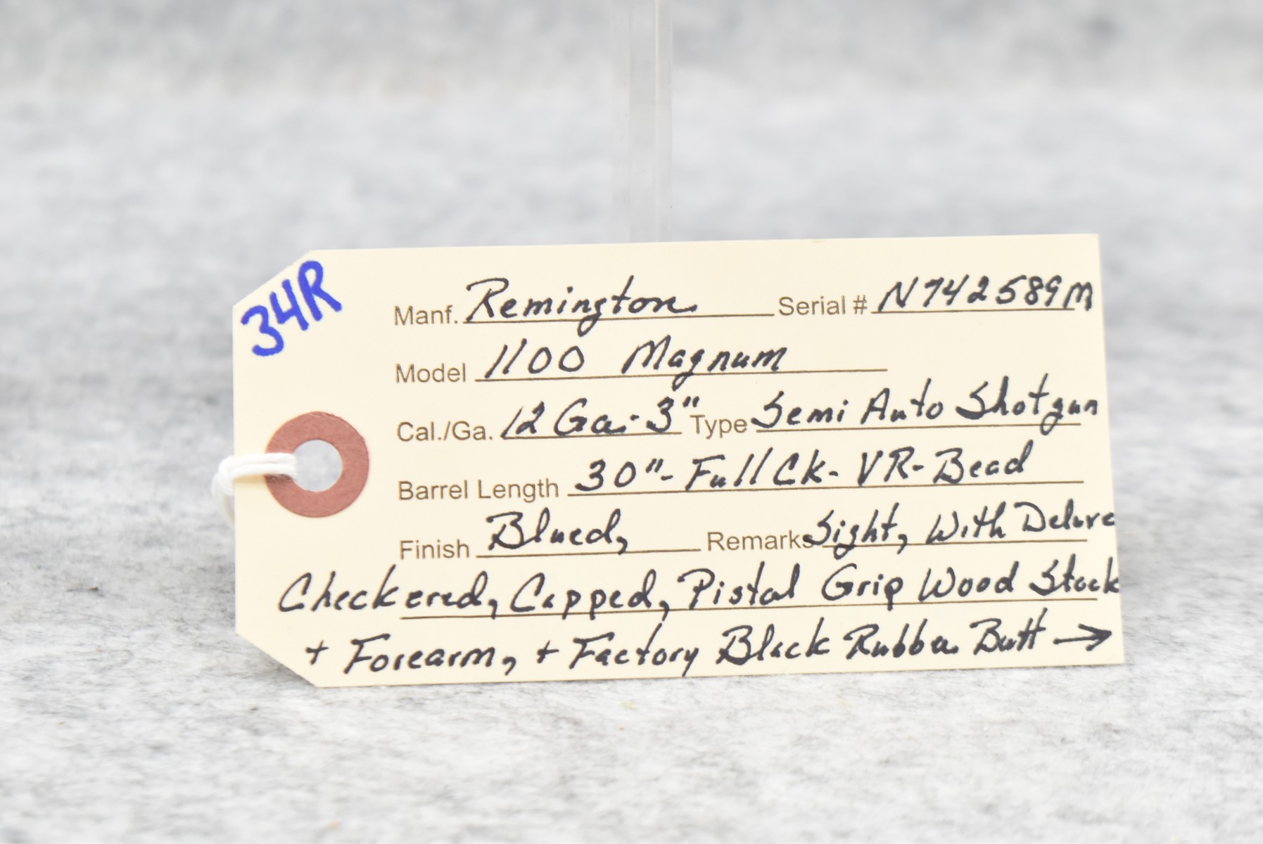 34R. Remington – Mod. 1100 Magnum – 12ga. 3” Semi-Auto Shotgun – w/30” Full Choke, Vent-Rib Barrel w/Bead Sight – Blued Finish – w/Enhanced Receiver on Both Sides – w/Deluxe Checked Capped Pistol Grip Wood Stocks w/Factory Butt Pad