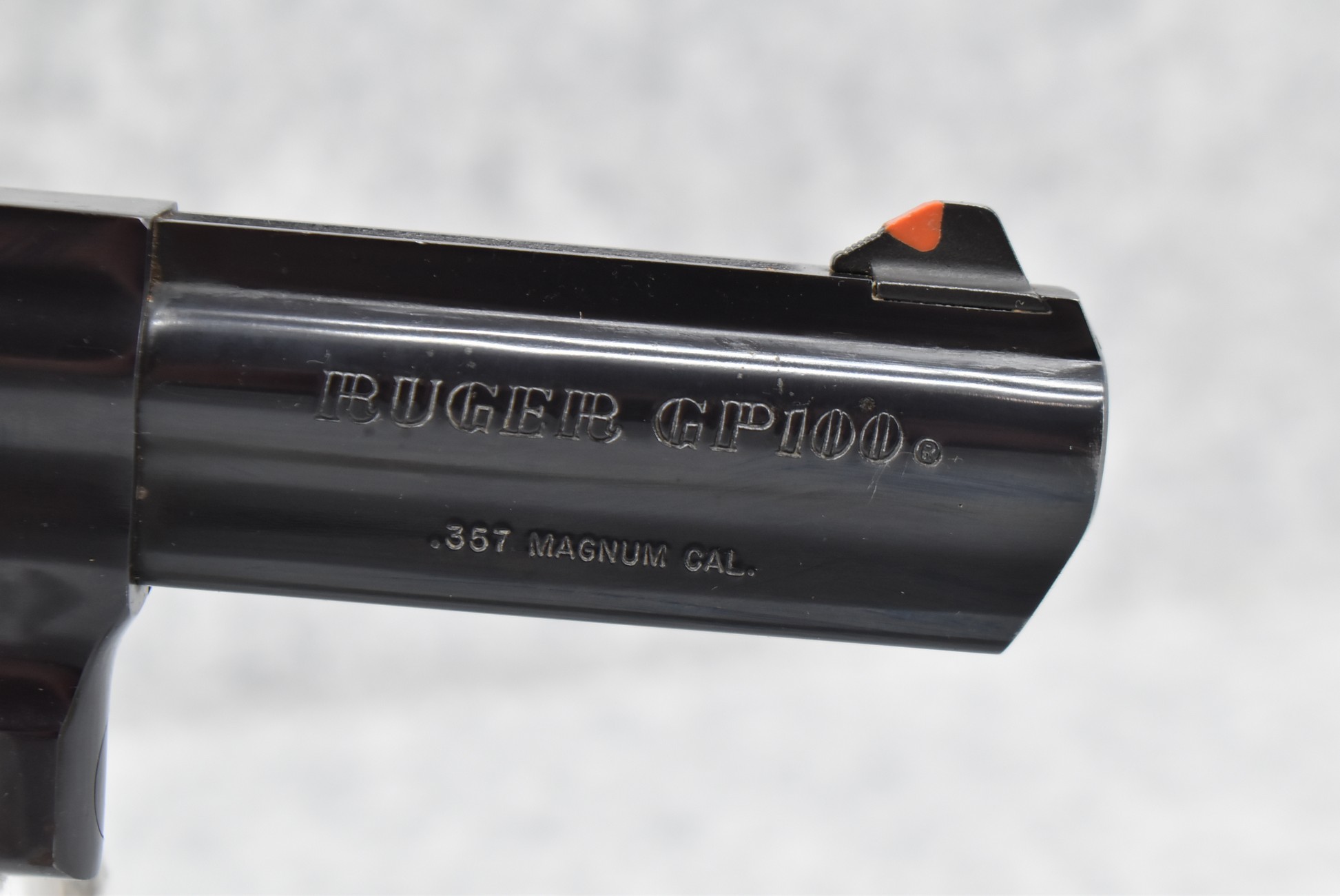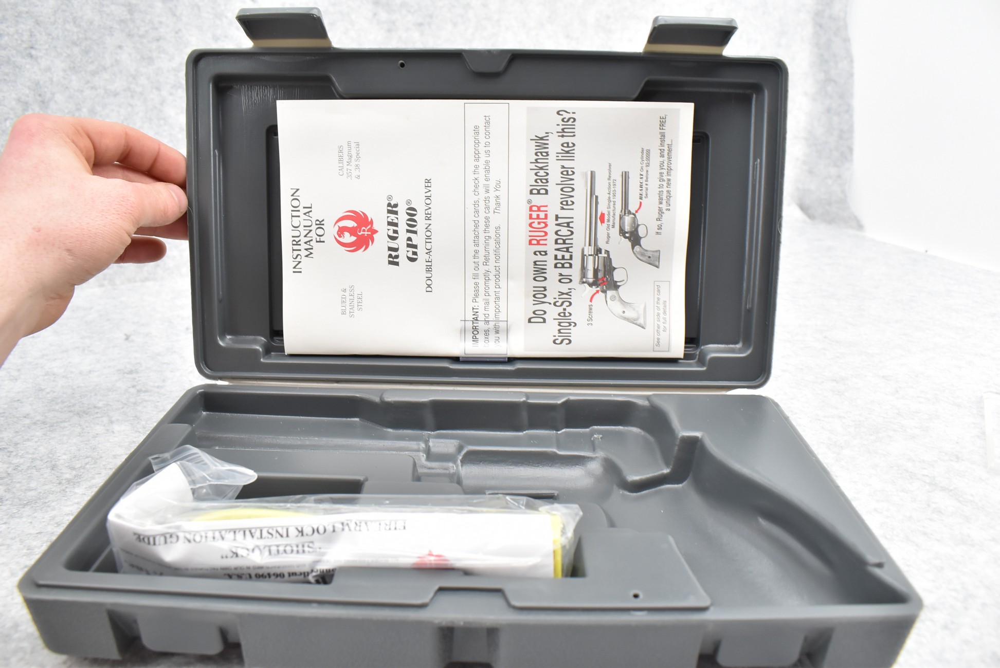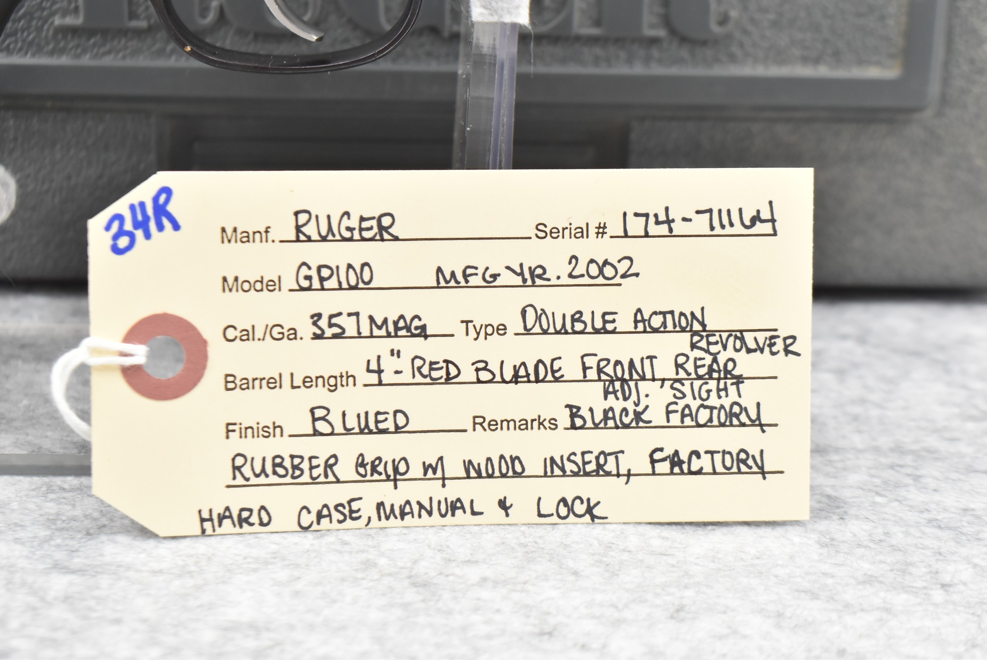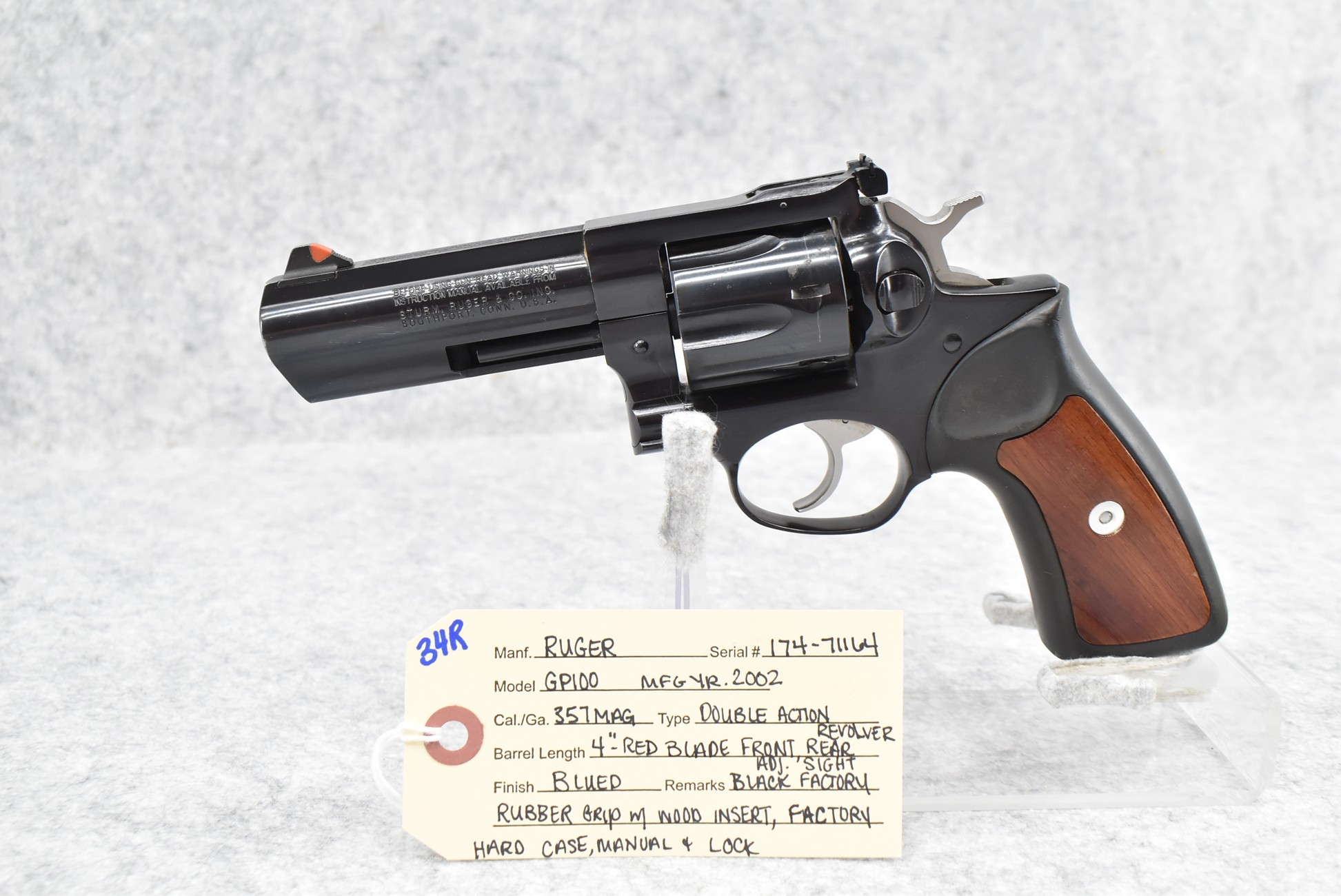 34R. Ruger – Mod. GP100 – 357 Mag. Cal. Double Action Revolver – w/4” Barrel w/Red Blade Front and Adjustable Rear Sights – Blued Finish – w/Factory Black Rubber Grip w/Wood Insert – Manufactured 2002 – w/Hard Case and Manual