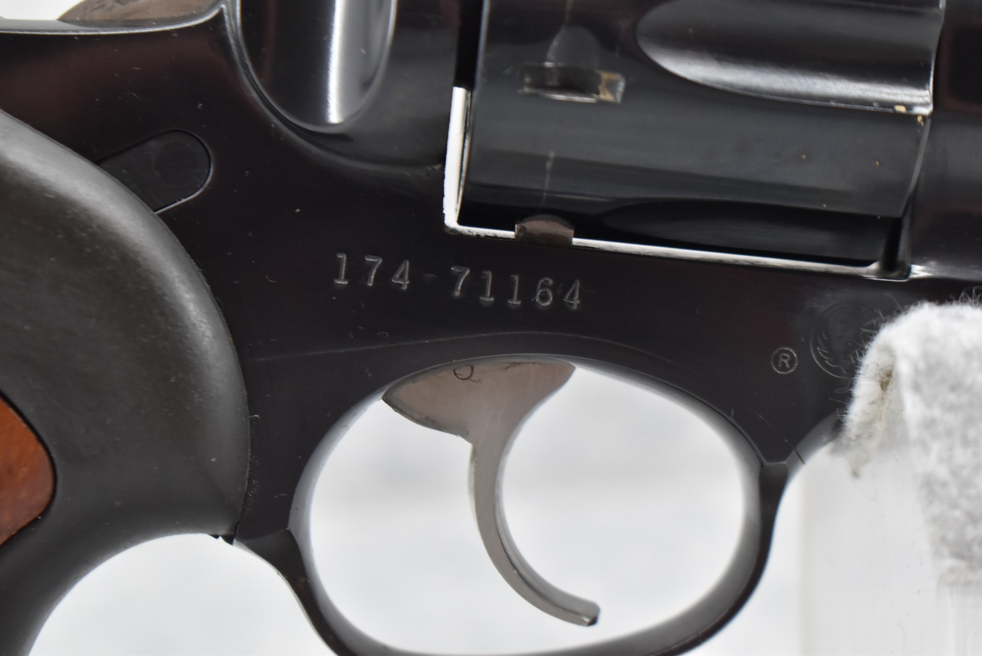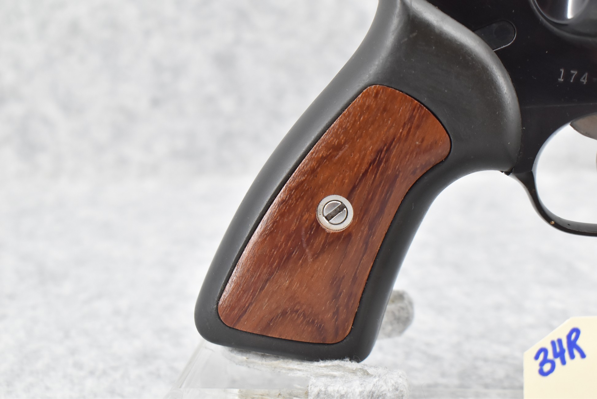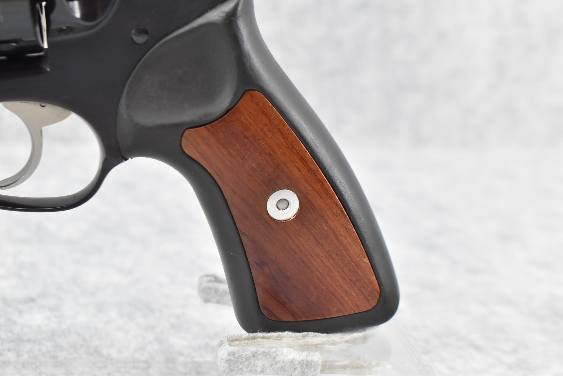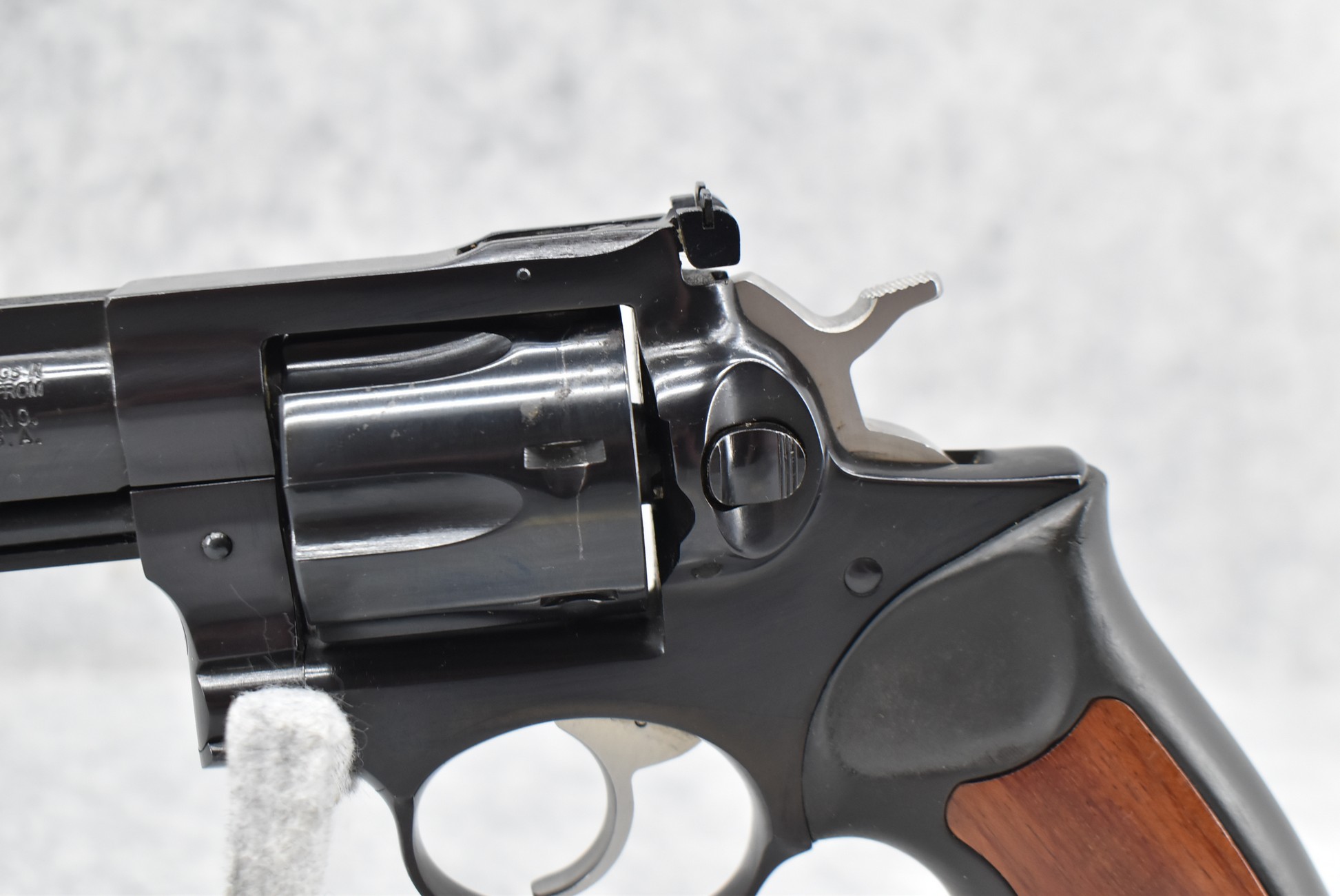 34R. Ruger – Mod. GP100 – 357 Mag. Cal. Double Action Revolver – w/4” Barrel w/Red Blade Front and Adjustable Rear Sights – Blued Finish – w/Factory Black Rubber Grip w/Wood Insert – Manufactured 2002 – w/Hard Case and Manual