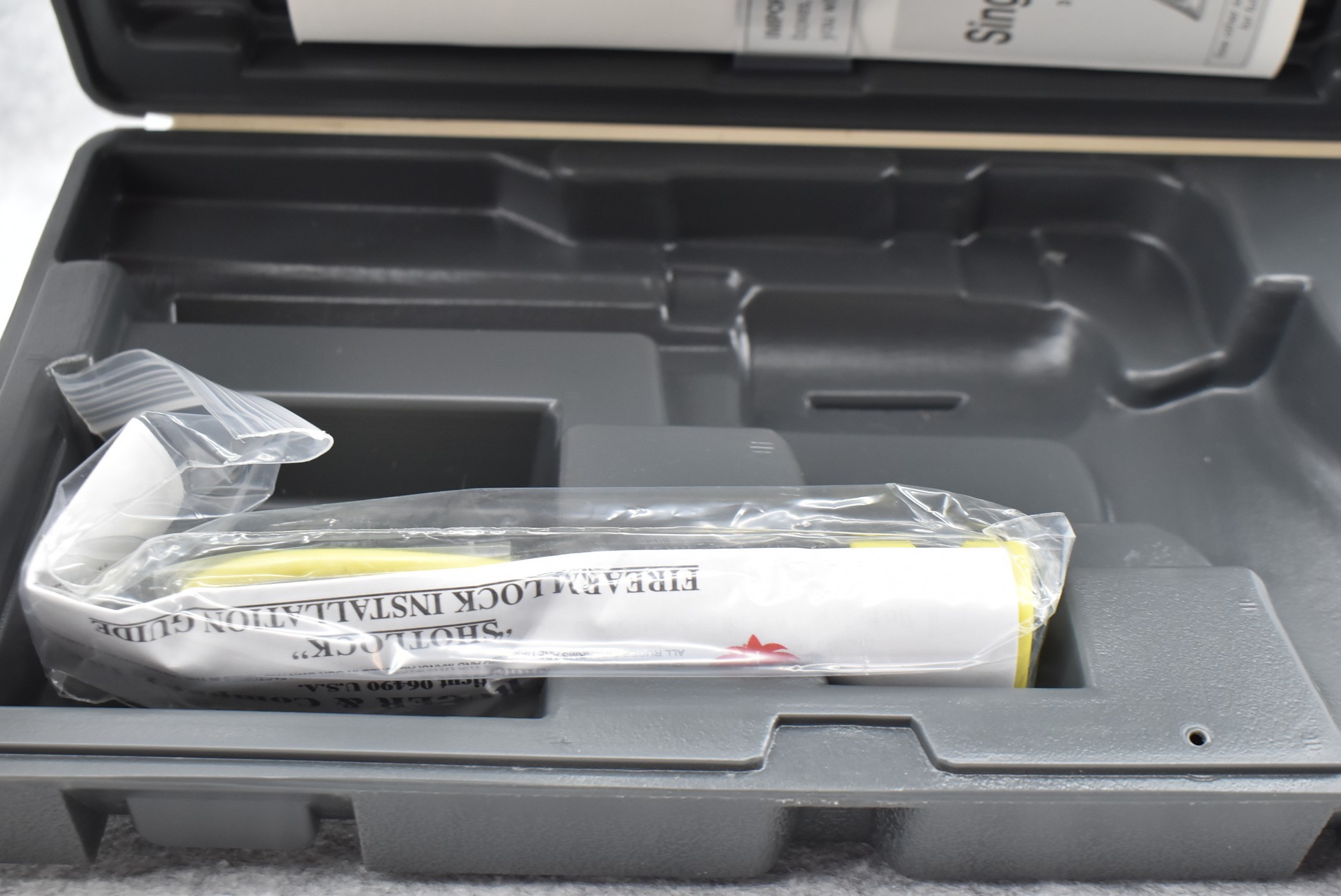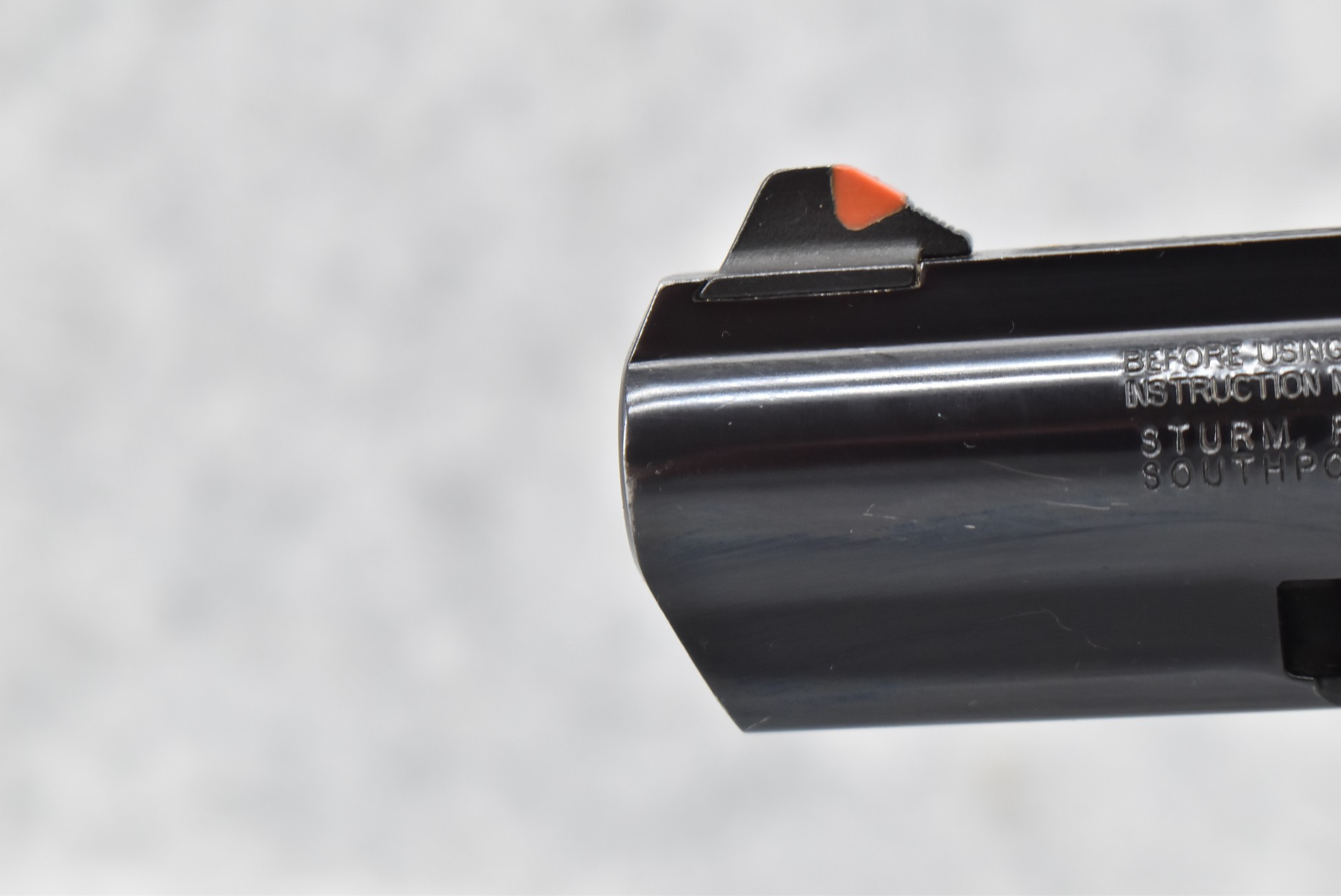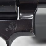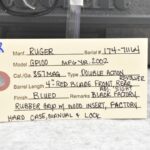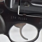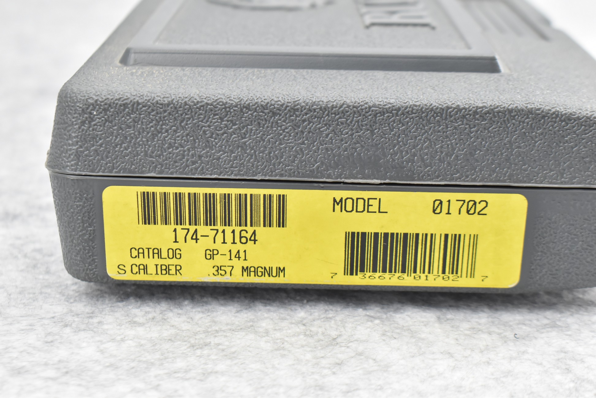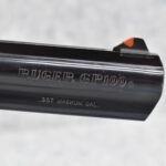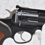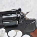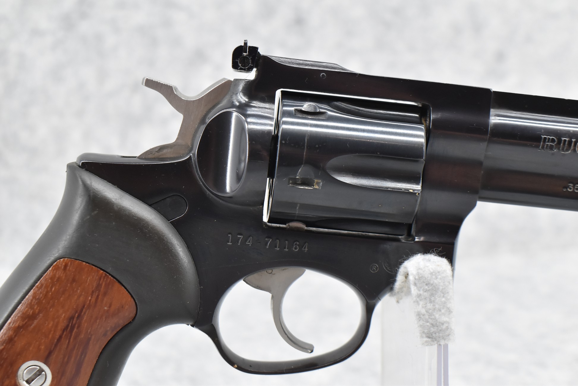 34R. Ruger – Mod. GP100 – 357 Mag. Cal. Double Action Revolver – w/4” Barrel w/Red Blade Front and Adjustable Rear Sights – Blued Finish – w/Factory Black Rubber Grip w/Wood Insert – Manufactured 2002 – w/Hard Case and Manual