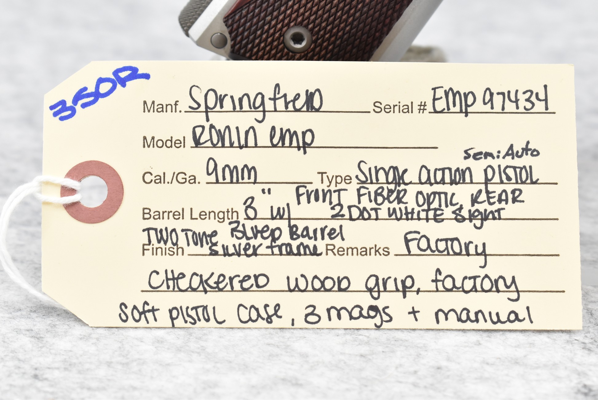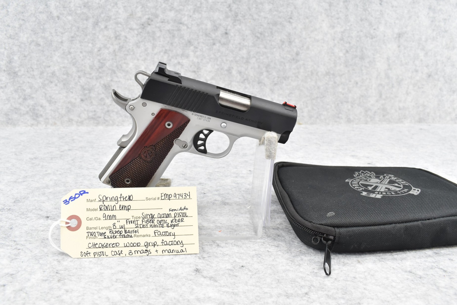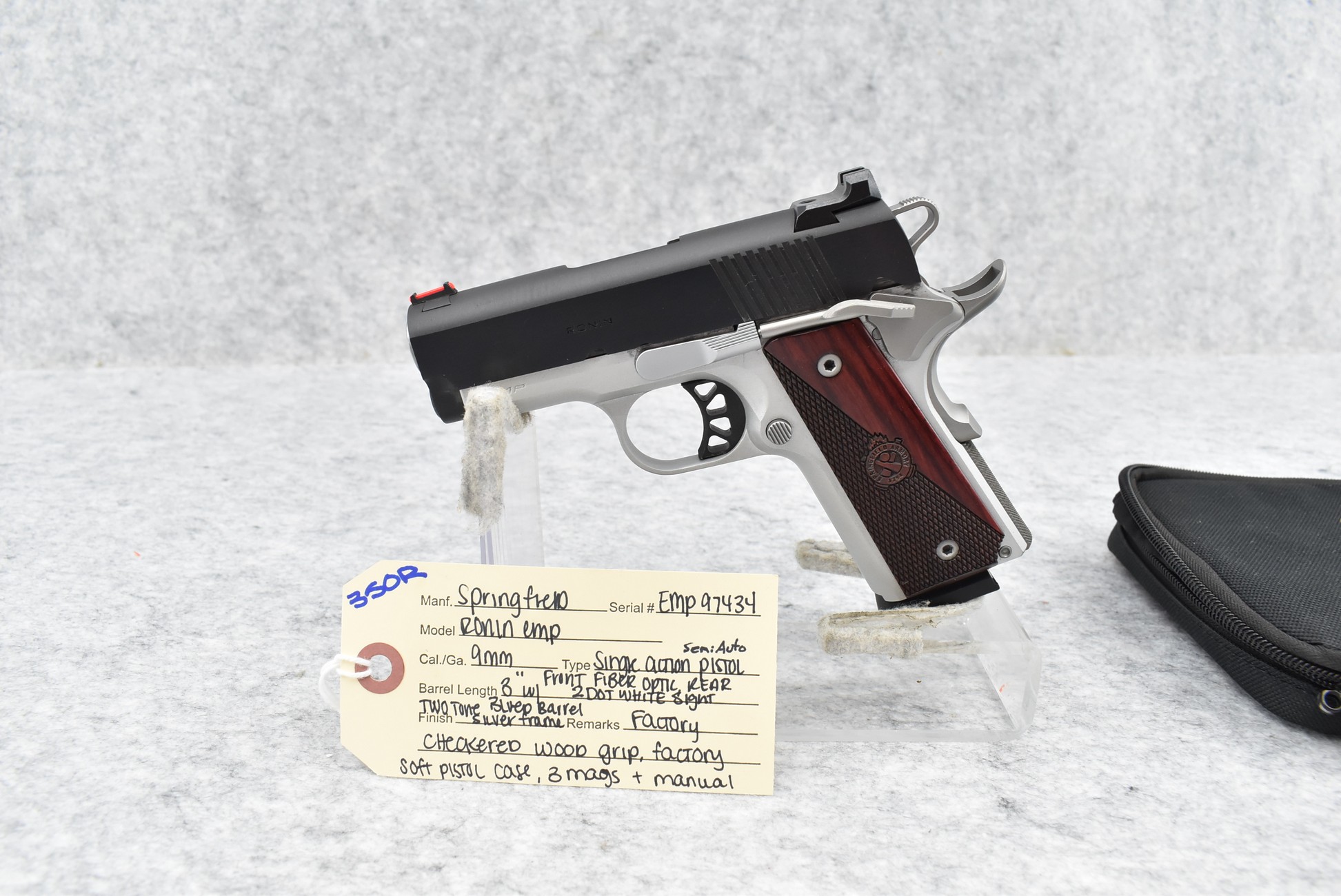 350R. Springfield – Mod. Ronin “EMP” – 9mm Cal. Semi-Auto Pistol – w/3” Barrel w/Front Fiber Optic & Rear 2-Dot White Sights – Blued/Silver Two-Tone Finish – w/Factory Checkered Wood Grip – w/3 Mags – w/Factory Soft Pistol Case & Manual