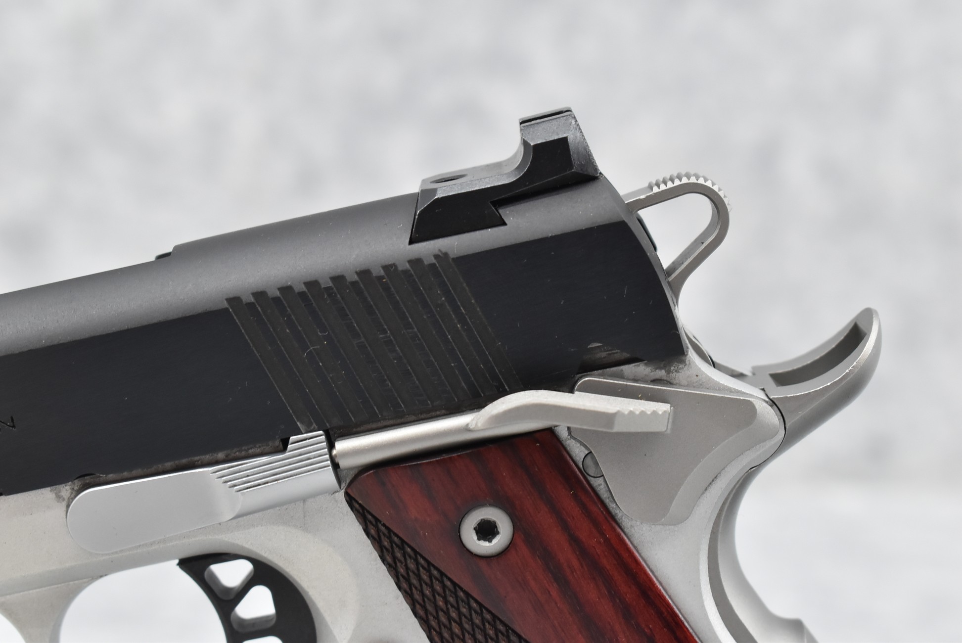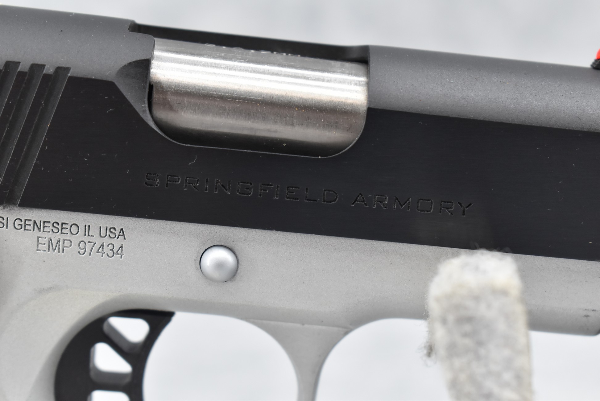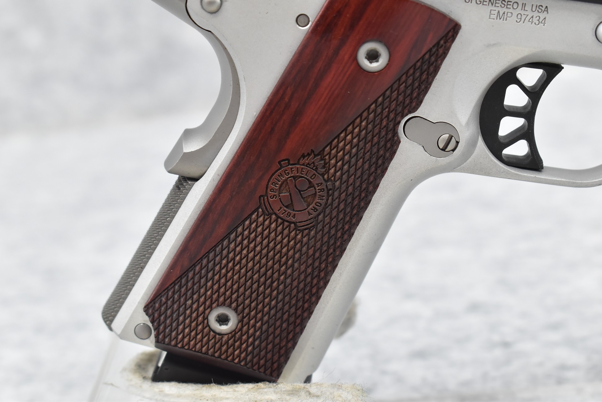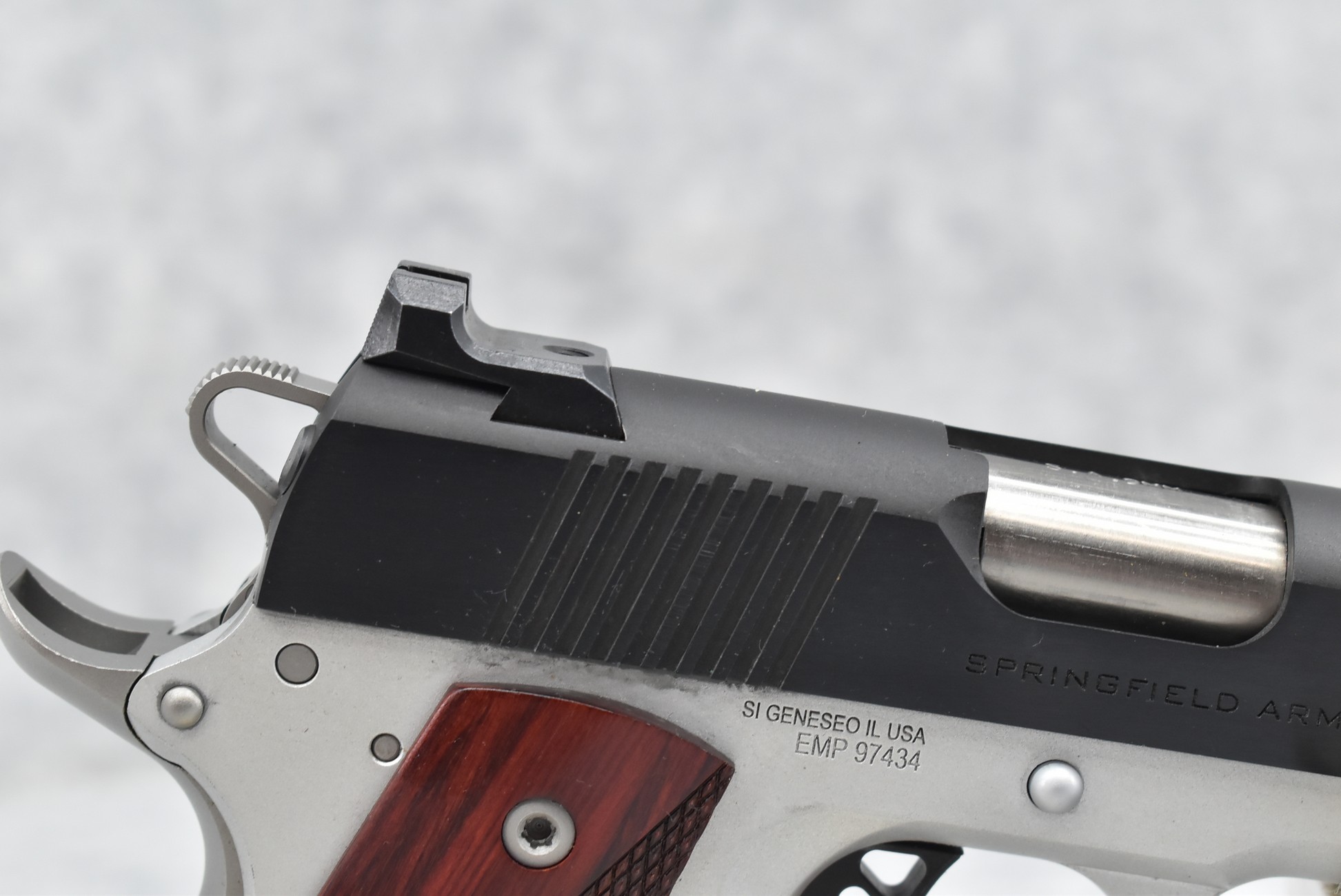 350R. Springfield – Mod. Ronin “EMP” – 9mm Cal. Semi-Auto Pistol – w/3” Barrel w/Front Fiber Optic & Rear 2-Dot White Sights – Blued/Silver Two-Tone Finish – w/Factory Checkered Wood Grip – w/3 Mags – w/Factory Soft Pistol Case & Manual