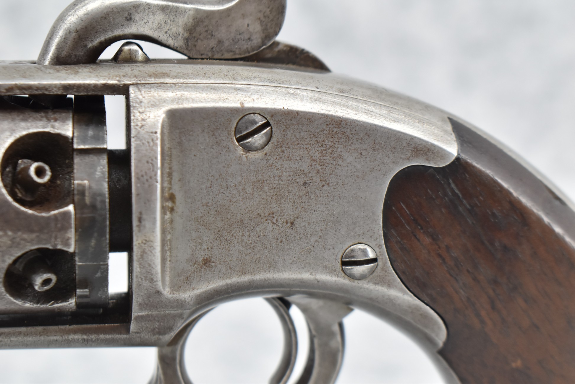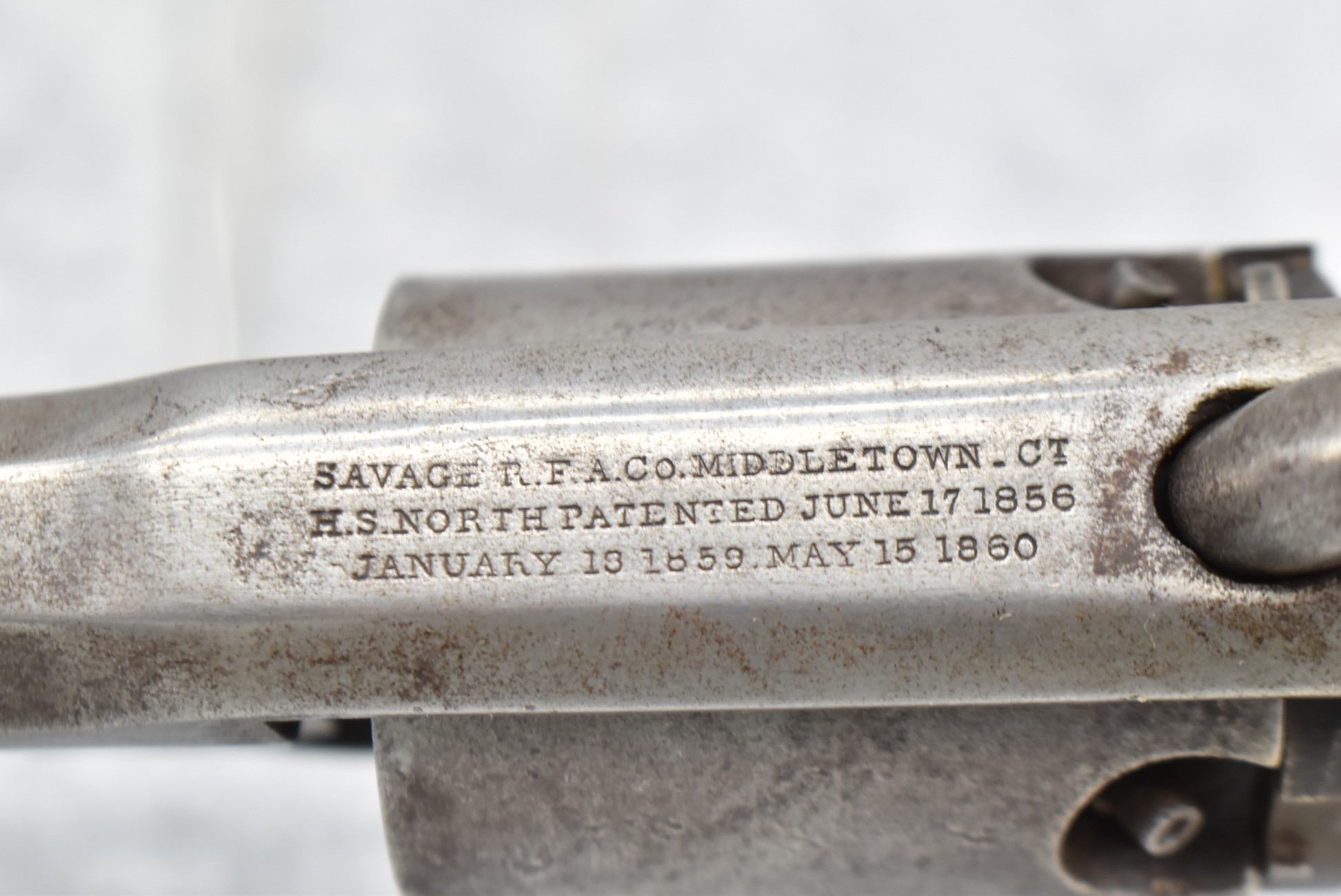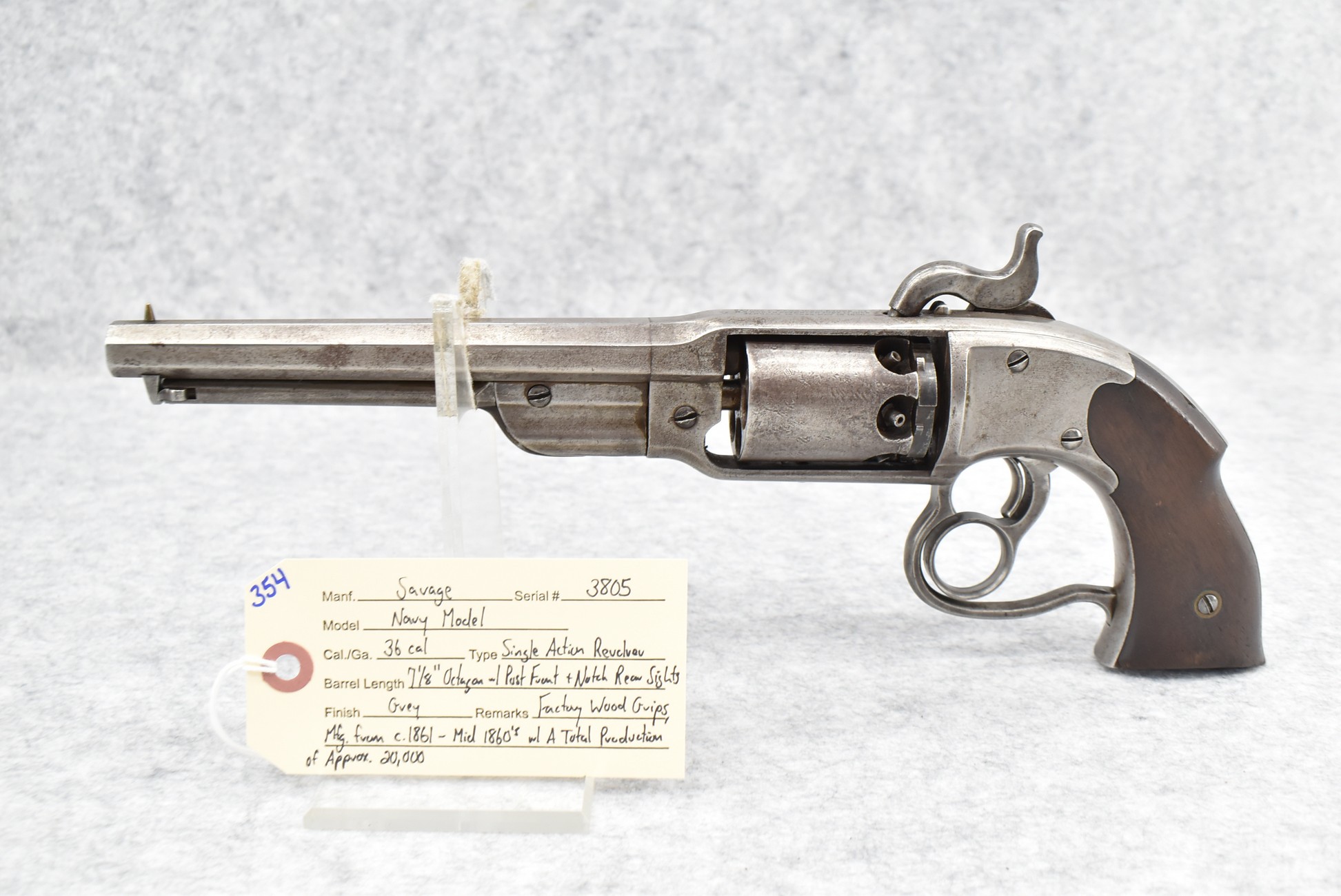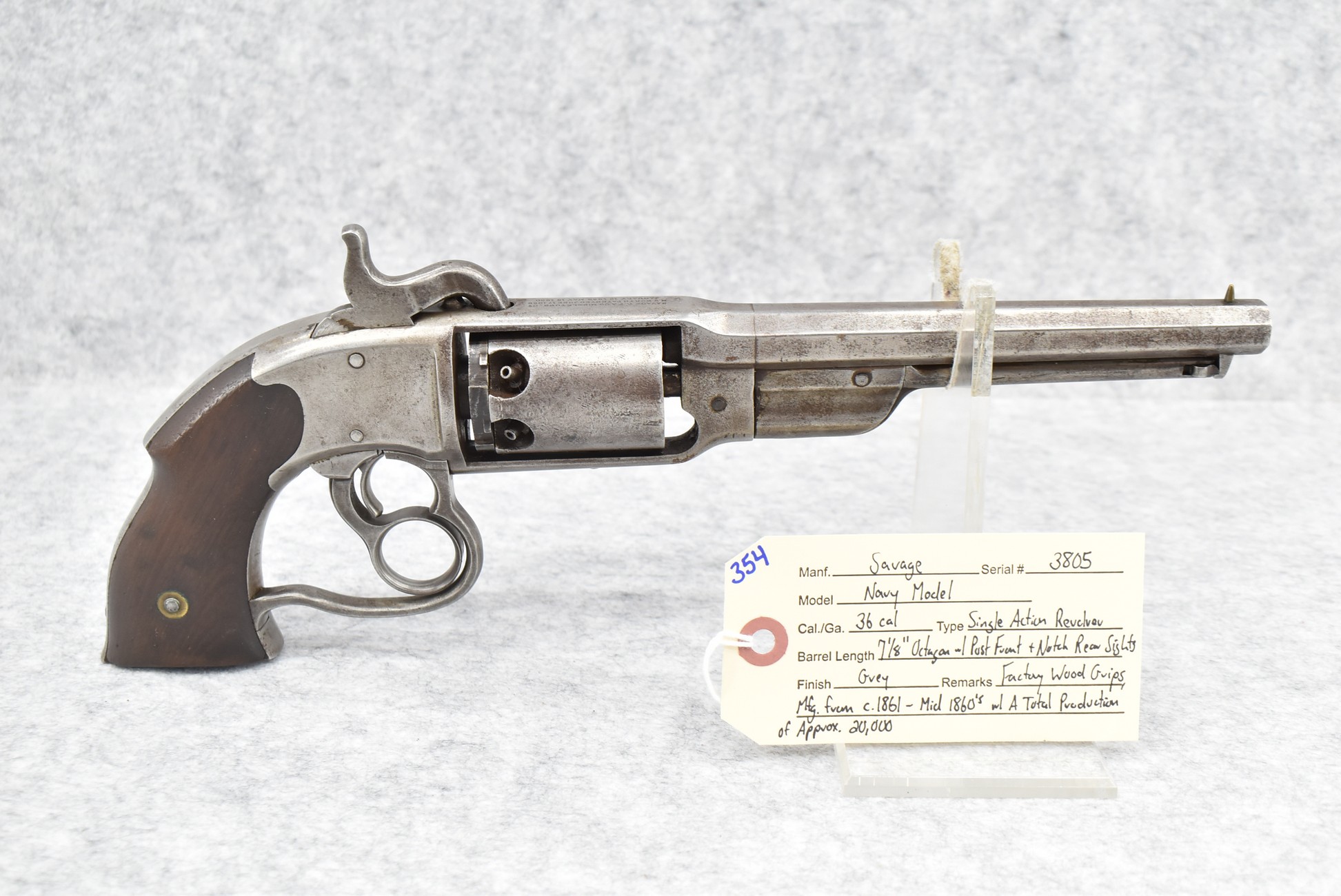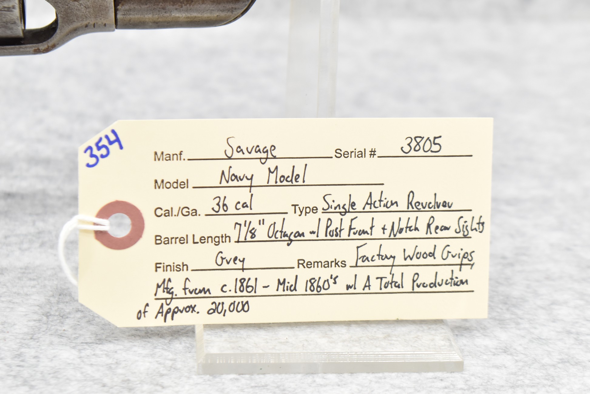 354. Savage – Navy Model – 36 Cal. Single Action Revolver – w/7 1/8” Octagon Barrel w/Post Front & Notch Rear Sights – Gray Finish – w/Factory Wood Grips – Total Production of Approx. 20,000 Between 1861-1860s