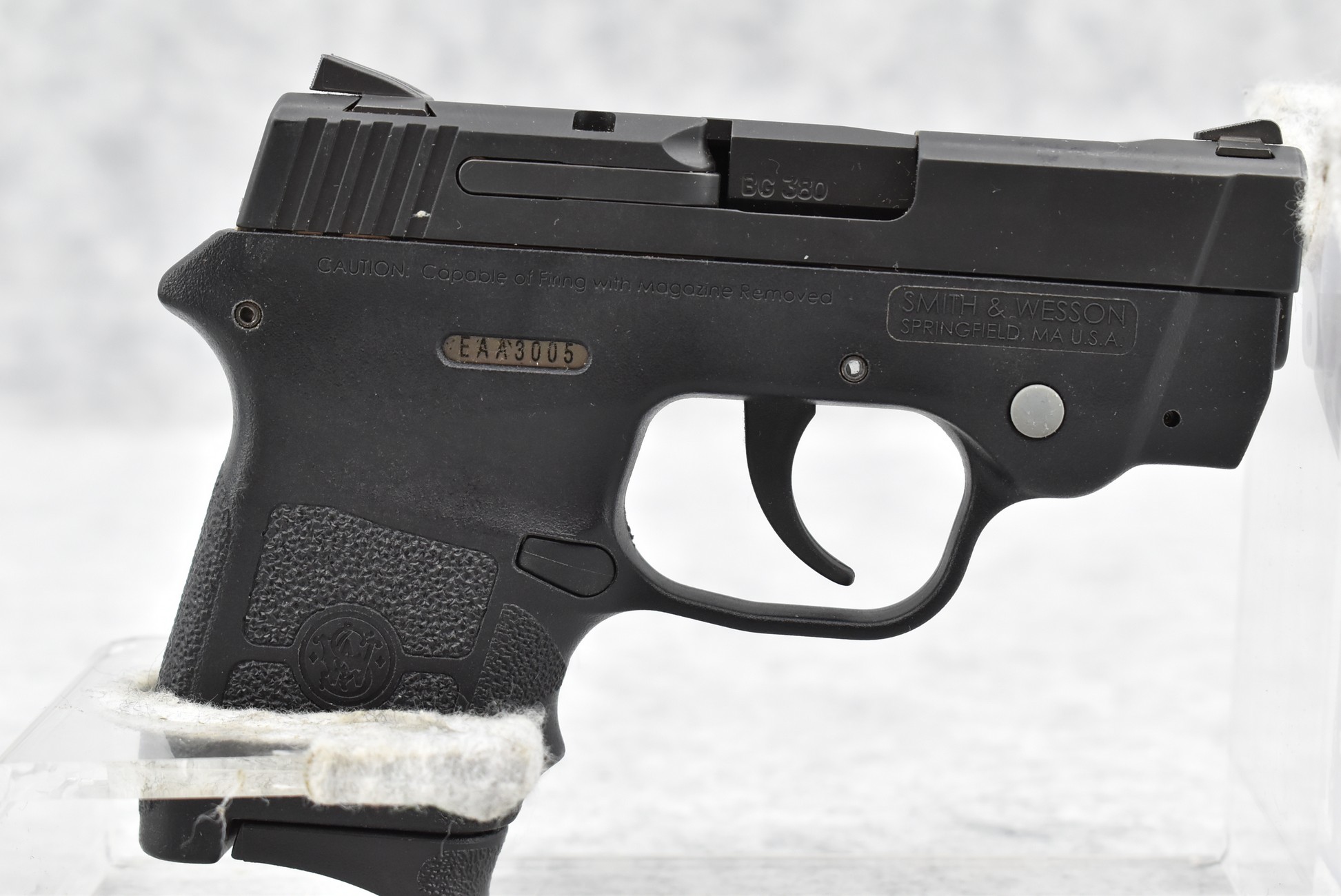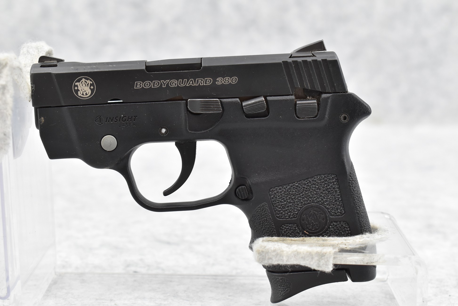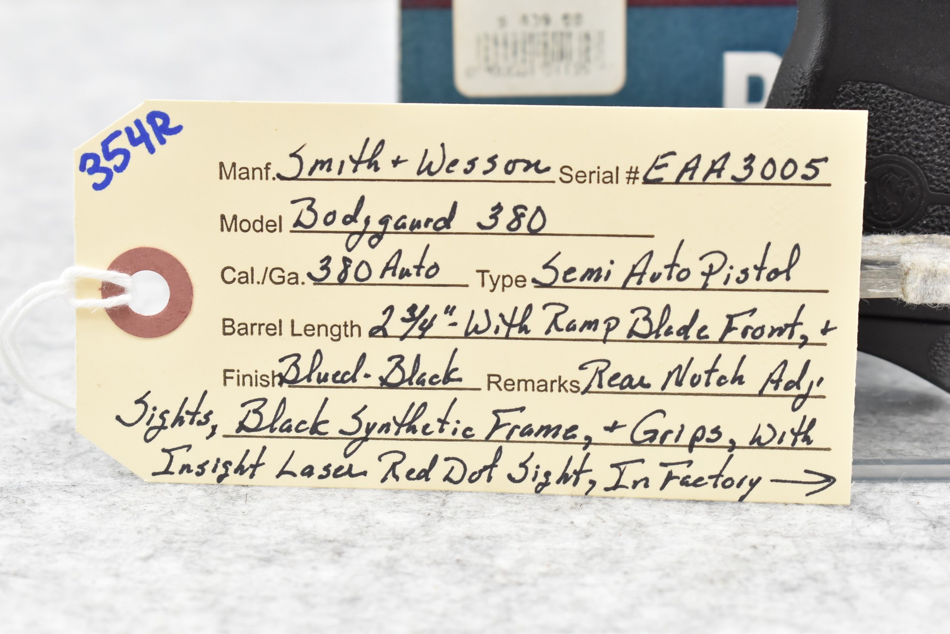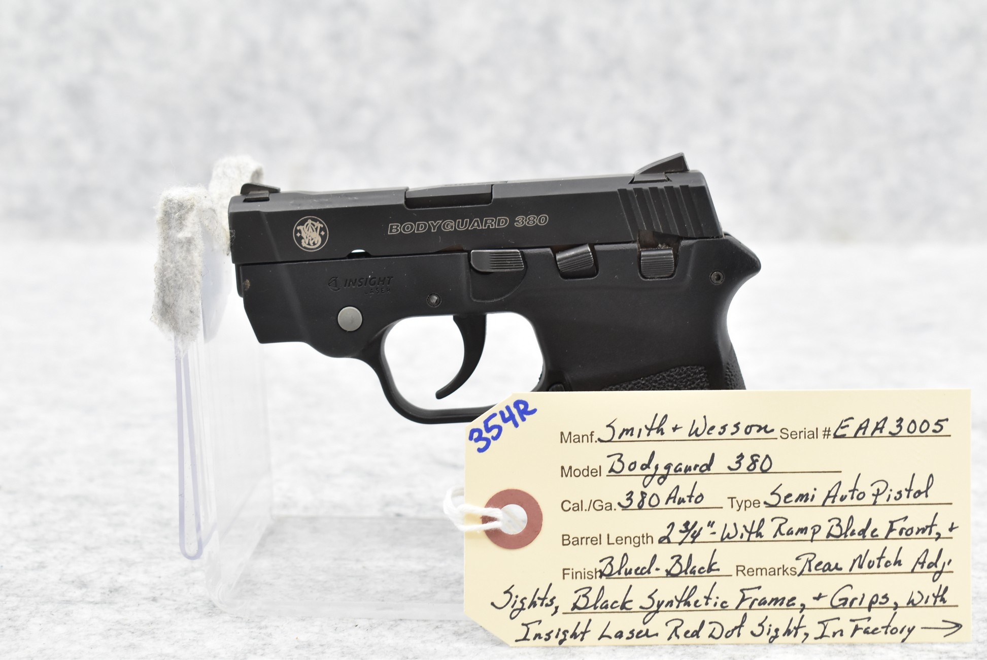 354R. Smith & Wesson – Mod. Bodyguard 380 – 380 Auto Cal. Semi-Auto Pistol – w/2 ¾” Barrel w/Ramp Blade Front & Rear Notch Adj. Sights – Blued Finish – w/Black Synthetic Frame & Grips – w/Insight Laser Red Dot Sight – w/Factory Box, Soft Case & Accessories