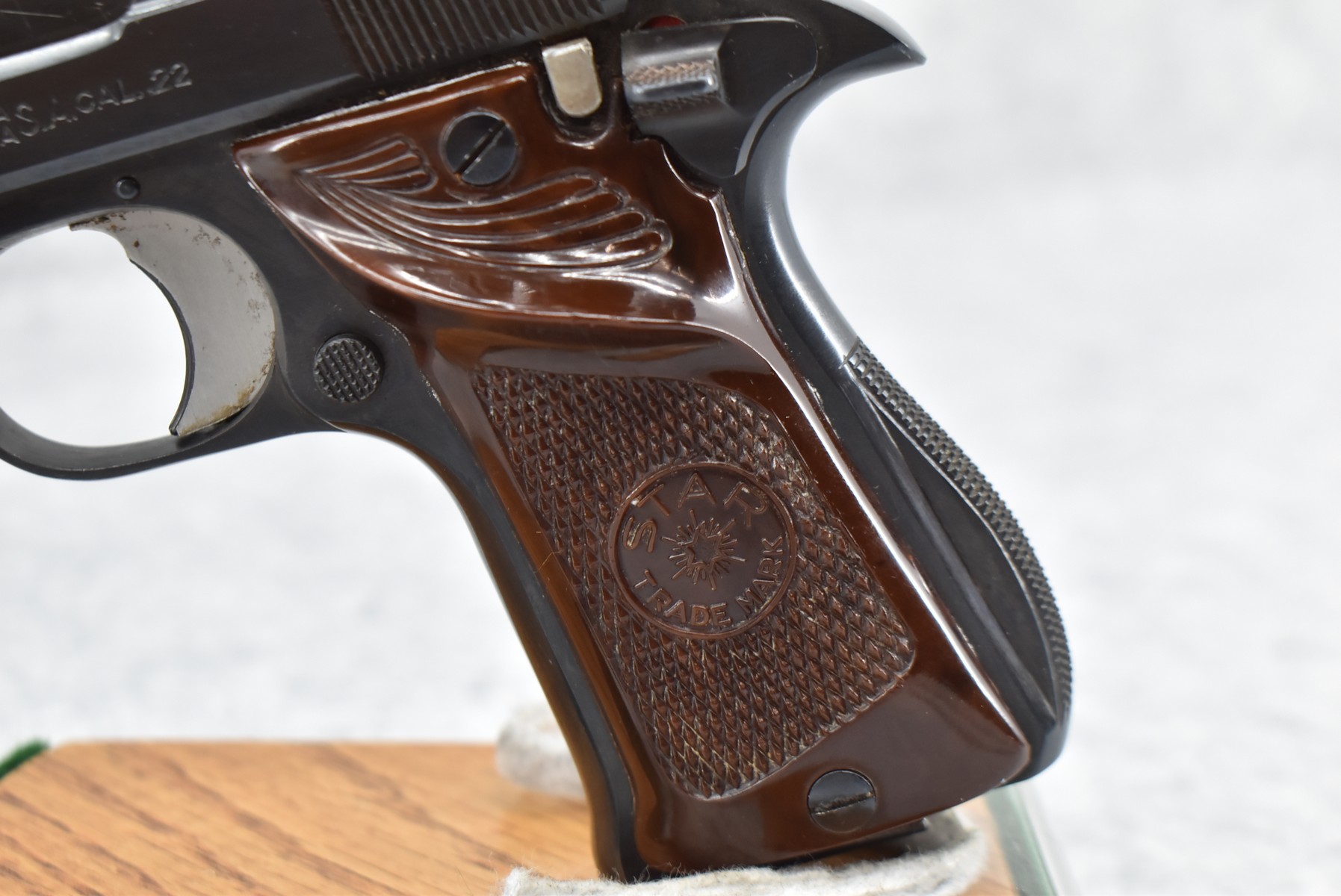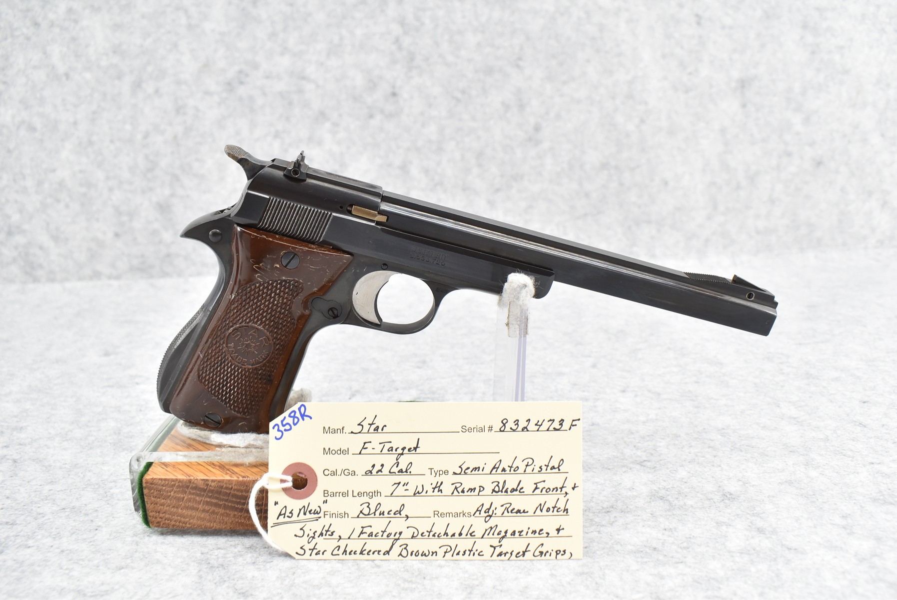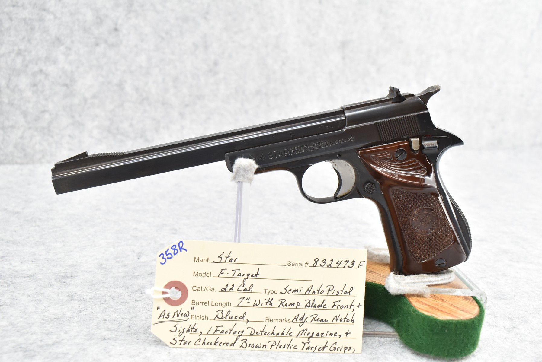 358R. Star – Mod. F-Target – 22 Cal. Semi-Auto Pistol – w/7” Barrel w/Ramp Blade Front and Adjustable Rear Notch Sights – Blued Finish – w/Star Checkered Brown Plastic Target Grips – w/1 Factory Detachable Magazine – As New