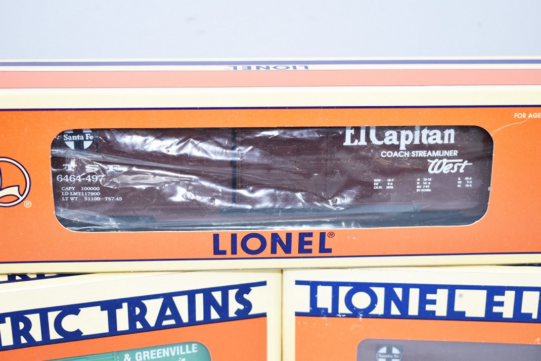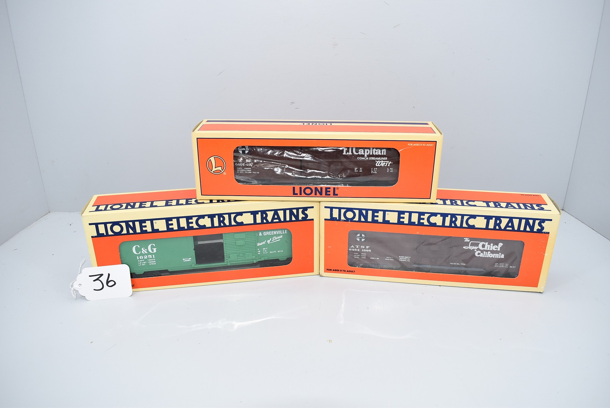 36. Lot of 3 Lionel O-Gauge Box Cars – Including 646-497 ATSF Box Car 6-29202, T.T.O.S. Division Box Car 6-52058, and Columbus & Greenville Box Car 6-16251 – All w/Boxes