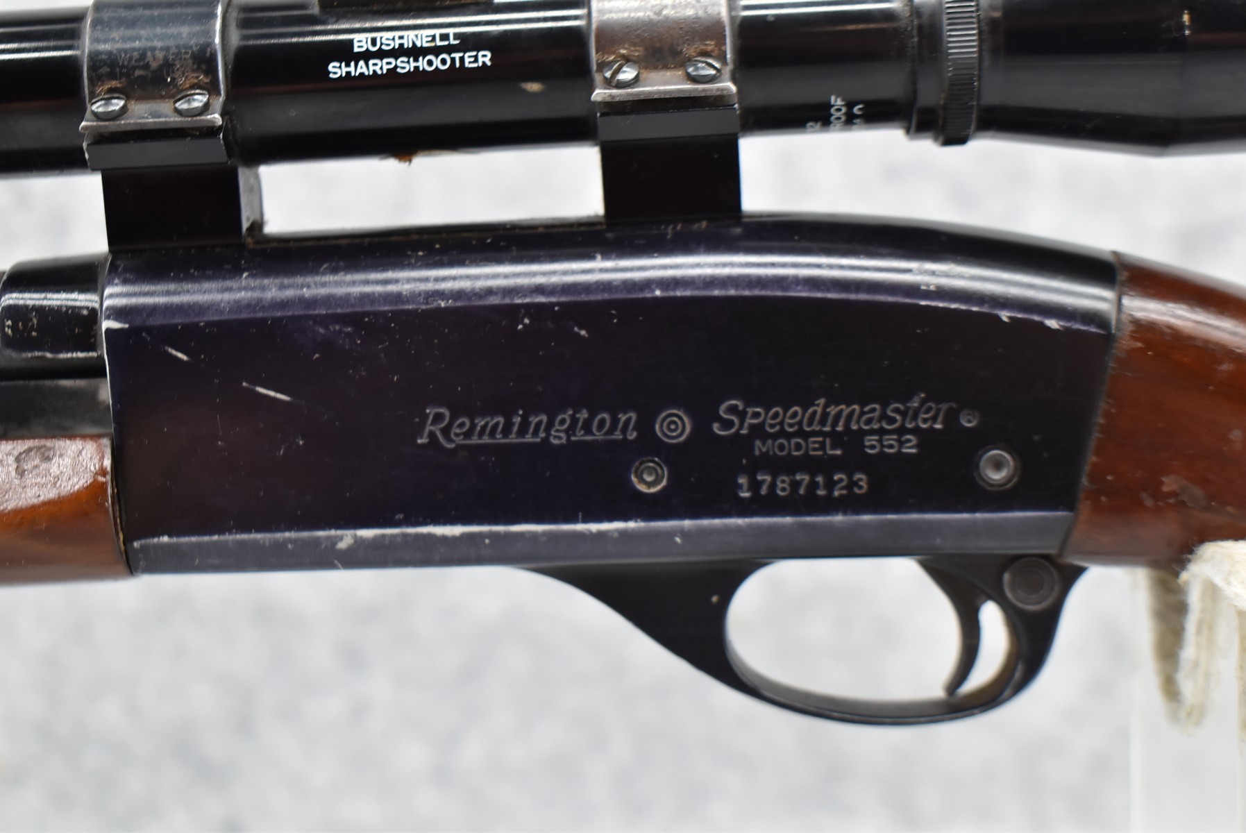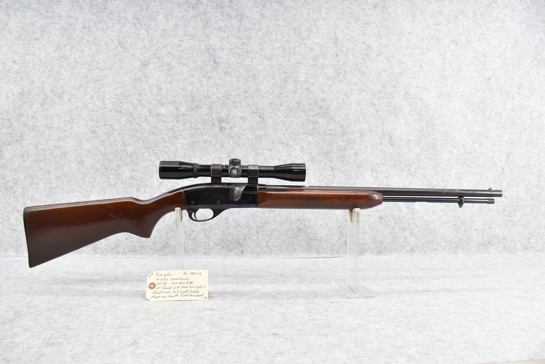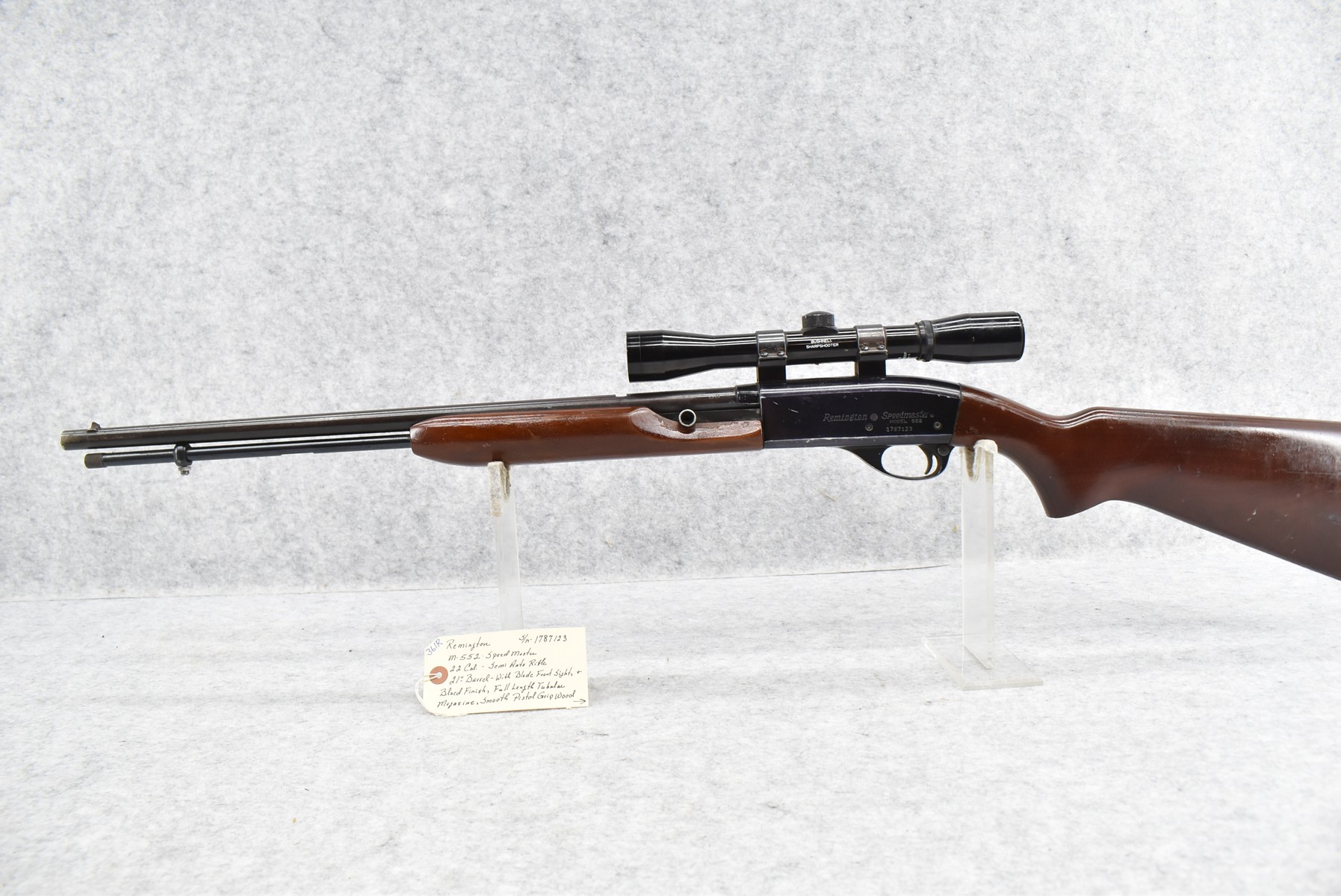 361R. Remington – Mod. 552 Speedmaster – 22 Cal. Semi-Auto Rifle – w/21” Barrel w/Blade Front Sight & Full Length Tubular Magazine – Blued Finish – w/Smooth Pistol Grip Wood Stocks w/Factory Butt Plate – w/Bushnell 4x32mm Sharp Shooter Scope & Weaver Rings