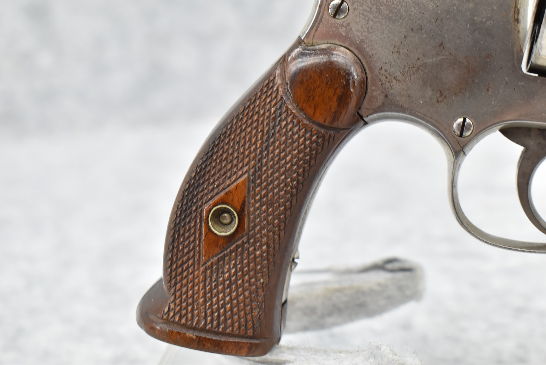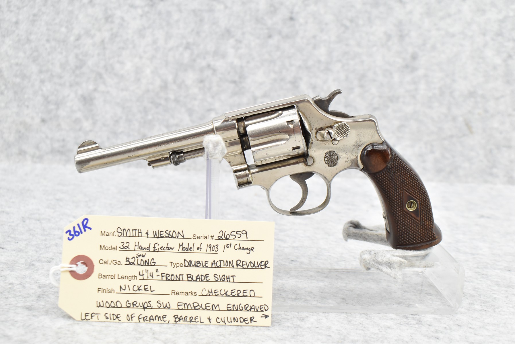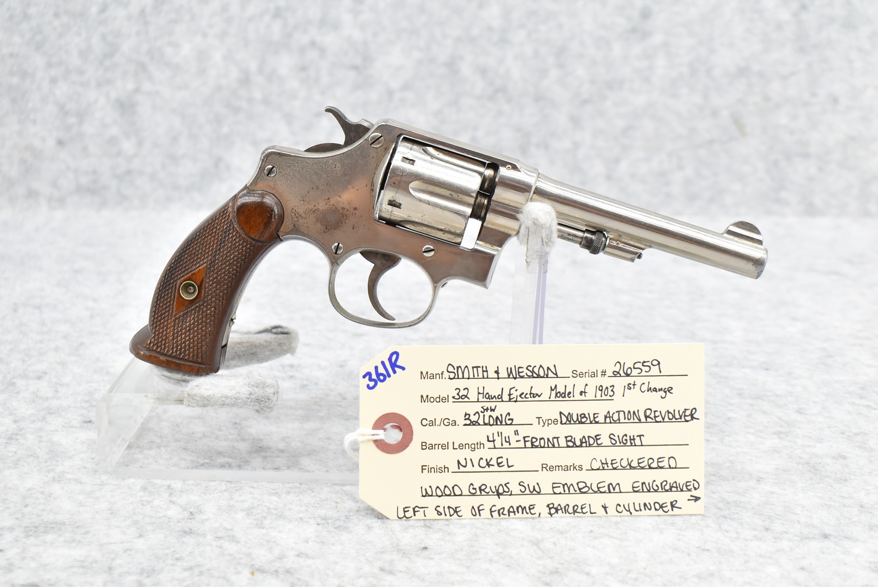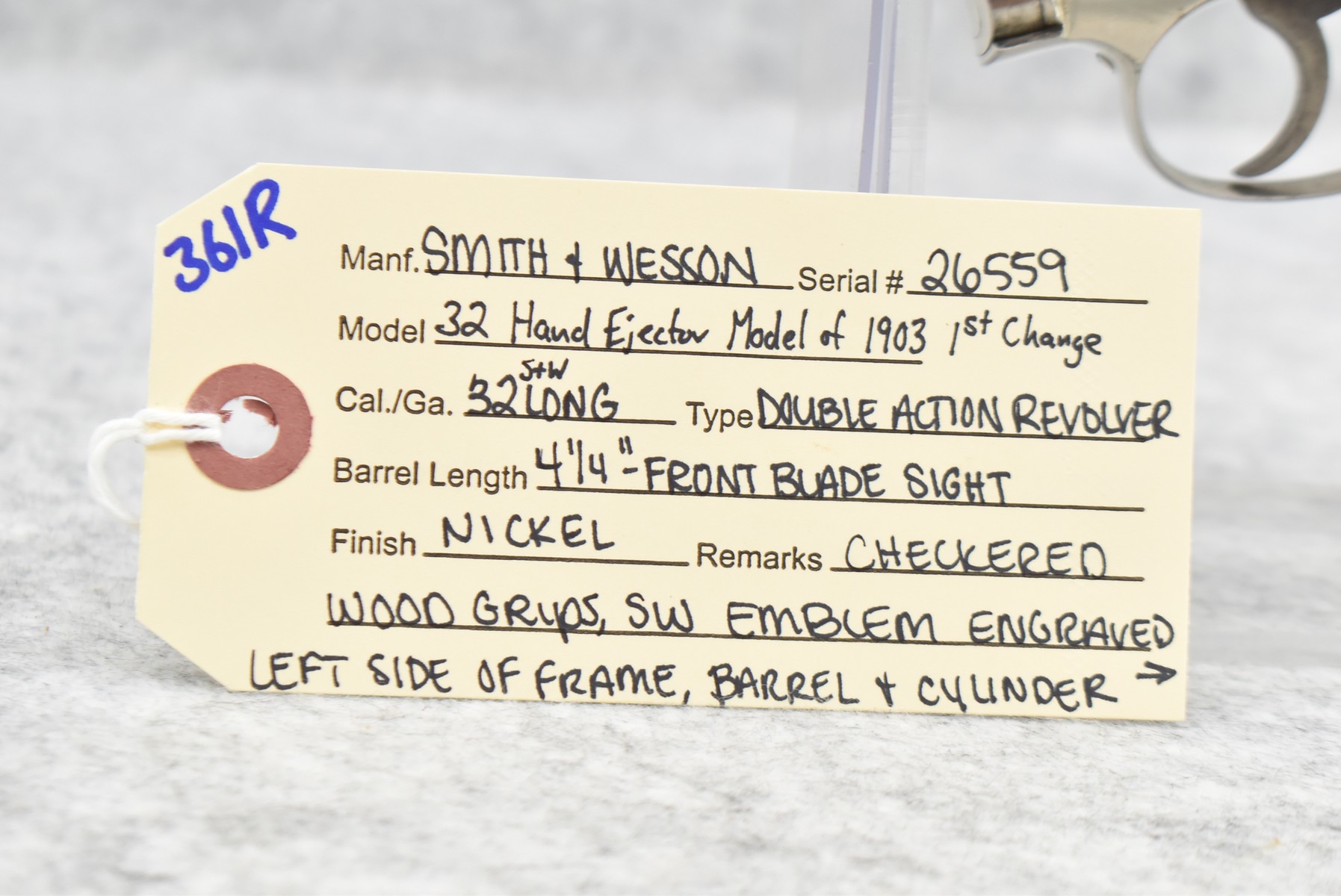361R. Smith & Wesson – Mod. 32 Hand Ejector Model of 1903 1st Change – 32 S&W Long Cal. Double Action Revolver – w/4 ¼” Barrel w/Front Blade Sight – Nickel Finish – w/Checkered Diamond Wood Grips – Barrel & Cylinder Match to Serial Number – 31,700 Mfg. in the 1st Change Between 1904-1906