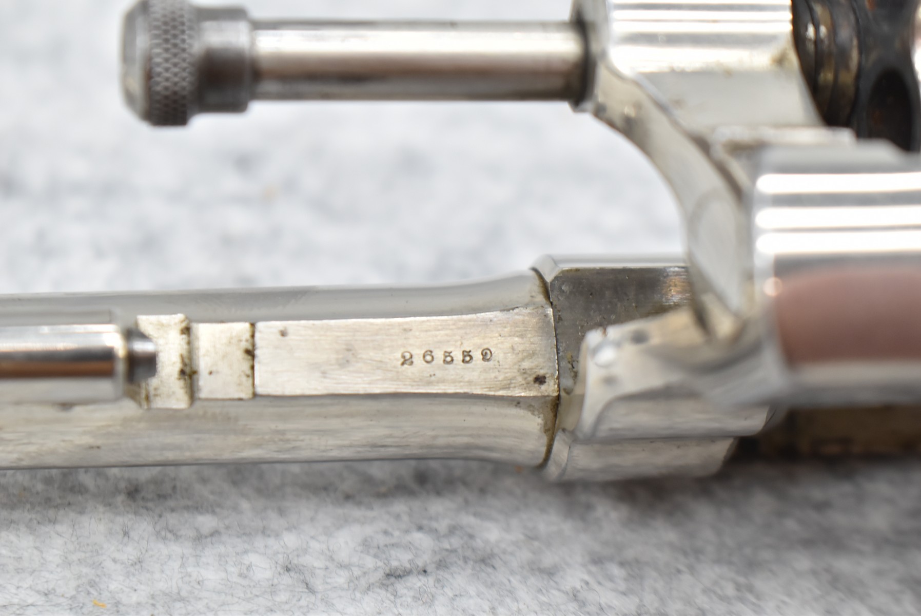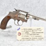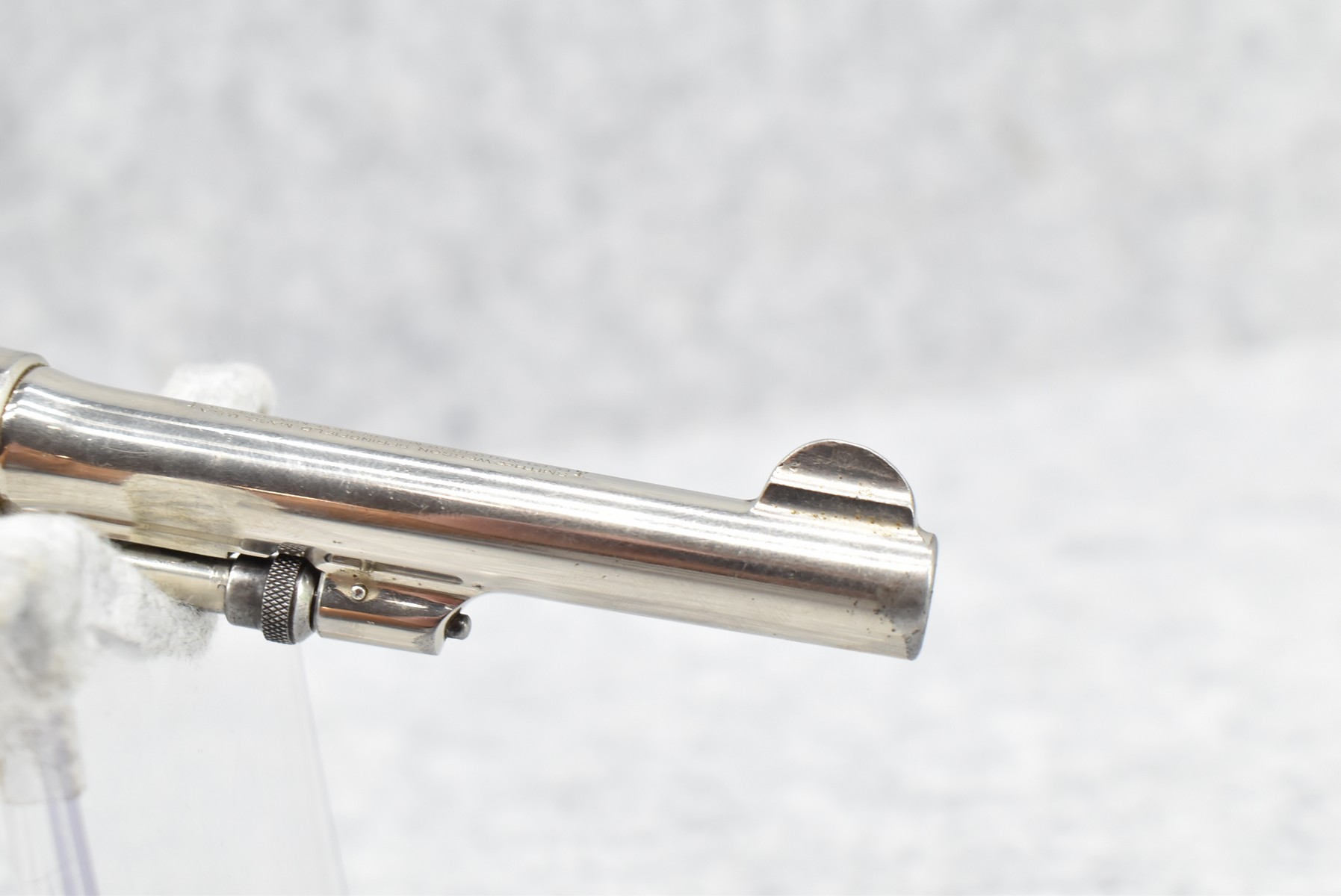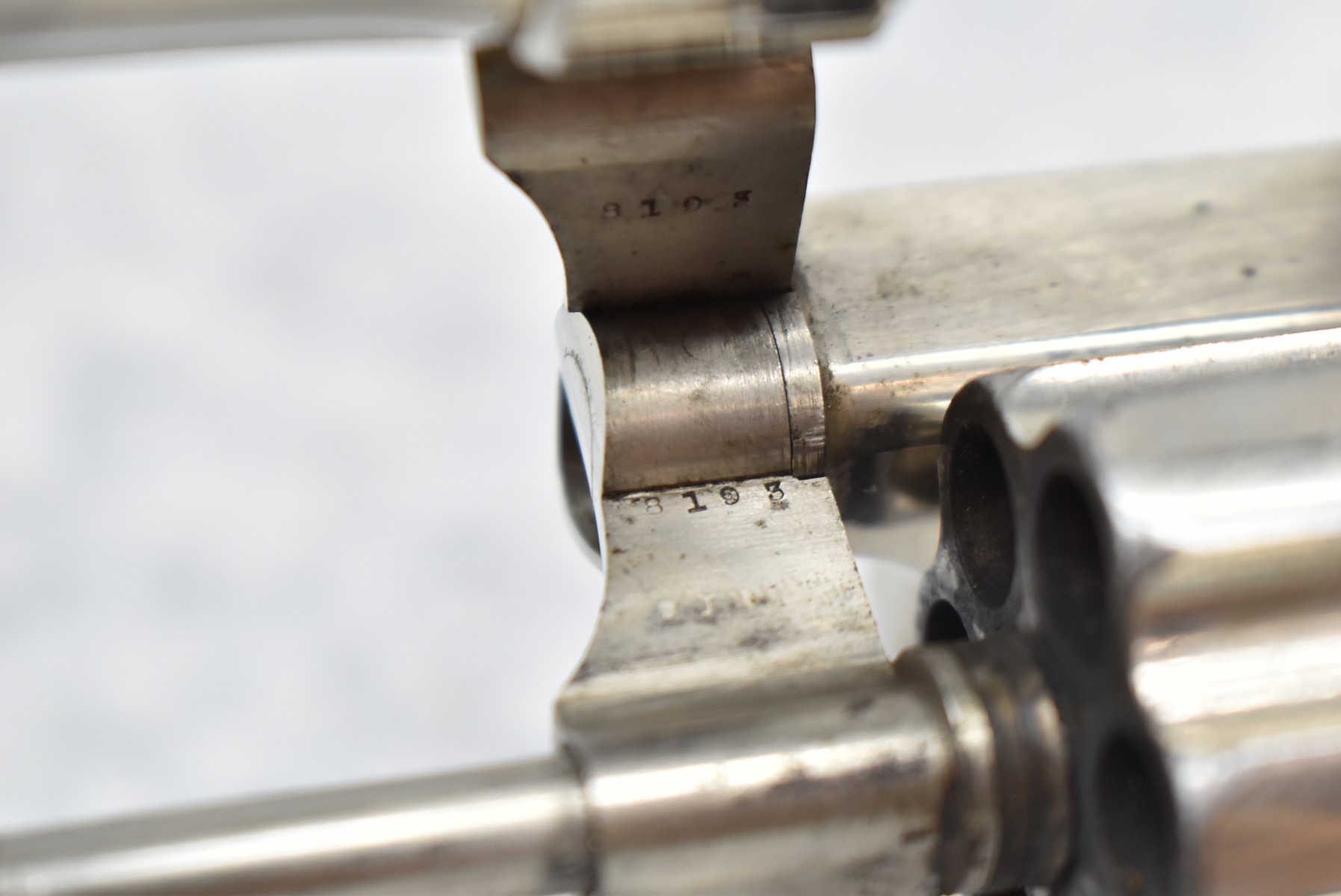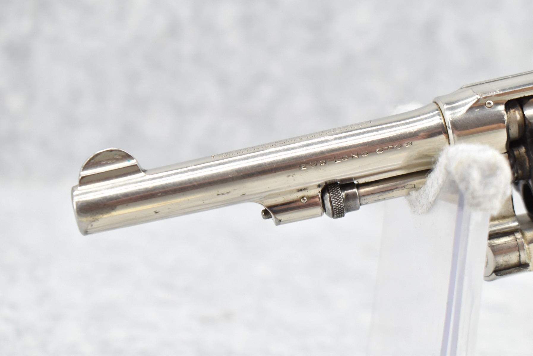 361R. Smith & Wesson – Mod. 32 Hand Ejector Model of 1903 1st Change – 32 S&W Long Cal. Double Action Revolver – w/4 ¼” Barrel w/Front Blade Sight – Nickel Finish – w/Checkered Diamond Wood Grips – Barrel & Cylinder Match to Serial Number – 31,700 Mfg. in the 1st Change Between 1904-1906