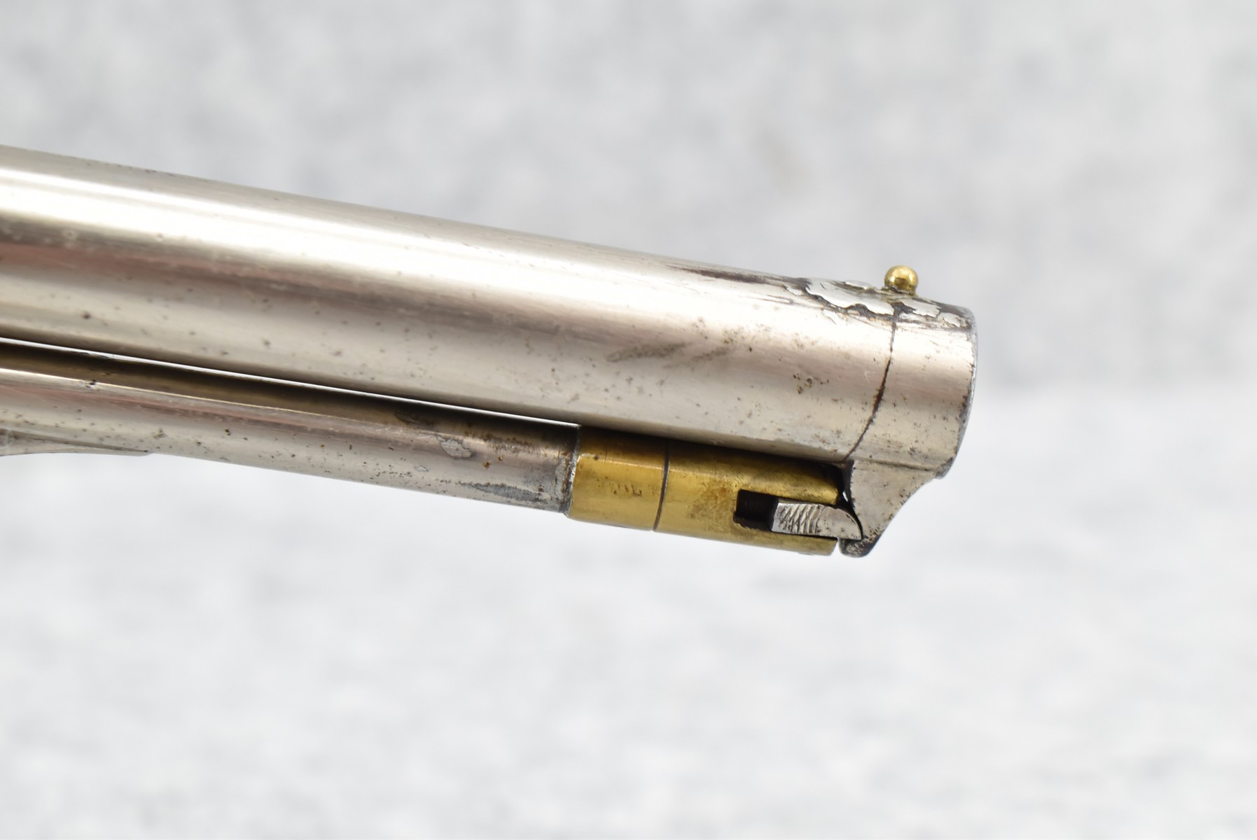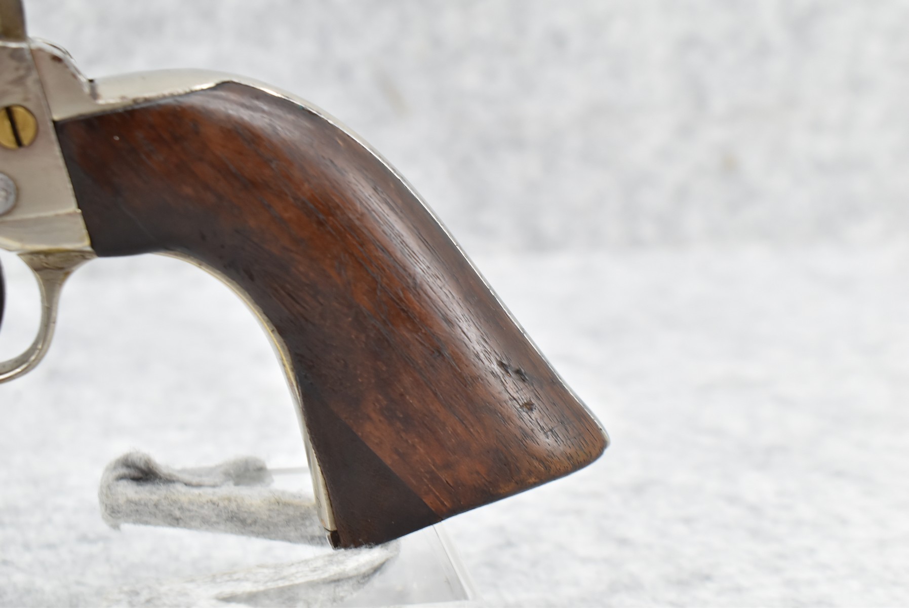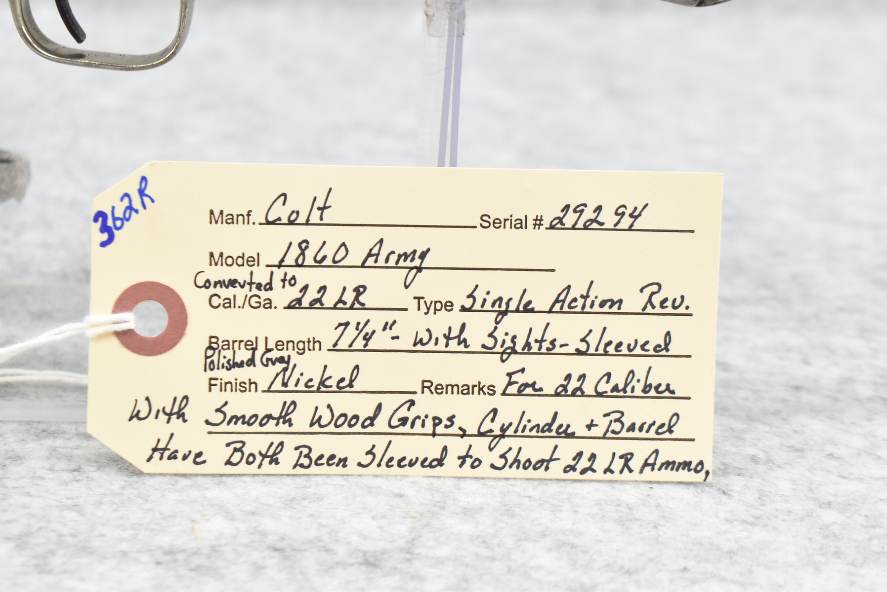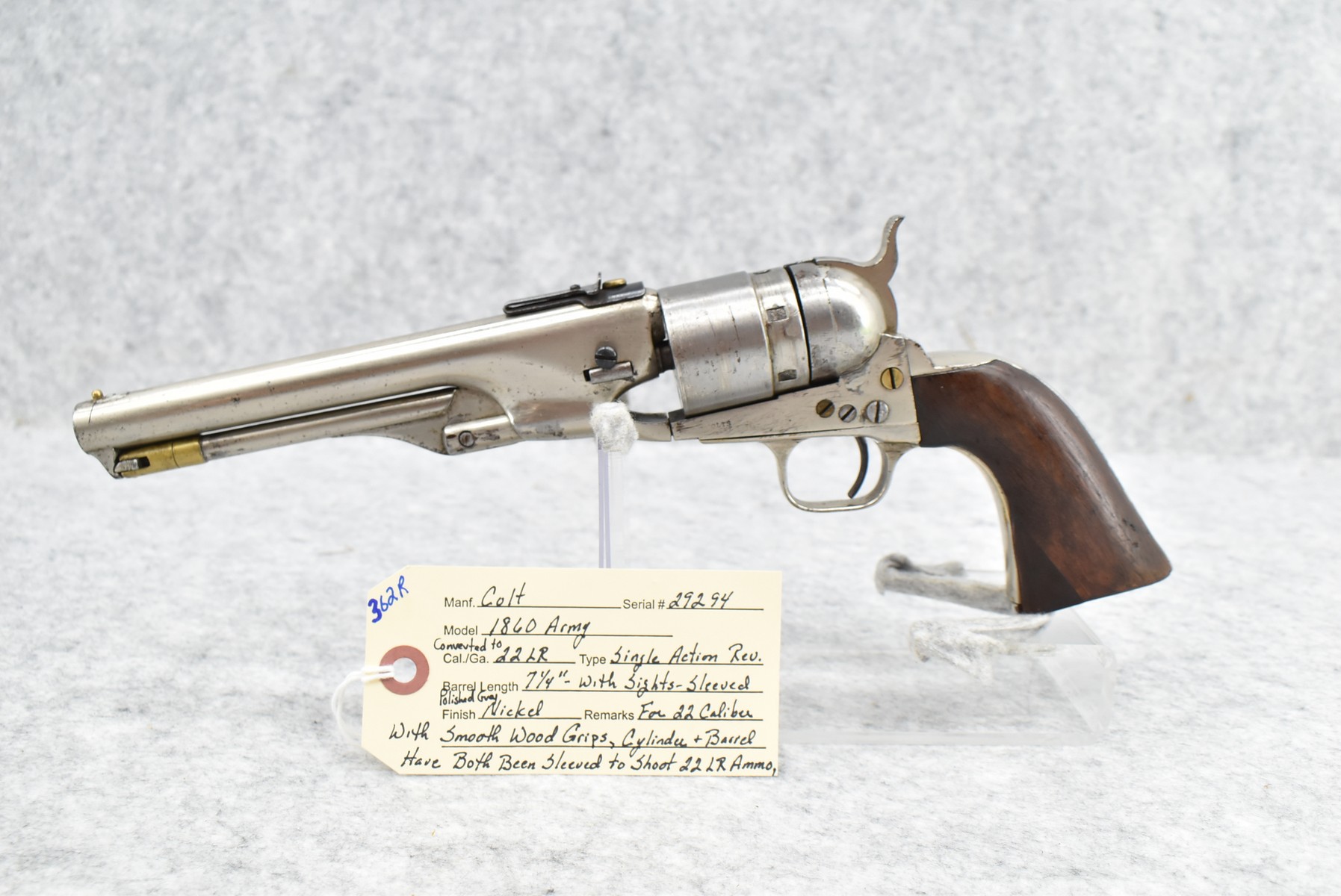 362R. Colt – Mod. 1860 Army – Converted to 22LR Cal. Single Action Revolver – w/7 ¼” Sleeved Barrel w/Sights – Polished Gray/Nickel Finish – w/Smooth Wood Grips – Cylinder & Barrel Have Both Been Sleeved to Shoot 22LR Ammo