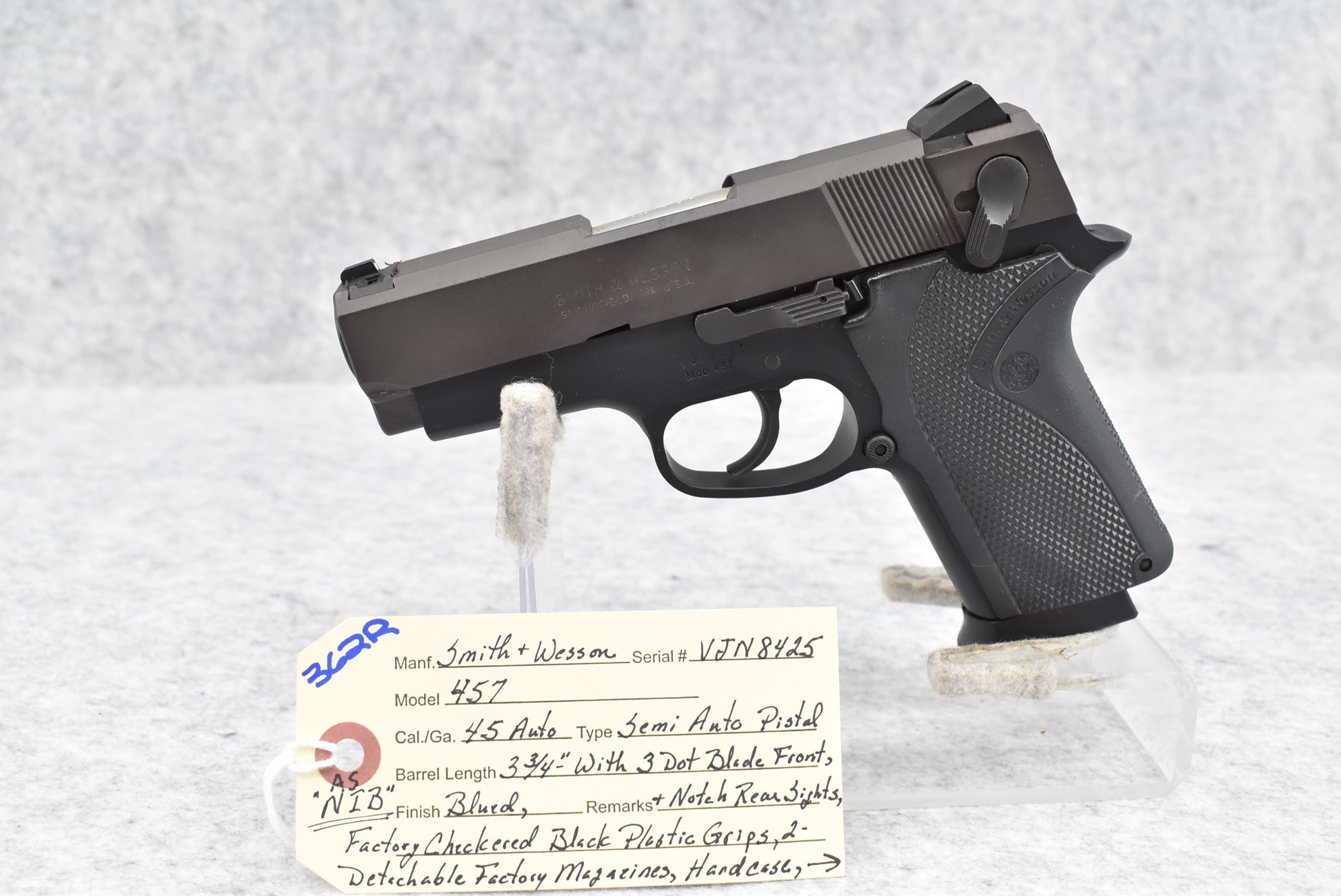 362R. Smith & Wesson – Mod. 457 – 45 Auto Cal. Semi-Auto Pistol – w/3 ¾” Barrel w/3-Dot Blade Front & Notch Rear Sights – Matte Blued Finish – w/Factory Grips – w/2 Factory Mags – w/Hard Case, Manuals & Accessories