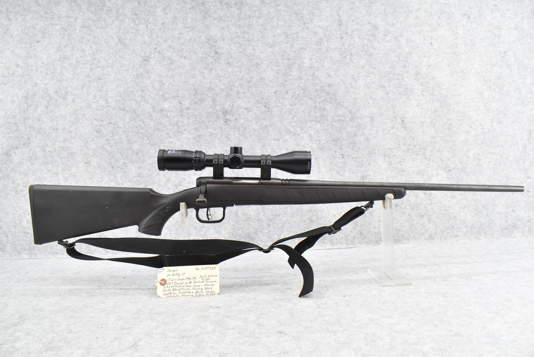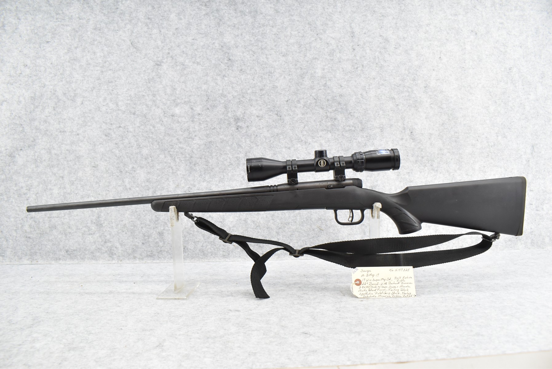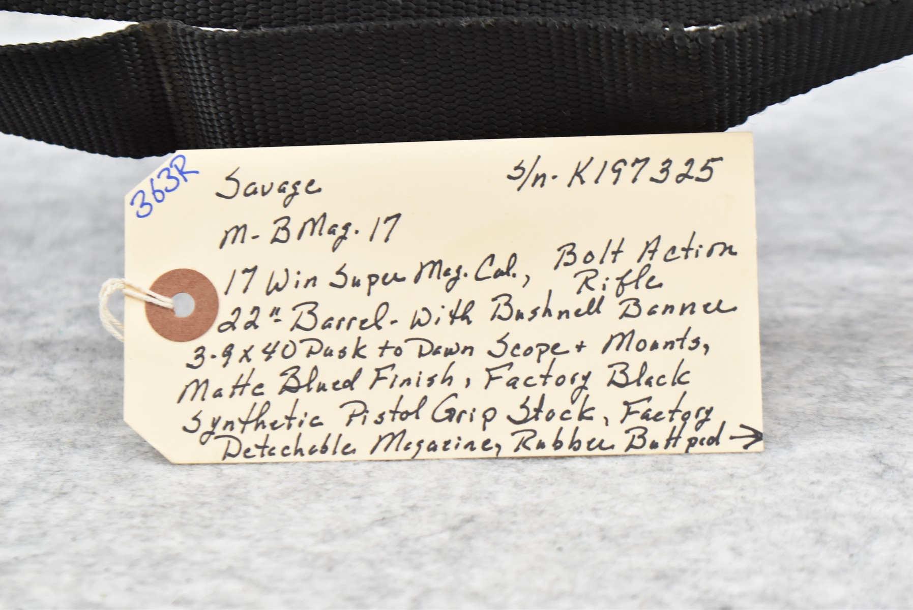 363R. Savage – Mod. B Mag-17 – 17 Win. Super Mag. Cal. Bolt Action Rifle – w/22” Barrel – Matte Blued Finish – w/Factory Synthetic Pistol Grip Stock w/Factory Butt Pad – w/Detachable Magazine – w/Nylon Sling – w/Bushnell Banner 3-9×40 Dusk to Dawn Scope & Mounts