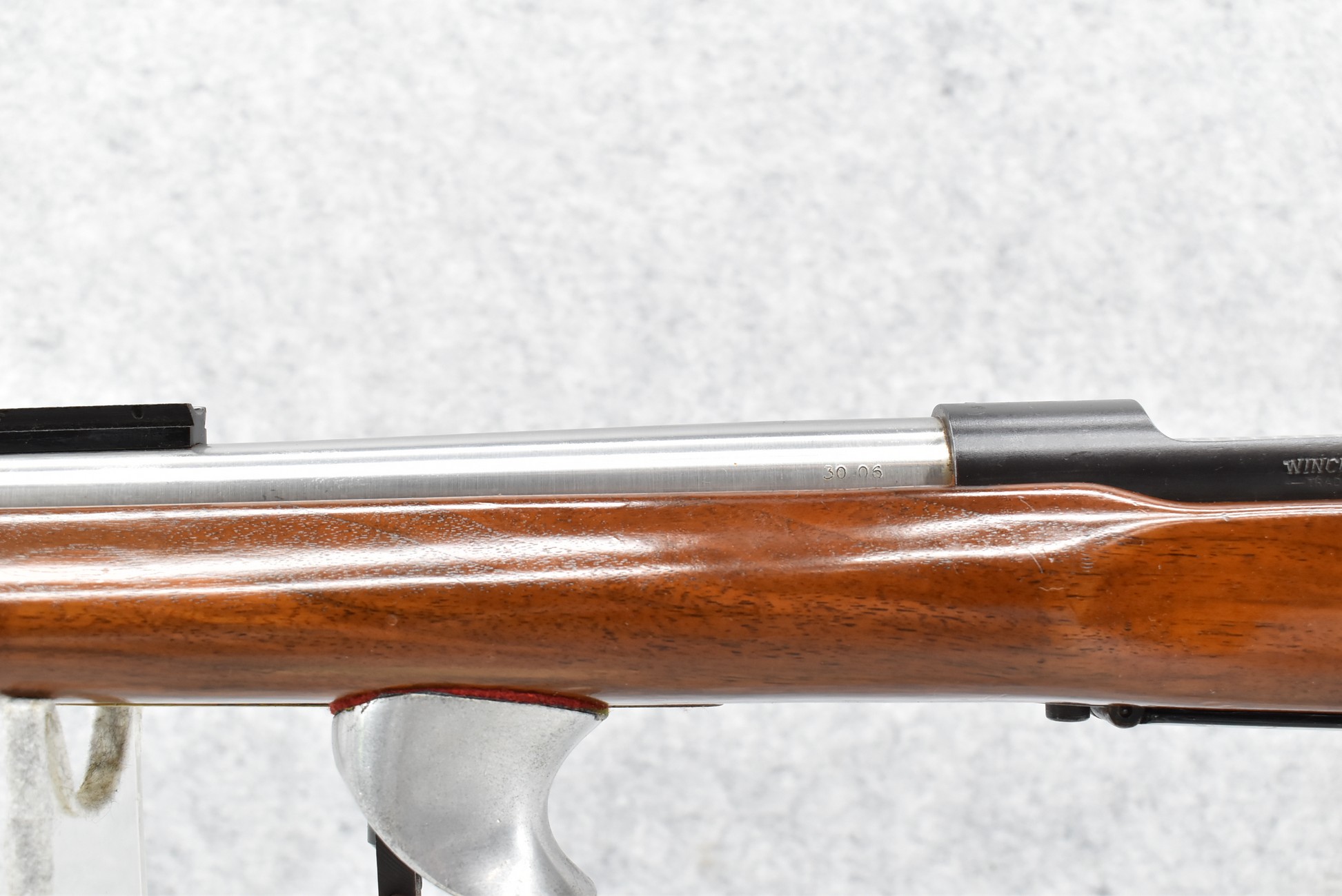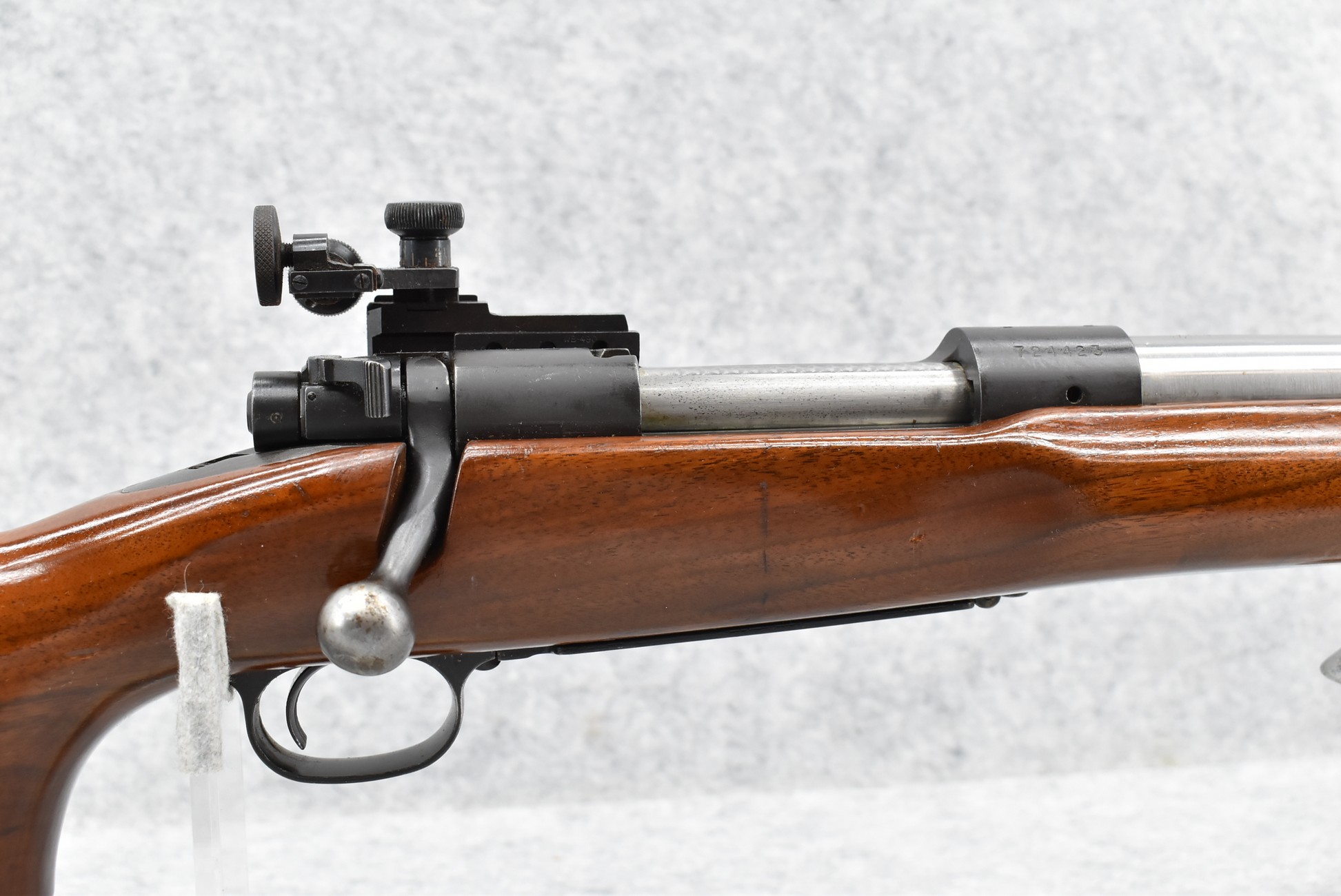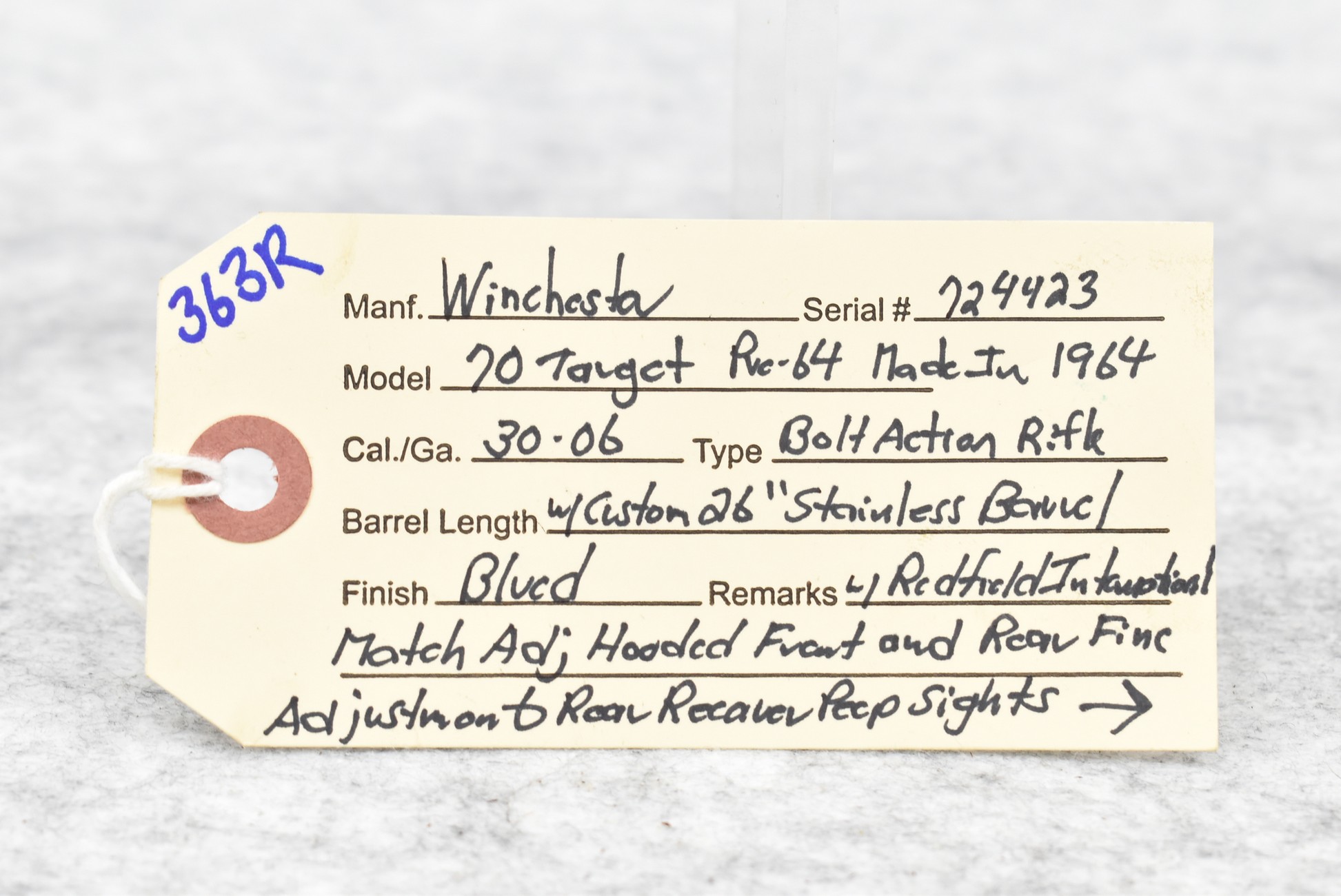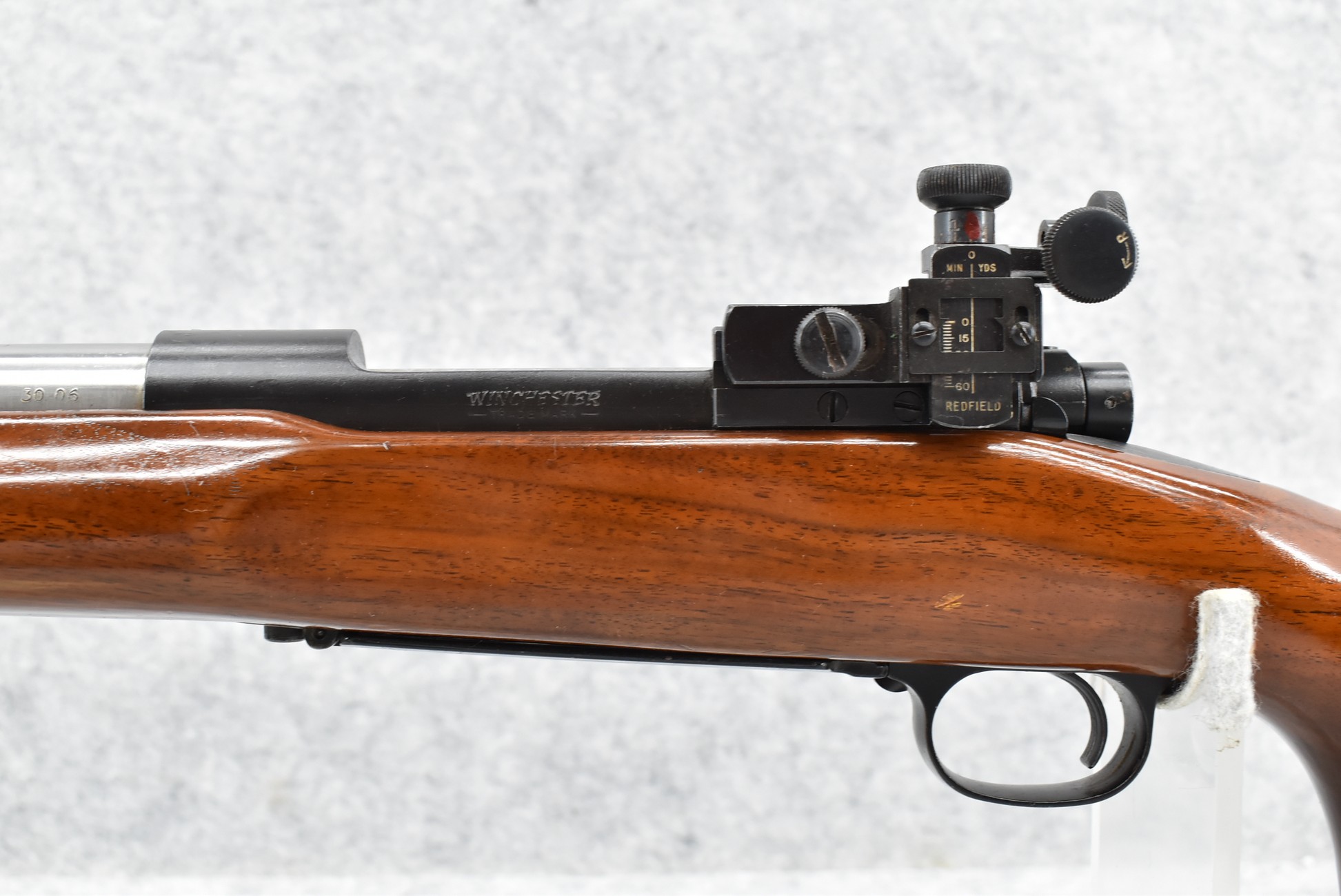 363R. Winchester – Mod. 70 Target (Pre-64) – 30-06 Cal. Bolt Action Rifle – w/Custom 26” Stainless Barrel w/Redfield International Match Adj. Hooded Front & Rear Fine Adj. Rear Receiver Peep Sights – Blued Finish – w/Target Pistol Grip Wood Stock w/Palm Stop Rail & Palm Stop – Mfg. in 1964