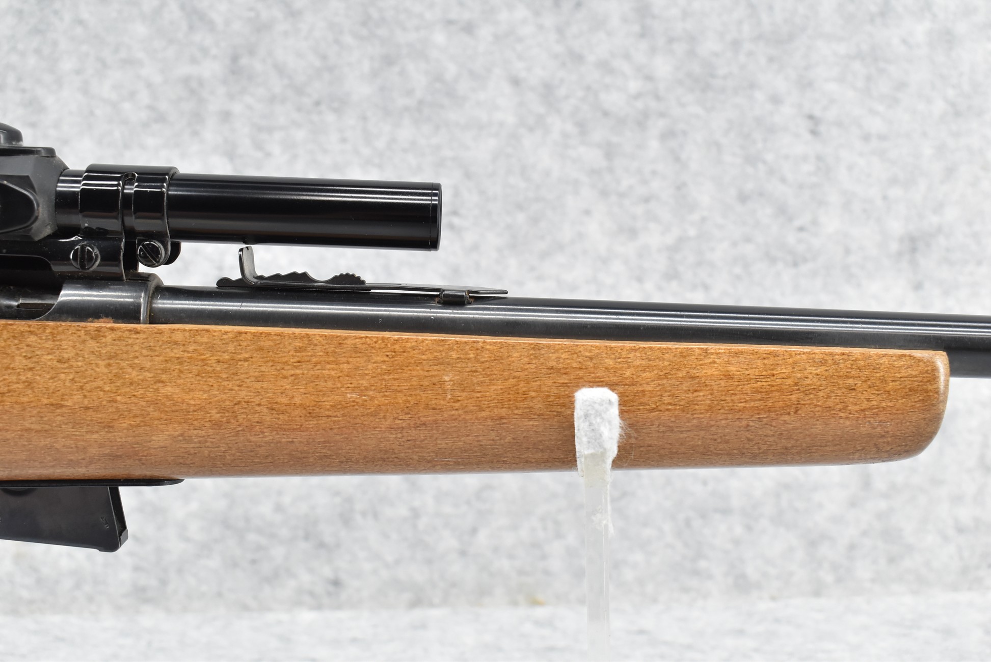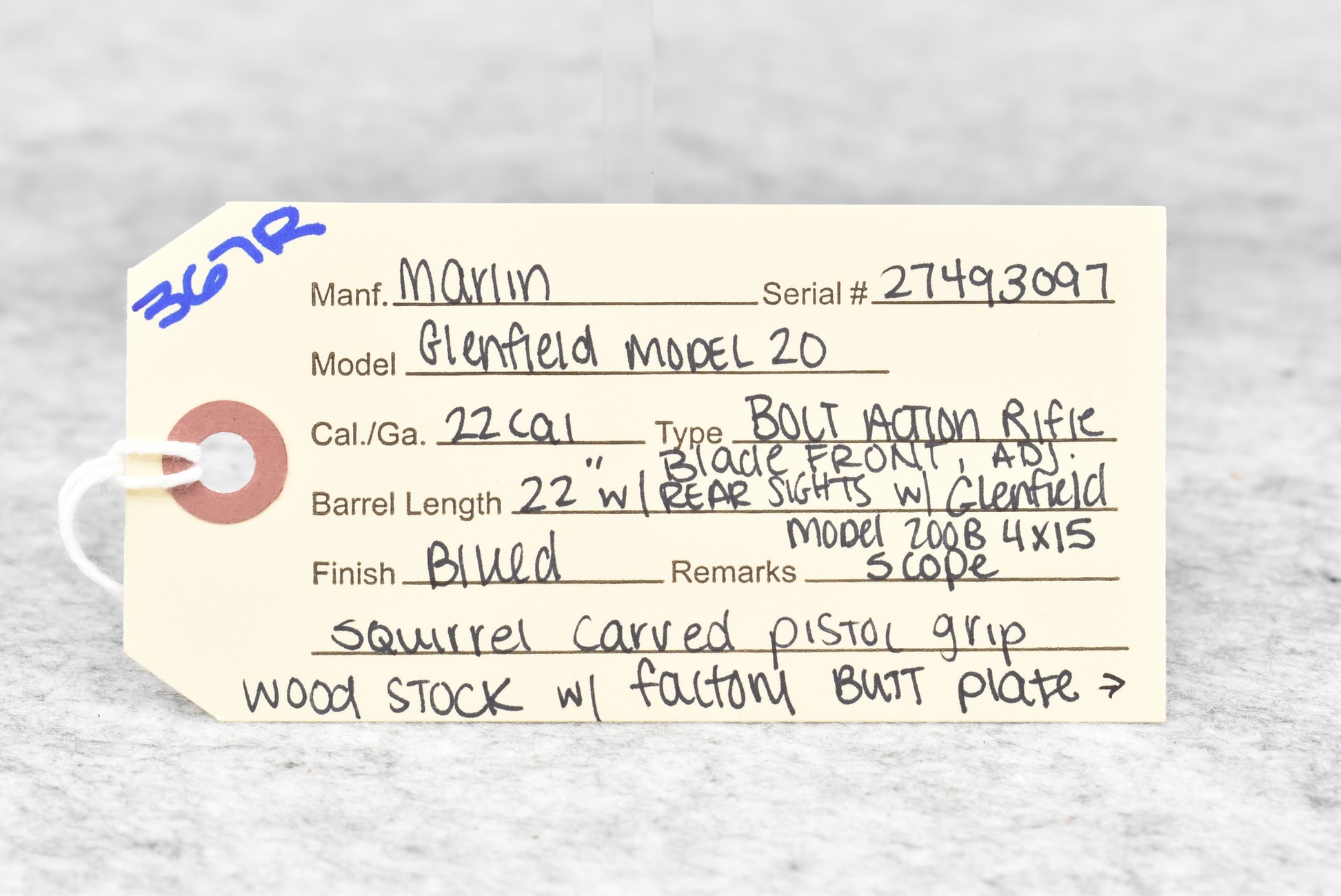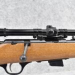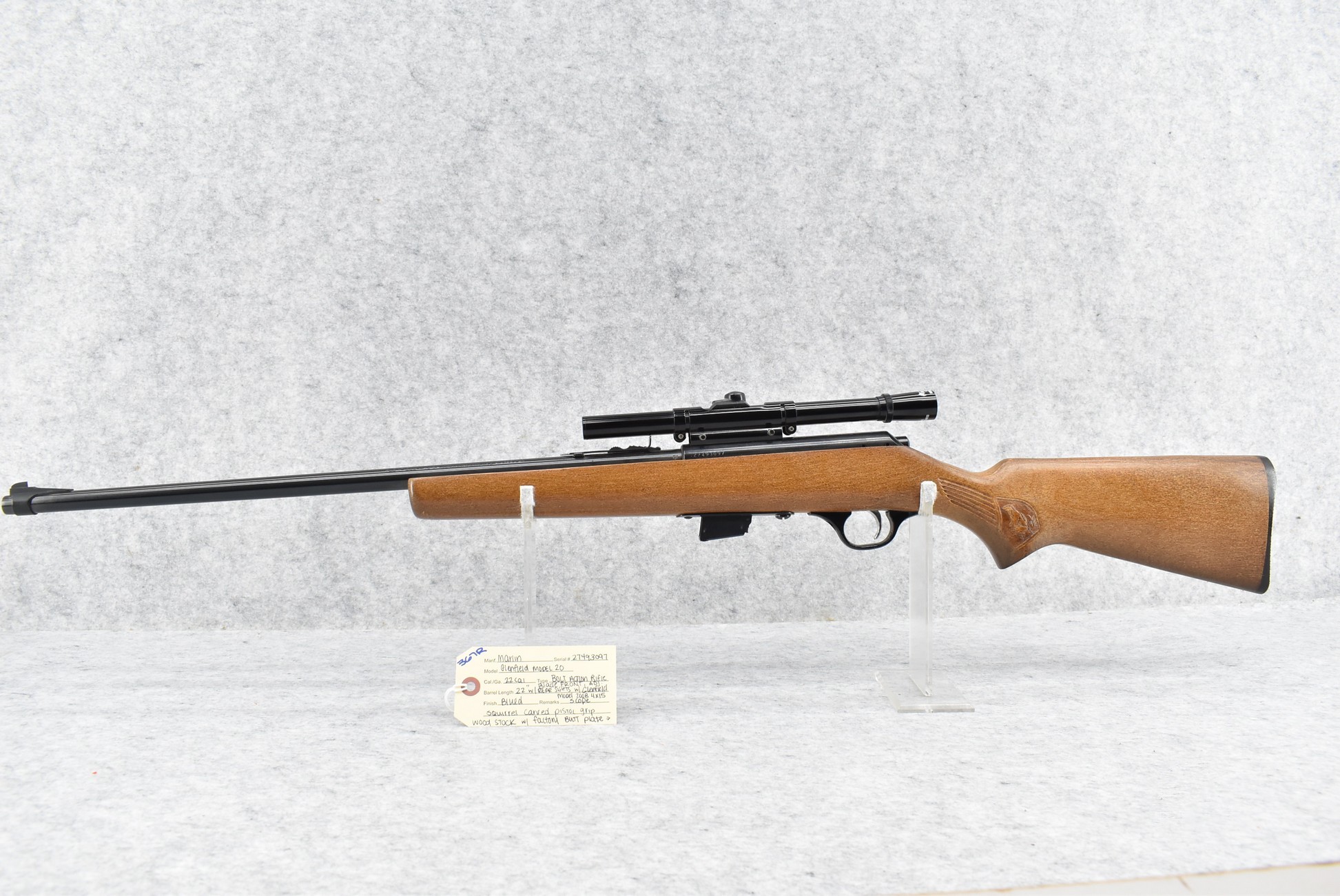 367R. Marlin – Mod. Glenfield Model 20 – 22 Cal. Bolt Action Rifle – w/22” Barrel w/Blade Front & Adj. Rear Sights – Blued Finish – w/Squirrel Carved Pistol Grip Wood Stock w/Factory Butt Plate – w/Factory Detachable Mag – w/Glenfield 200B 4×15 Scope