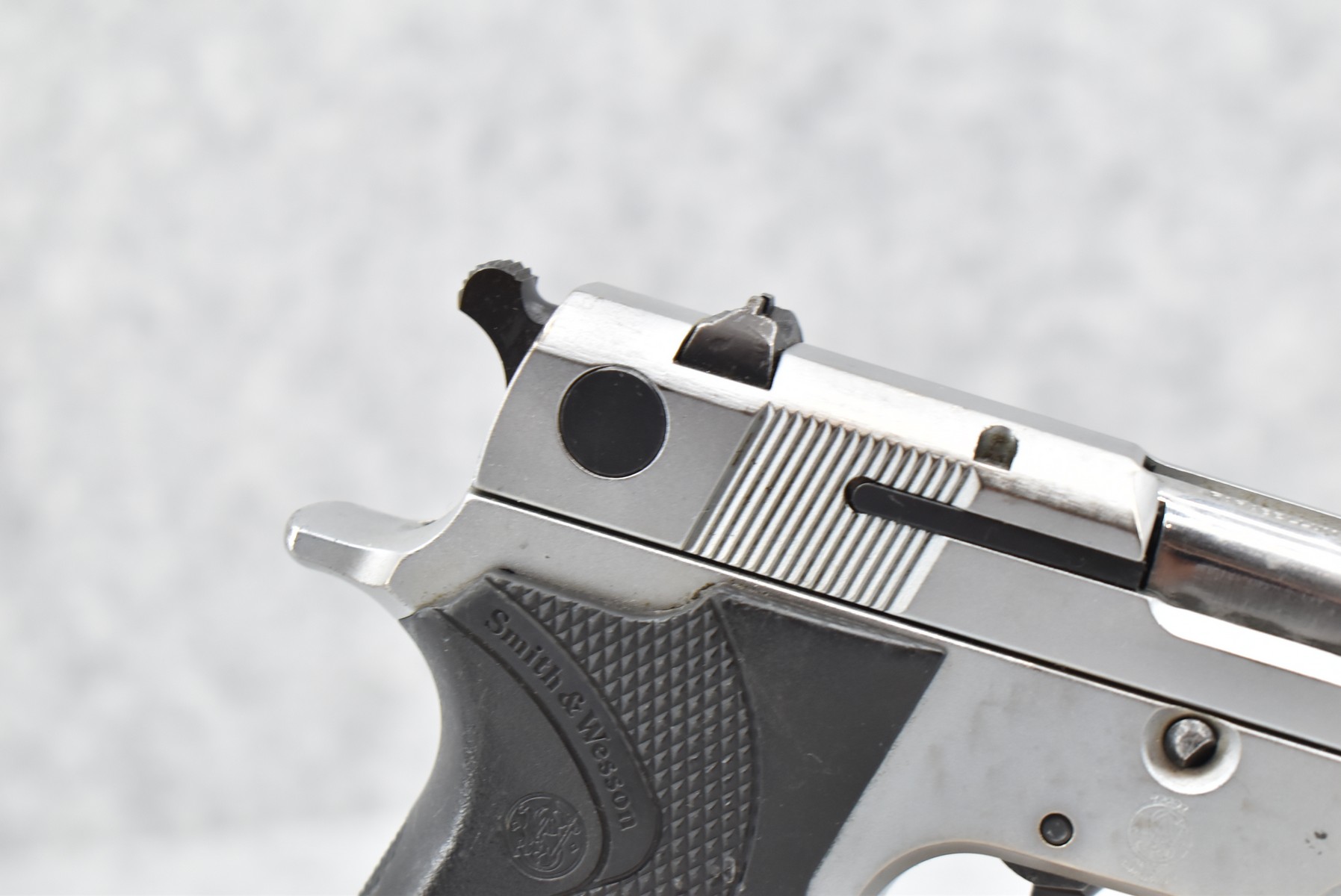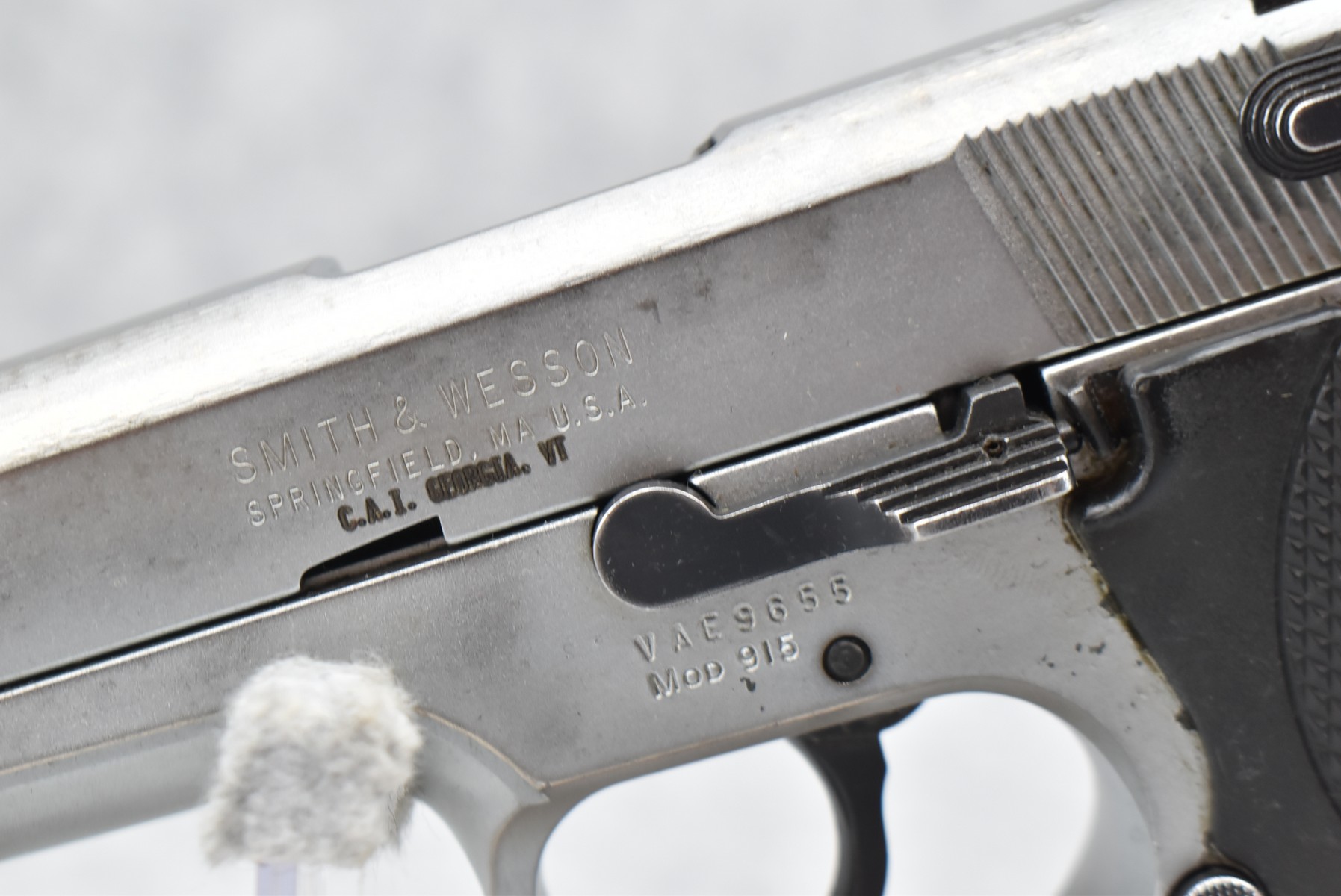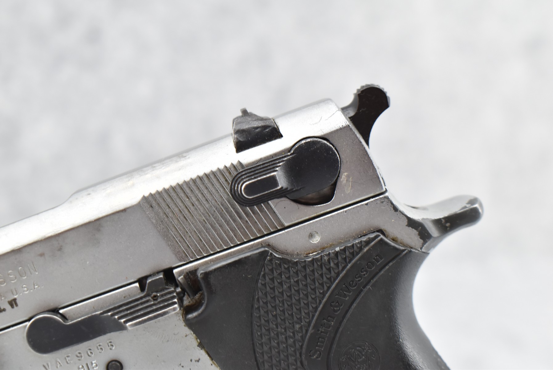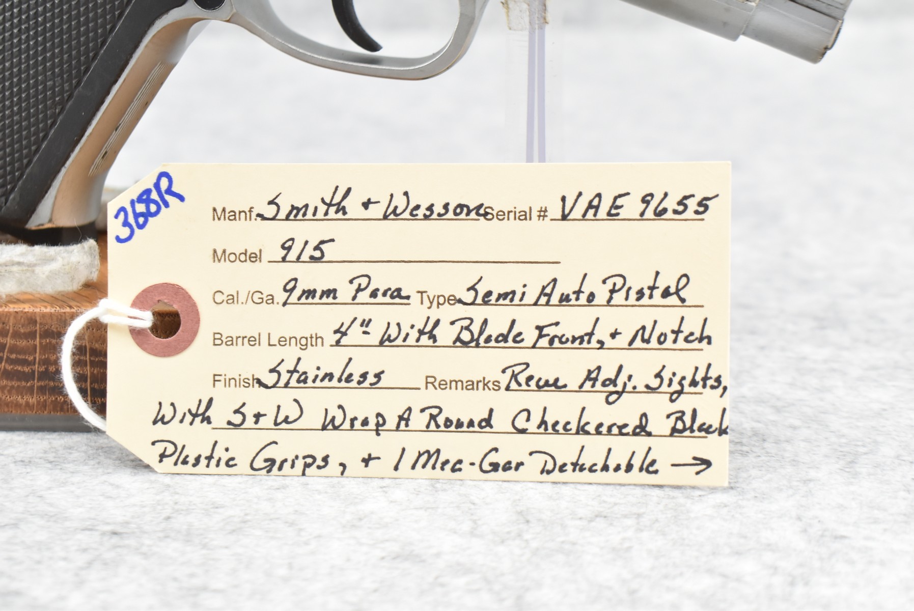 368R. Smith & Wesson – Mod. 915 – 9mm Para Cal. Semi-Auto Pistol – w/4” Barrel w/Blade Front and Adjustable Rear Notch Sights – Stainless Finish – w/S&W Wrap-a-Round Checkered Black Plastic Grips – w/1 Mrc-Gar Detachable Magazine – Manufactured Between 1992-1994 Only