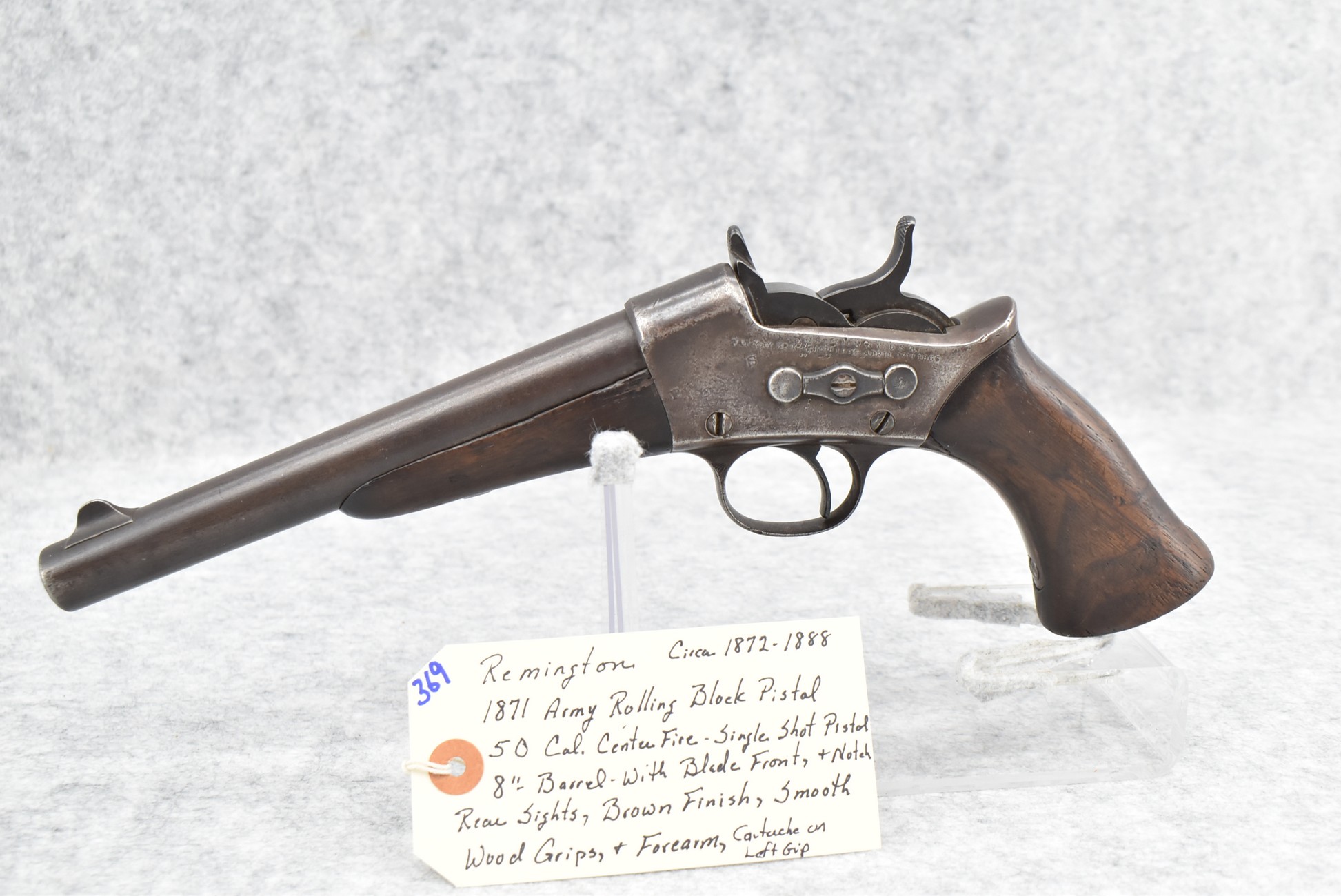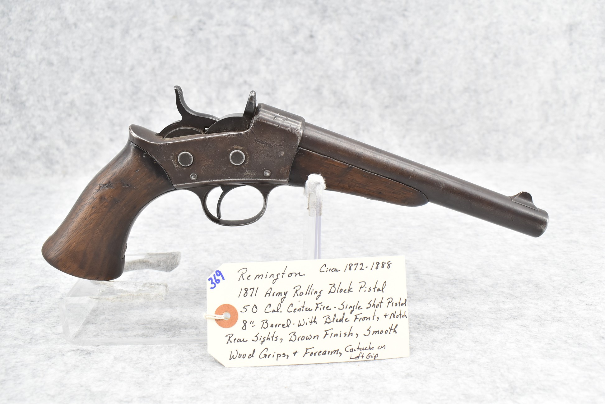 369. Remington – Mod. 1871 Army Rolling Block Pistol – 50 Cal. CF Single Shot Pistol – w/8” Barrel w/Blade Front & Notch Rear Sights – Brown Finish – w/Smooth Wood Grips & Forearm w/Cartouche on Left Grip – Circa 1872-1888