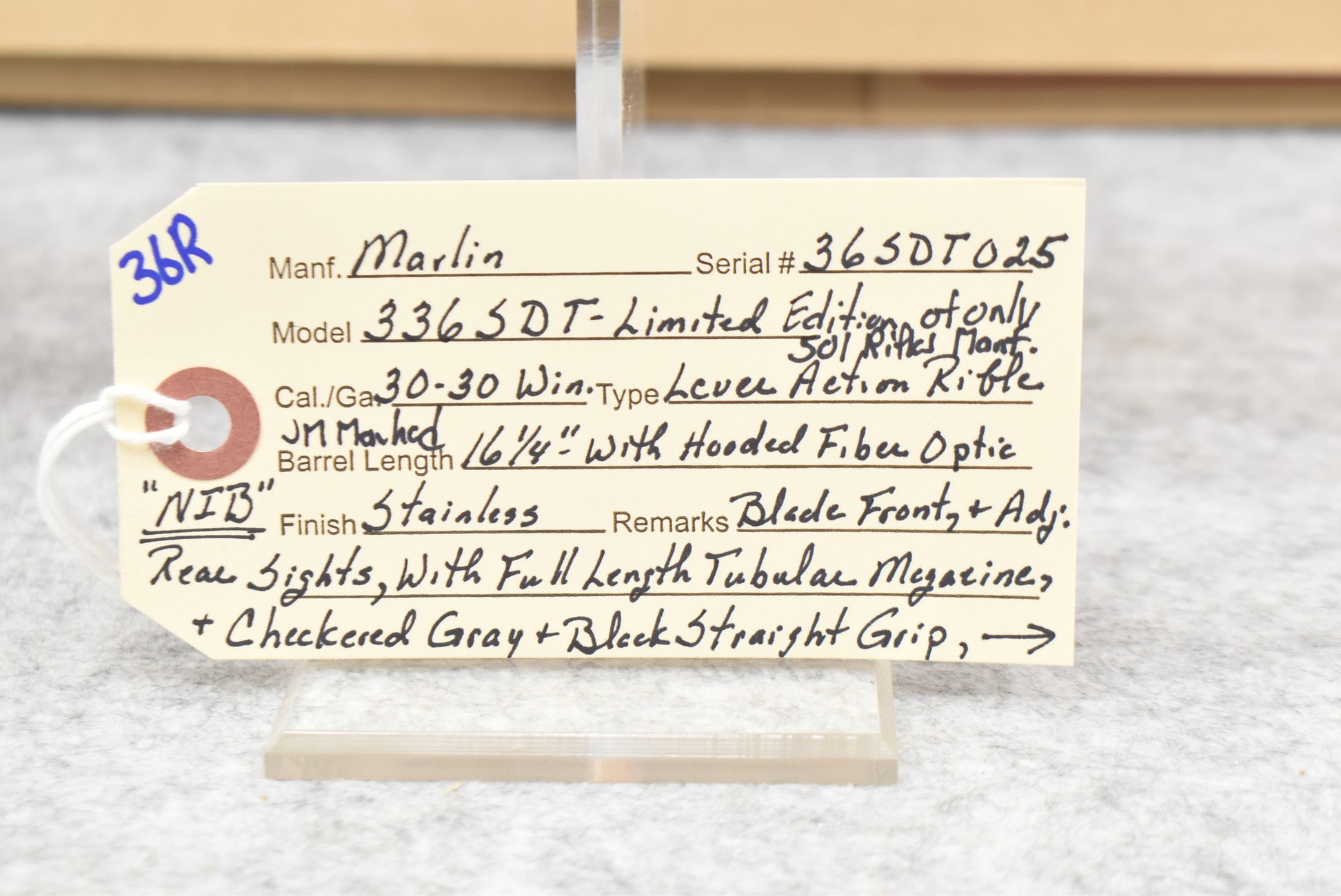 36R. Marlin – Mod. 336 (SDT Limited Edition of Only 501 Rifles Manufactured) – 30-30 Win. Cal. Lever Action Rifle – w/16¼” JM Marked Barrel w/Fiber Optic Hooded Blade Front and Adjustable Rear Sights – Stainless Finish – w/Checkered Grey Straight Grip Laminated Wood Stock and Forearm w/Factory Black Rubber Butt Pad – w/Full Length Tubular Magazine – New in Factory Box w/Manual
