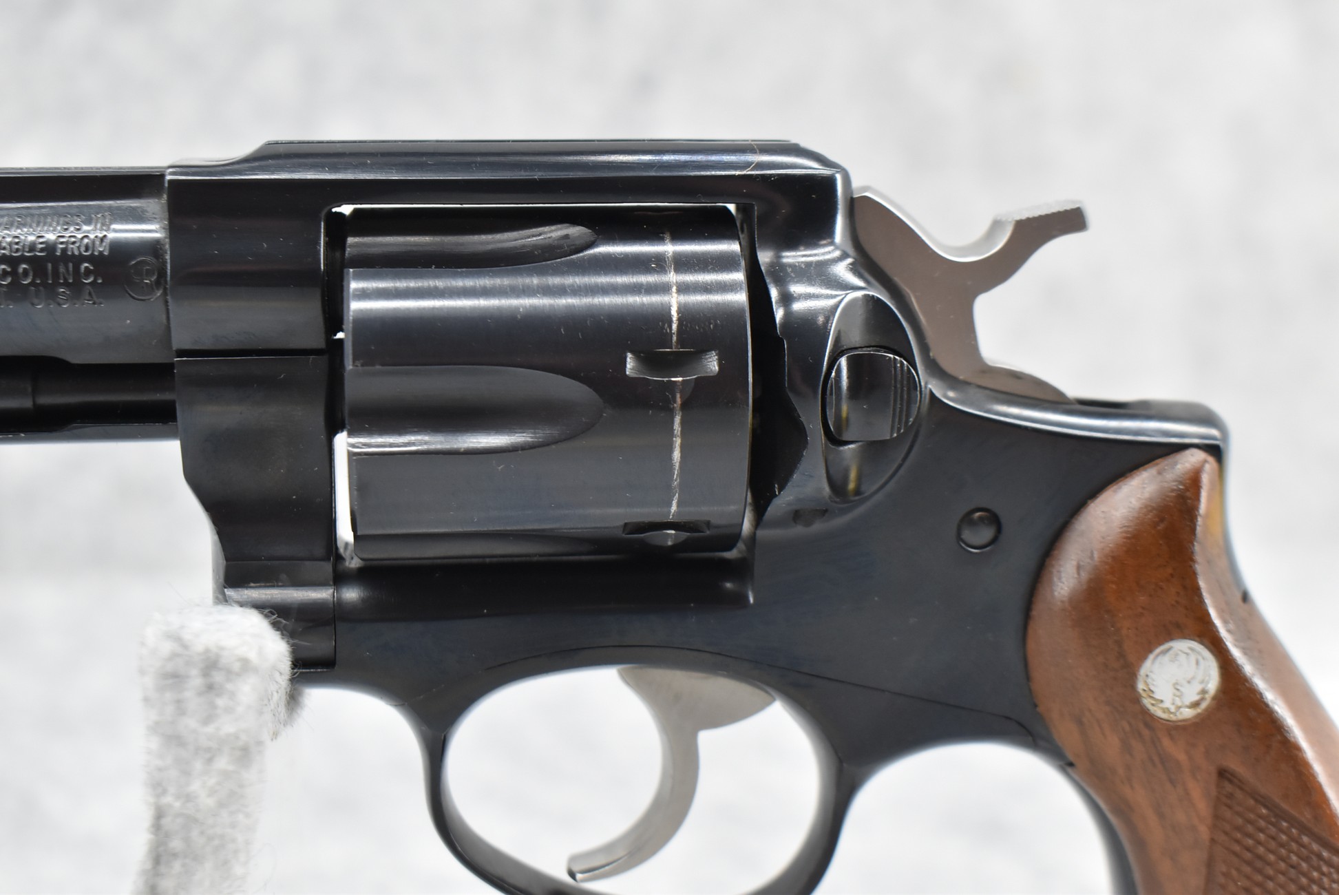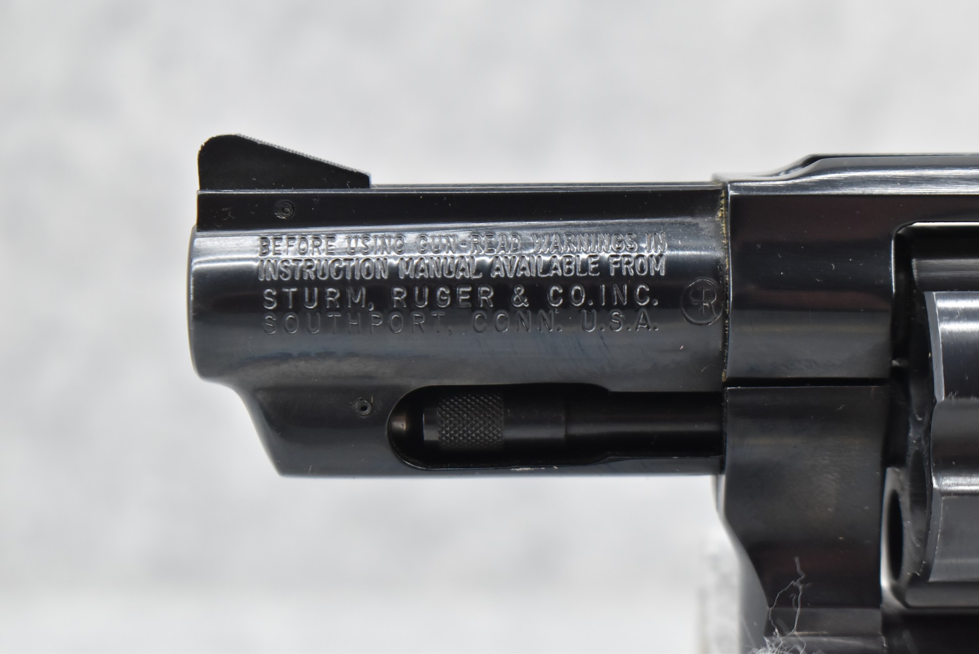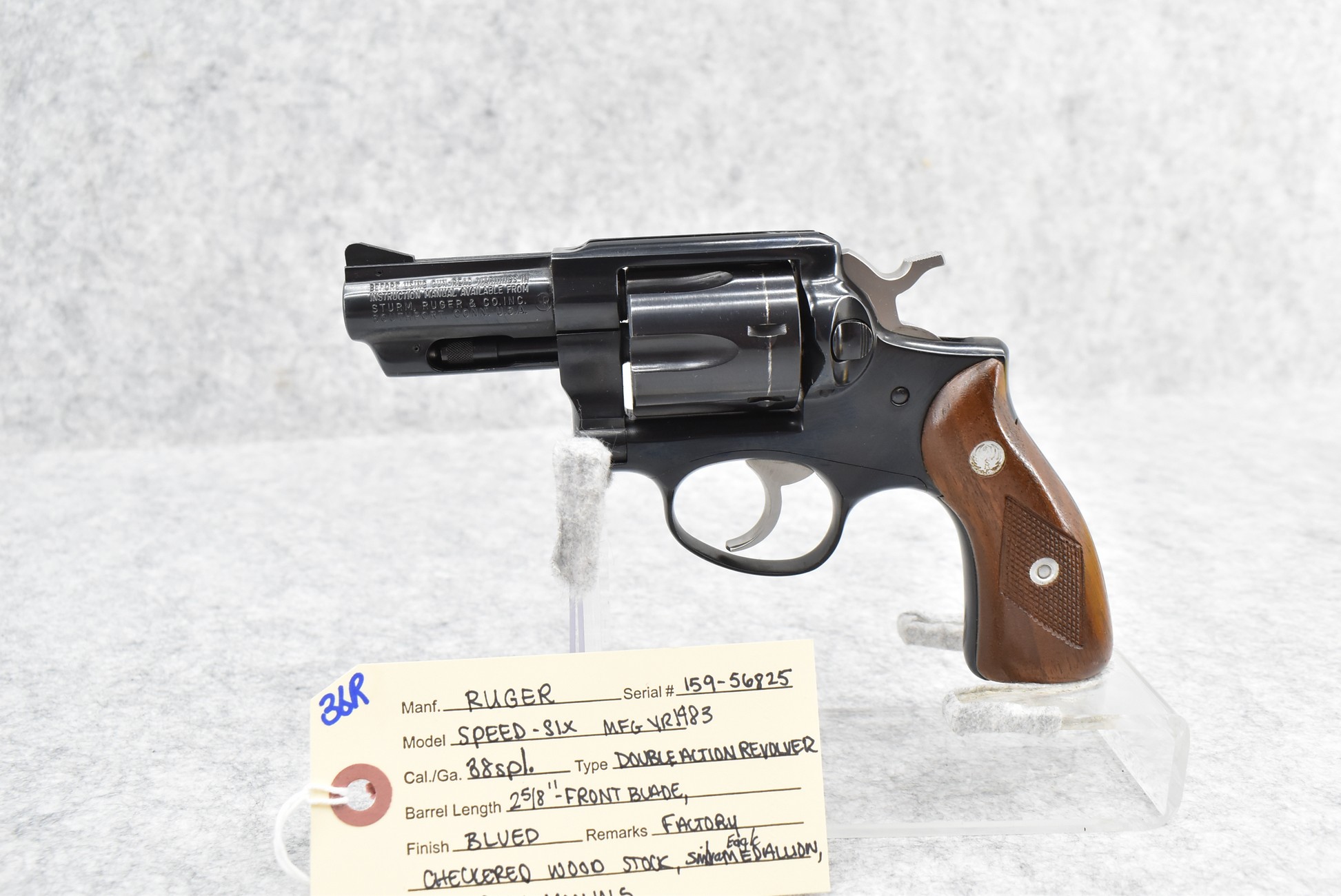 36R. Ruger – Mod. Speed Six – 38 Spl. Cal. Double Action Revolver – w/2 5/8” Barrel w/Blade Front & Grooved Rear Sights – Blued Finish – w/Factory Checkered Wood Grip w/Ruger Silver Eagle Medallion – Manufactured 1983 – w/Factory Box and Manual