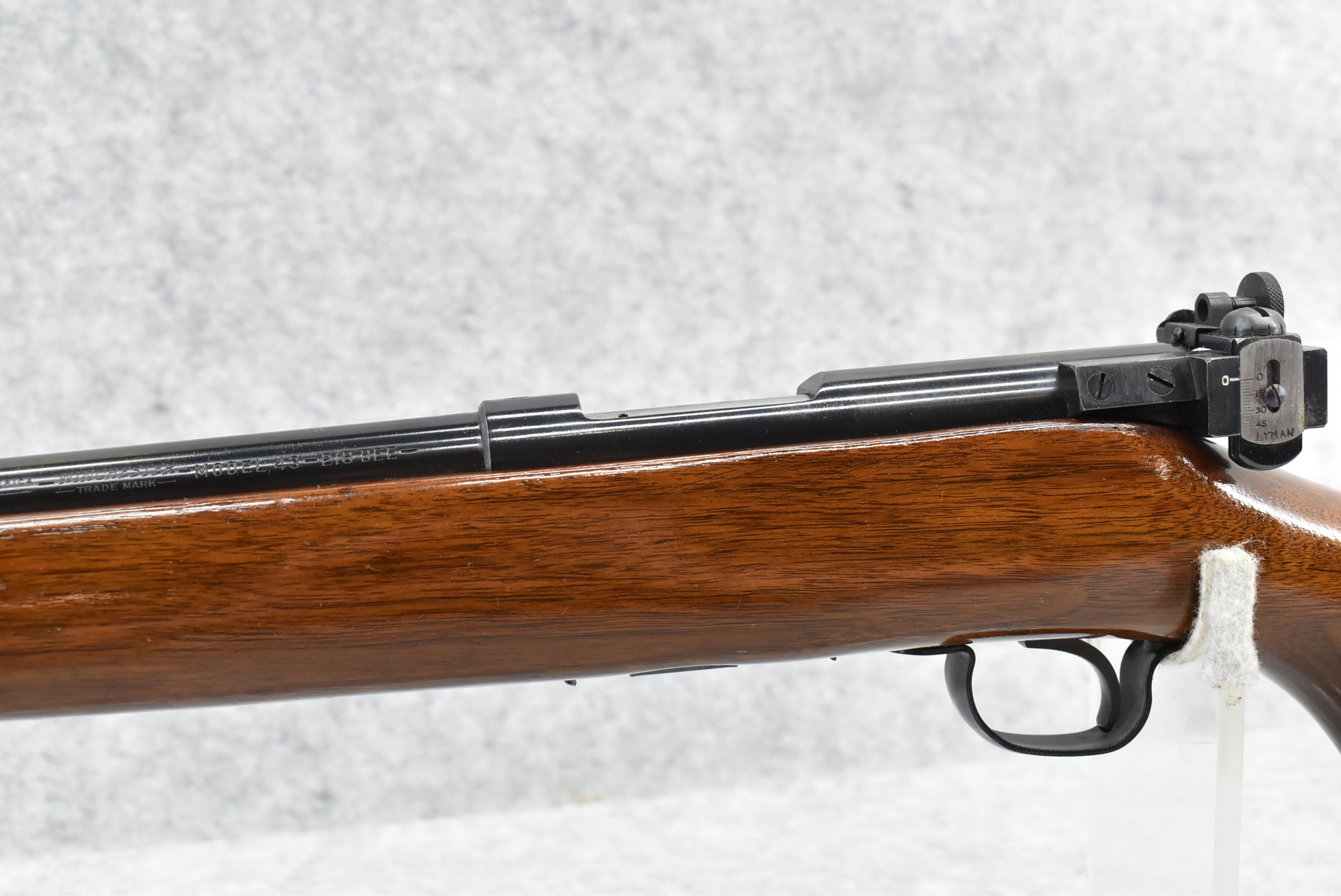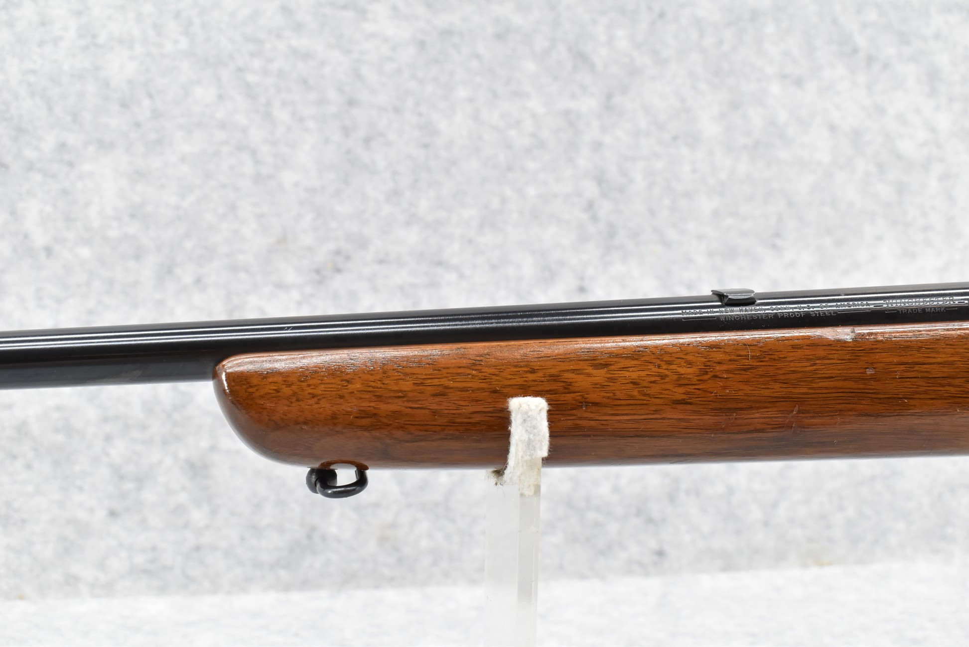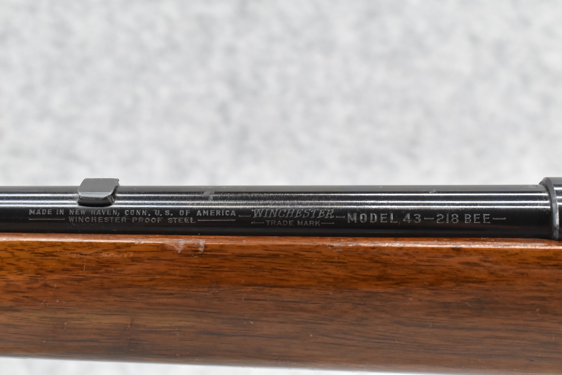 36R. Winchester – Mod. 43 – 218 Bee Cal. Bolt Action Rifle – w/24” Barrel w/Hooded Front Blade & Lyman 57A Adj. Rear Receiver Peep Sights – Blued Finish – w/Smooth Pistol Grip Wood Stock w/Factory Checkered Metal Butt Plate – w/Factory Detachable Magazine – Mfg. 1950