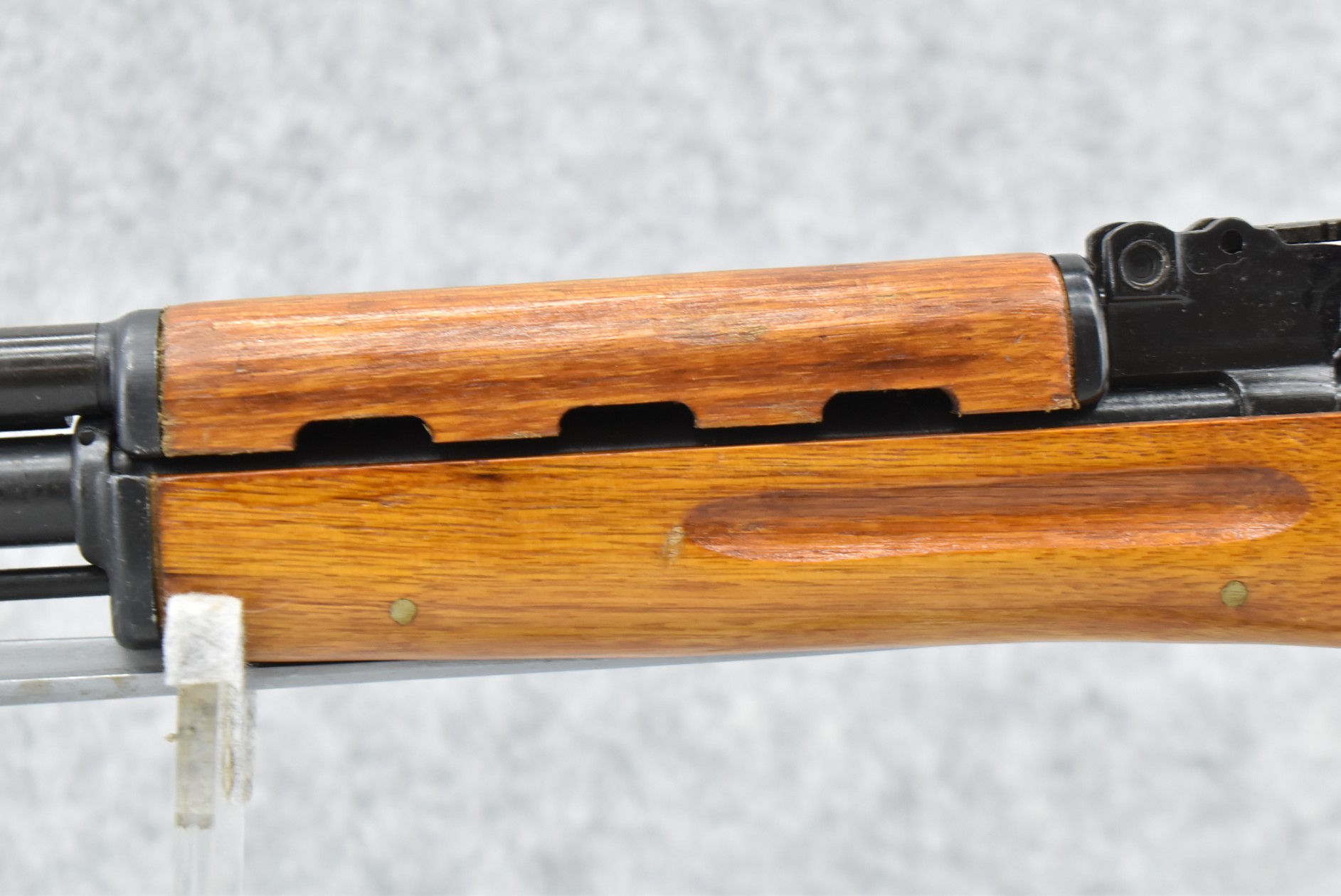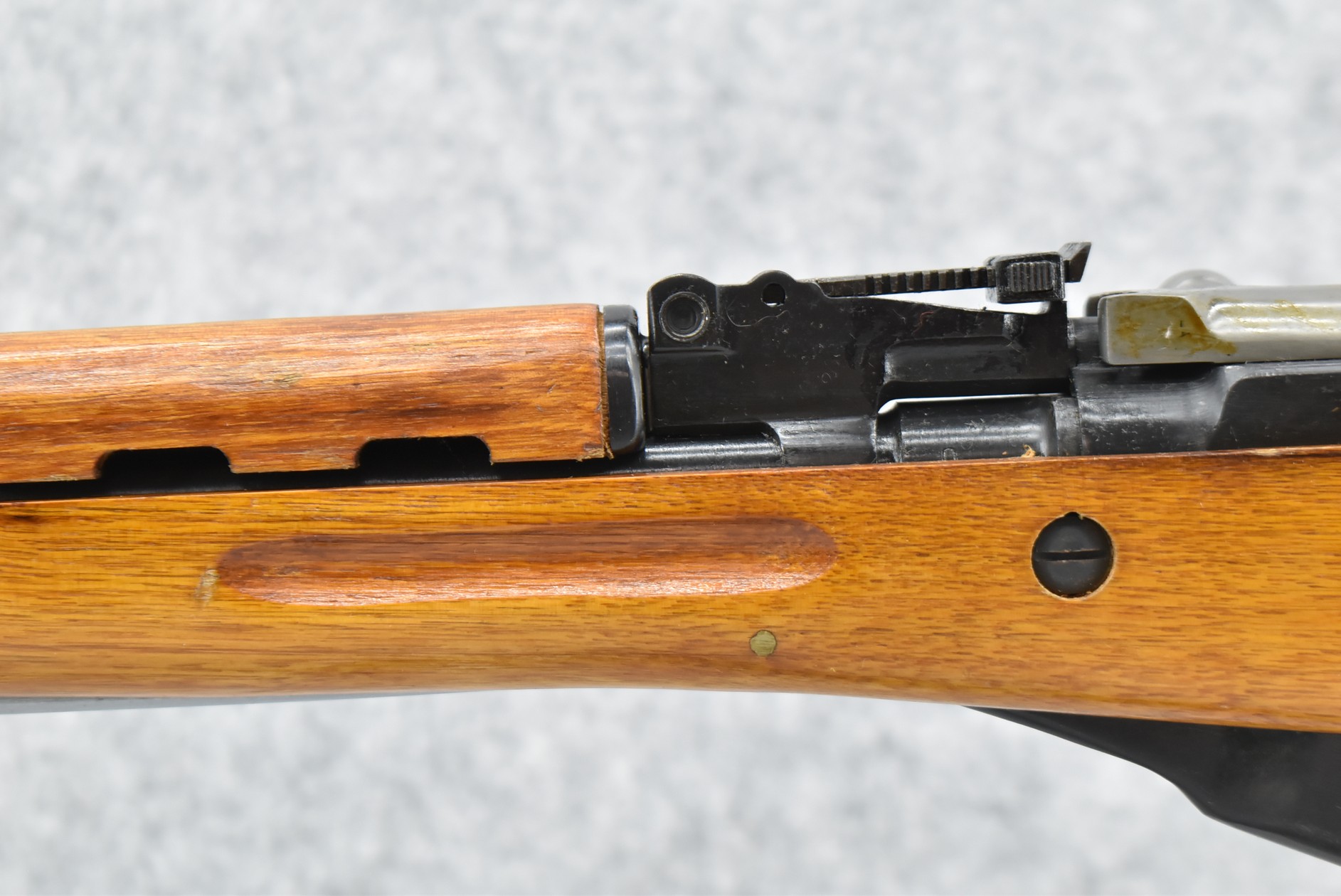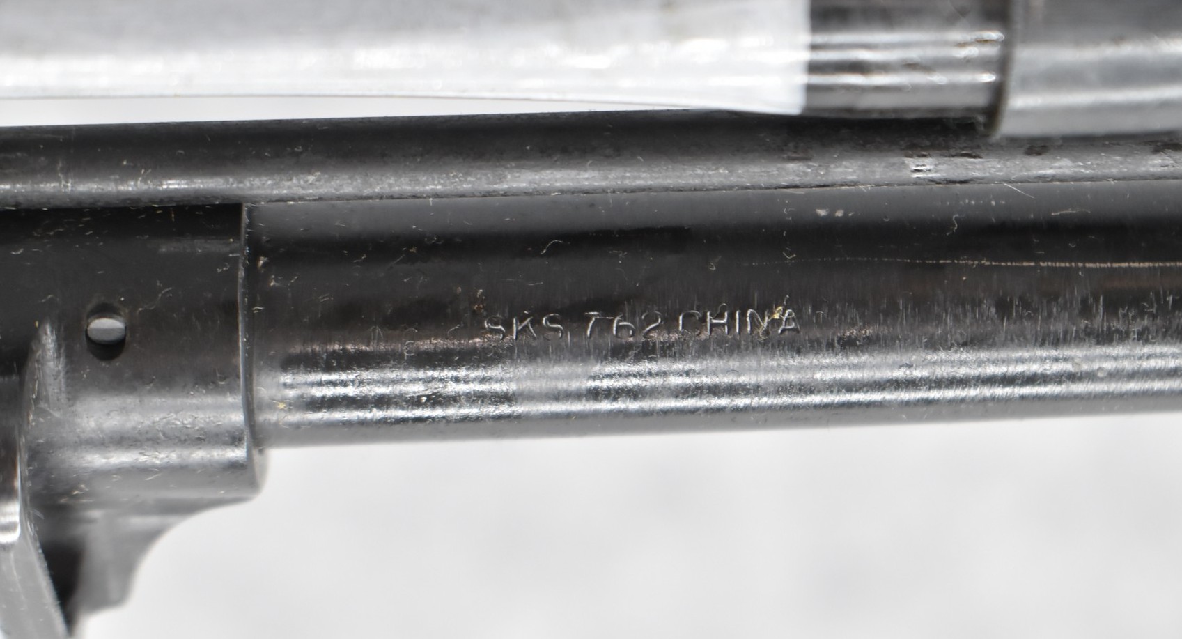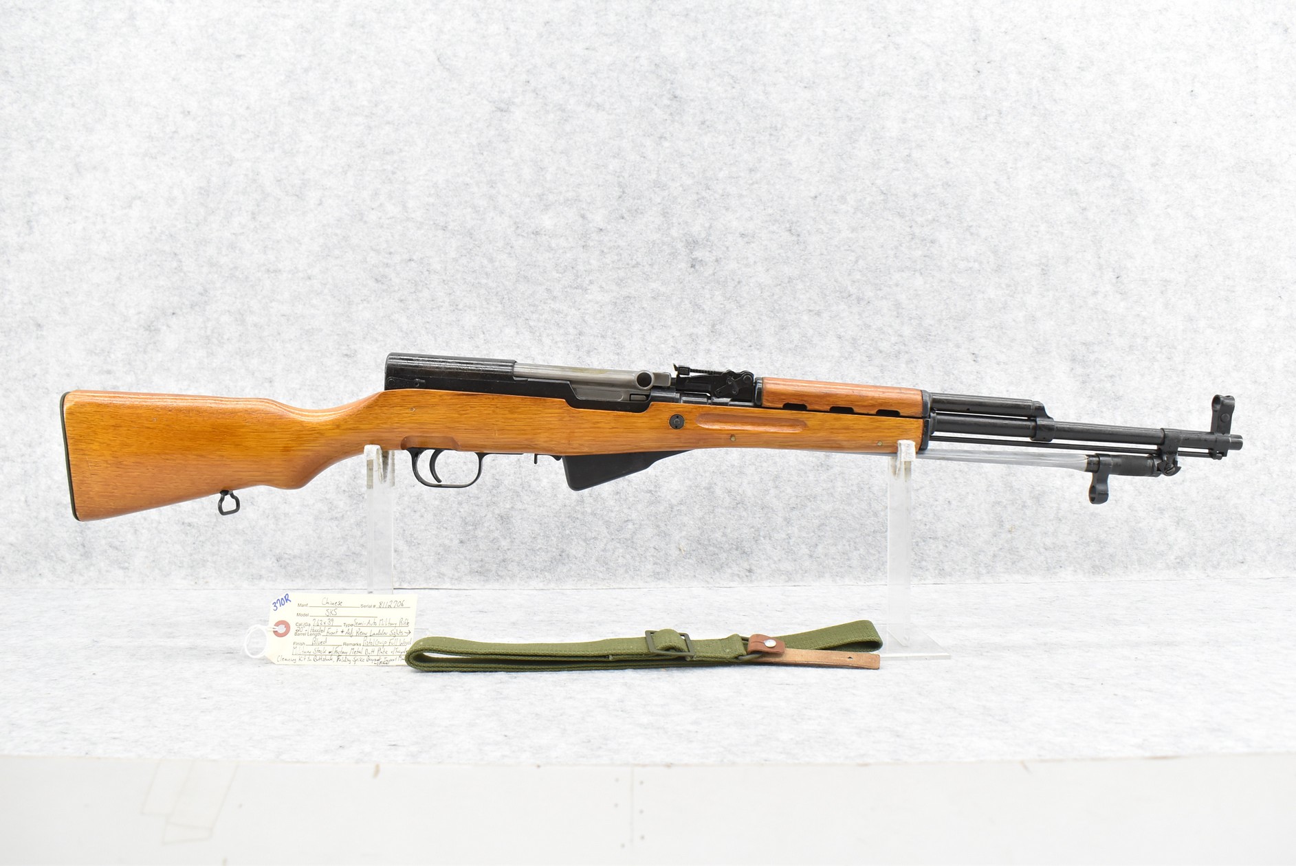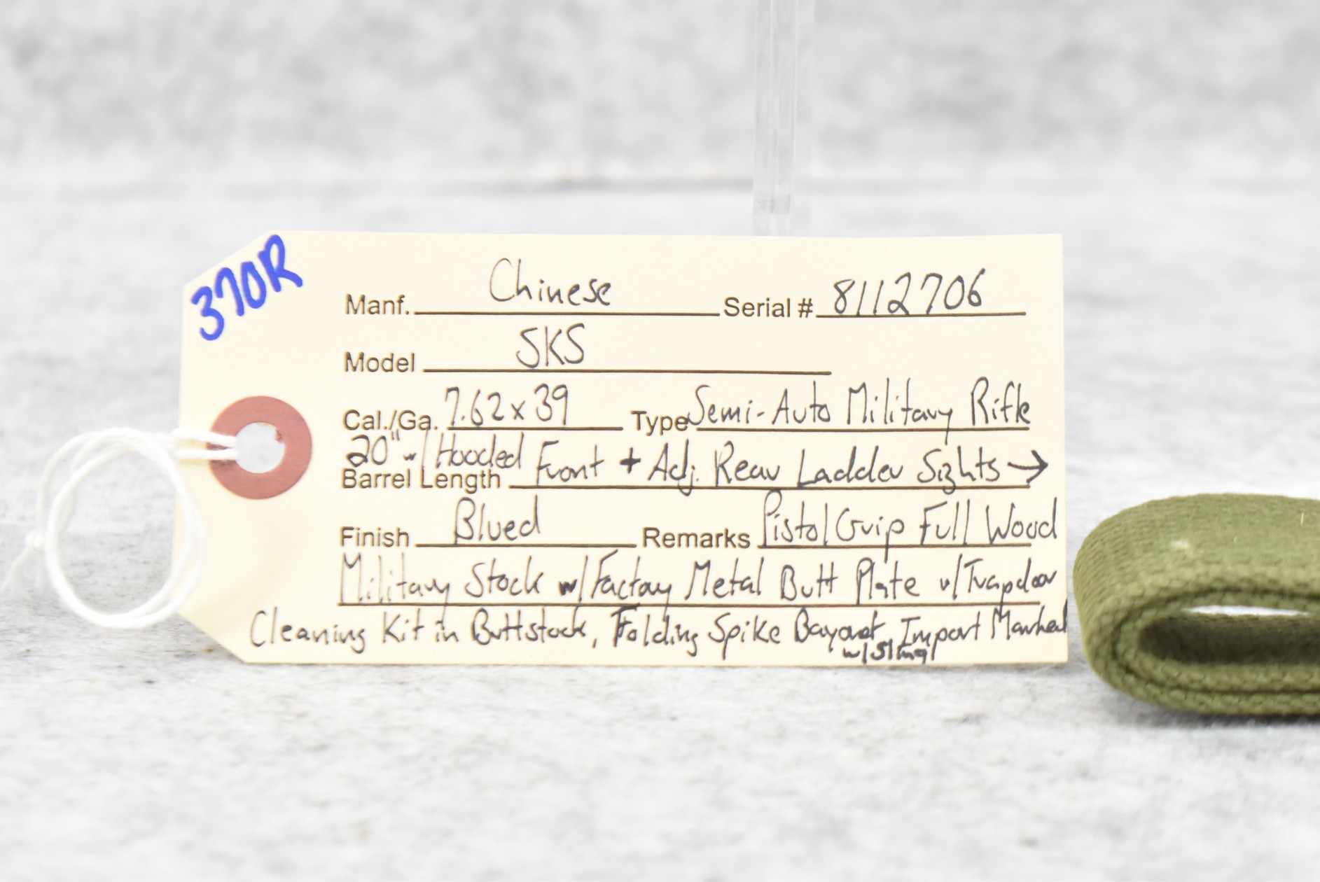 370R. Chinee – Mod. SKS – 7.62×39 Cal. Semi-Auto Military Rifle – w/20” Barrel w/Hooded Front & Adj. Rear Ladder Sights -Blued Finish – w/Pistol Grip Full Wood Military Stock w/Factory Meal Butt Plate w/Trapdoor & Cleaning Kit in Butt Stock – w/Sling – w/Folding Spike Bayonet – Import Marked – Still in the Cosmoline!
