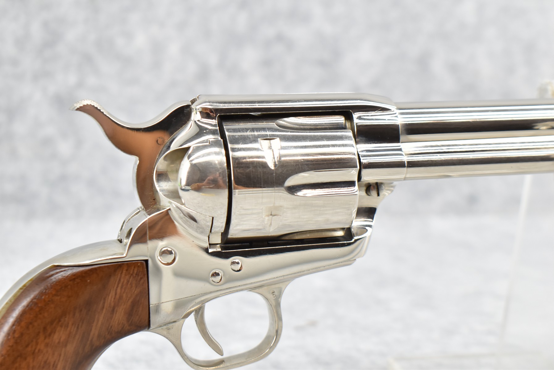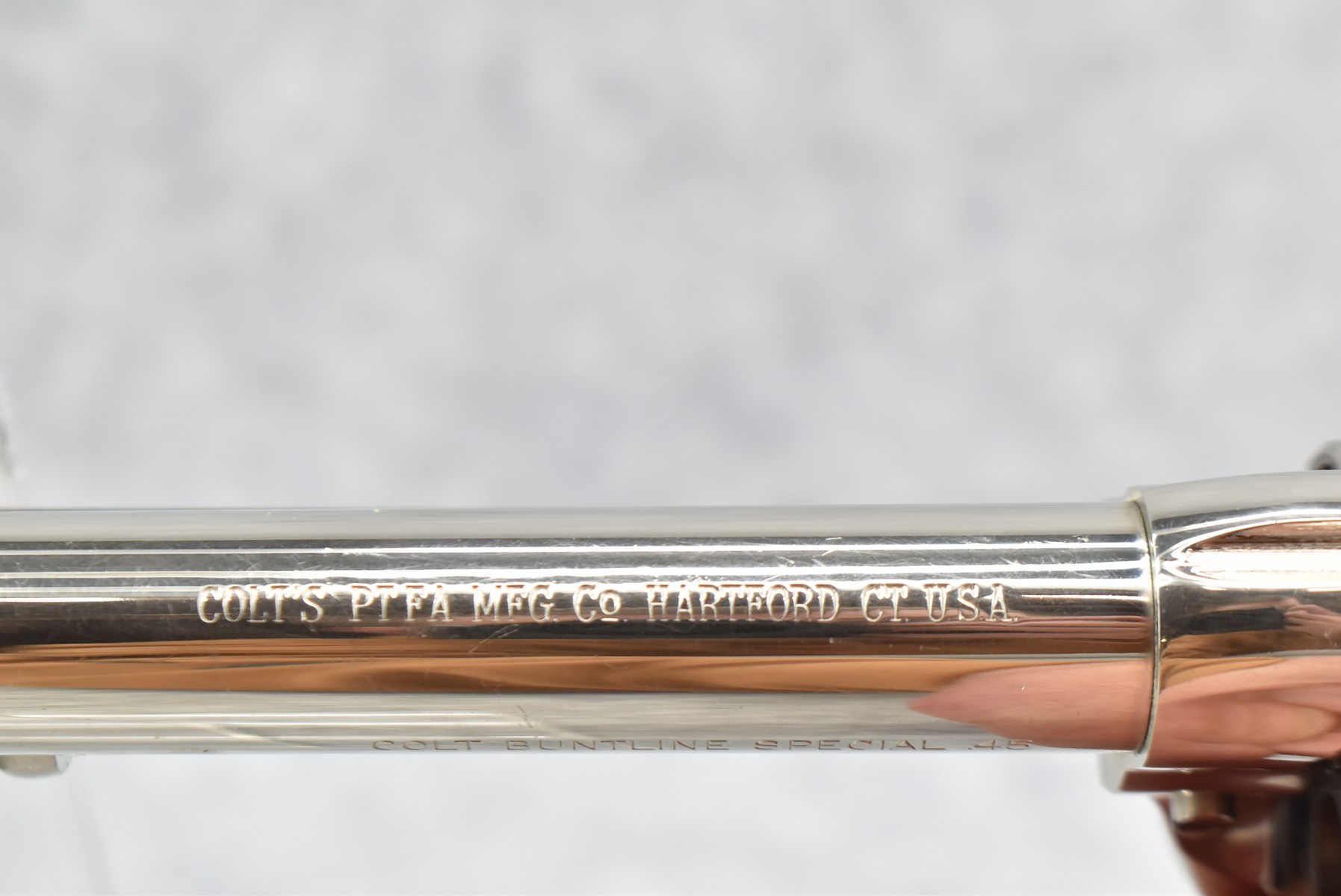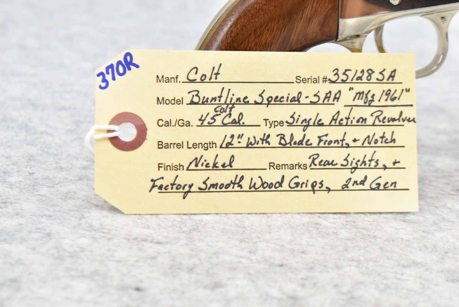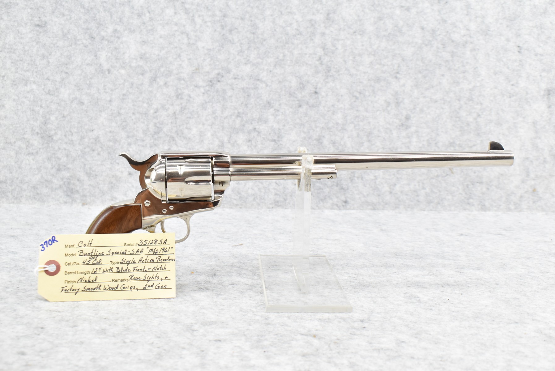 370R. Colt – Mod. Buntline Special Single Action Army – 2nd Generation – 45 Colt Cal. Single Action Revolver – w/12” Barrel w/Blade Front & Notch Rear Sights – w/Factory Smooth Wood Grips – Mfg. 1961