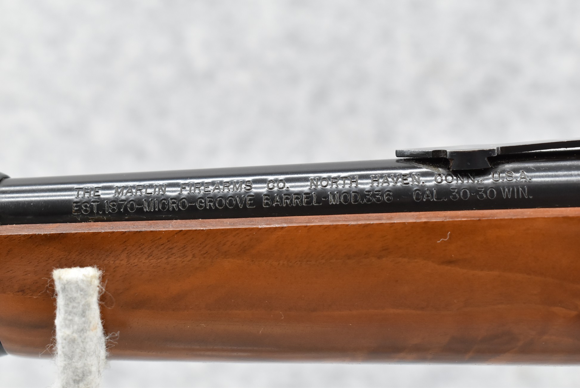 370R. Marlin – Mod. 336 – 30-30 Win. Cal. Lever Action Rifle – w/20” JM Stamped Barrel w/Front Blade Sight & Rear Adj. Semi Buckhorn Sights w/Full Length Tubular Magazine – Blued Finish – w/Plain Capped Pistol Grip Wood Stocks w/Factory Butt Plate – w/Hammer Extension – Mfg. 1979