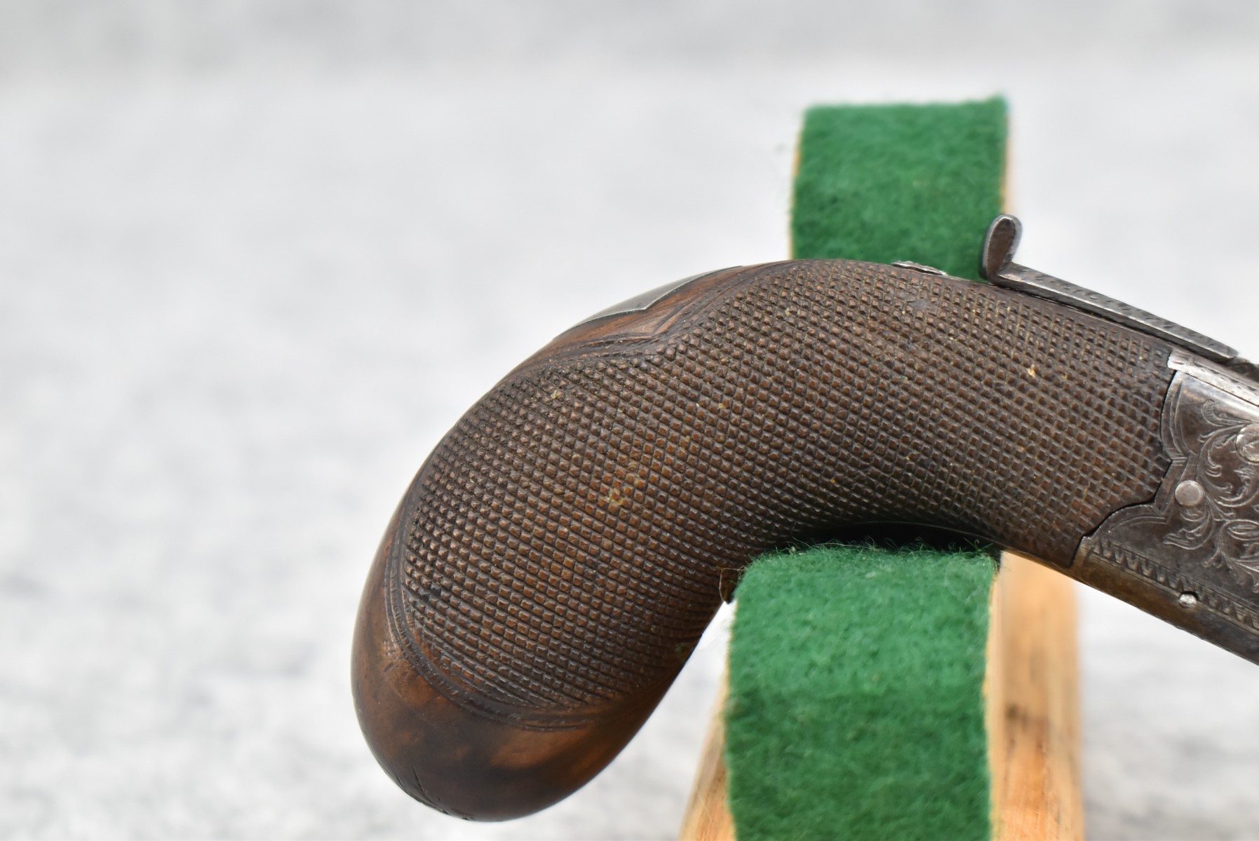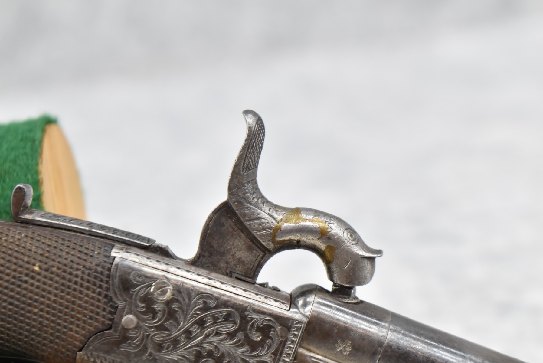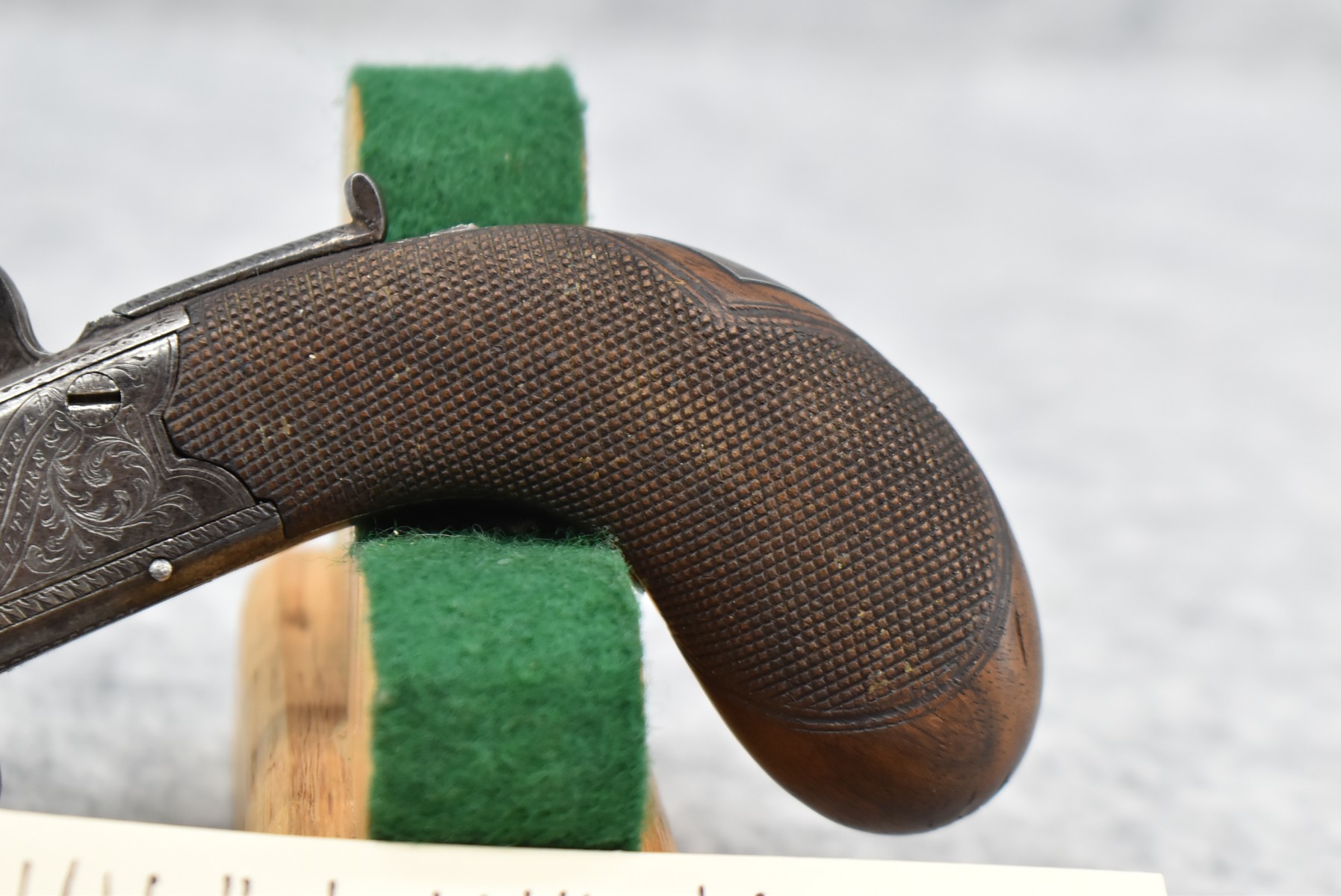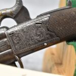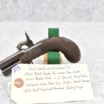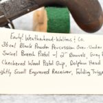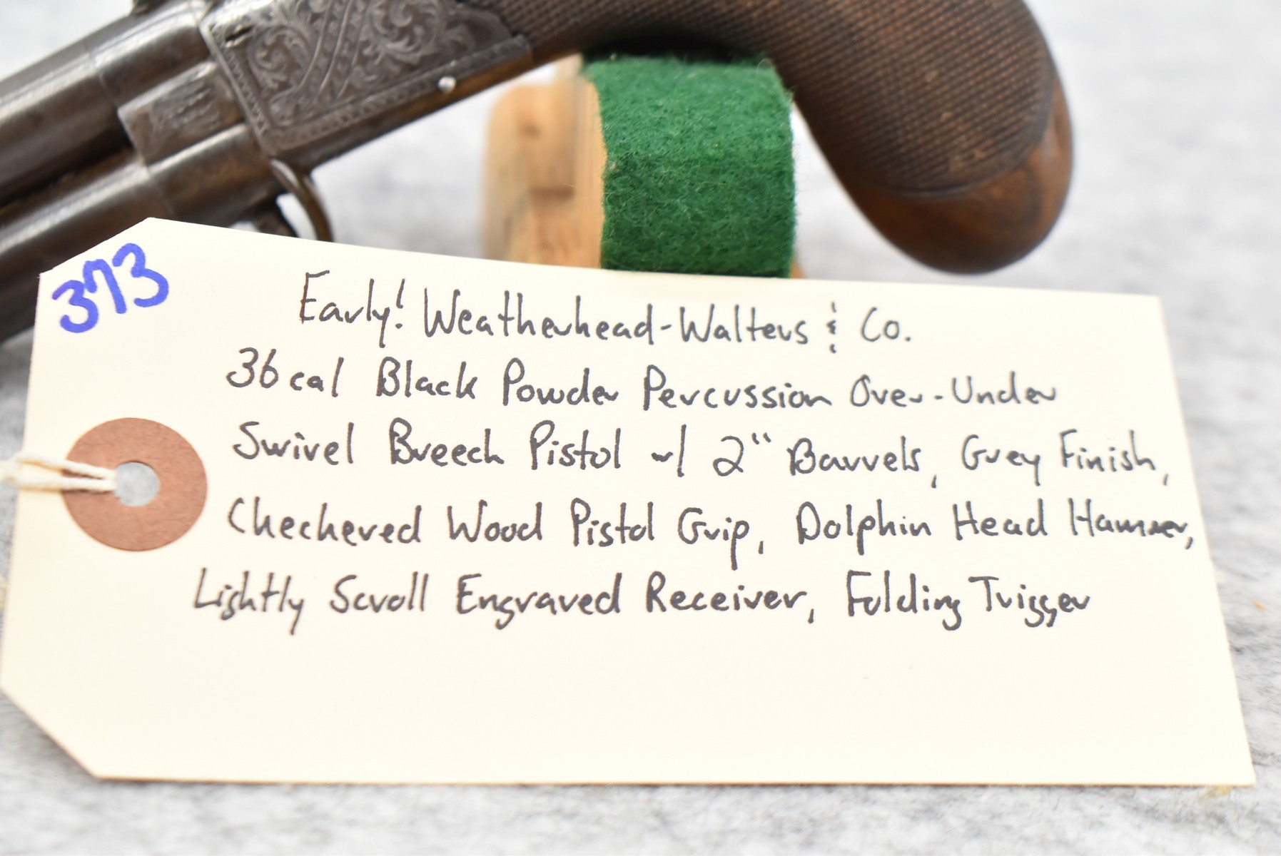 373. Early! Weatherhead-Walters & Co. – 36 Cal. Black Powder Percussion Over-Under Swivel Breech Pistol – w/2” Barrels – Gray Finish – w/Lightly Scroll Engraved Receiver – w/Checkered Wood Pistol Grip – w/Dolphin Head Hammer – w/Folding Trigger – Excellent Example