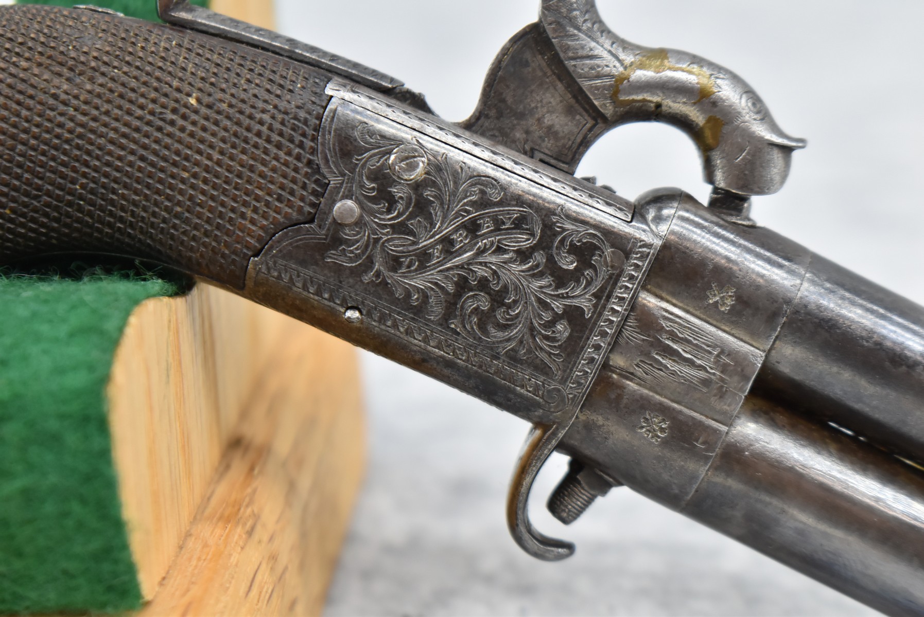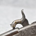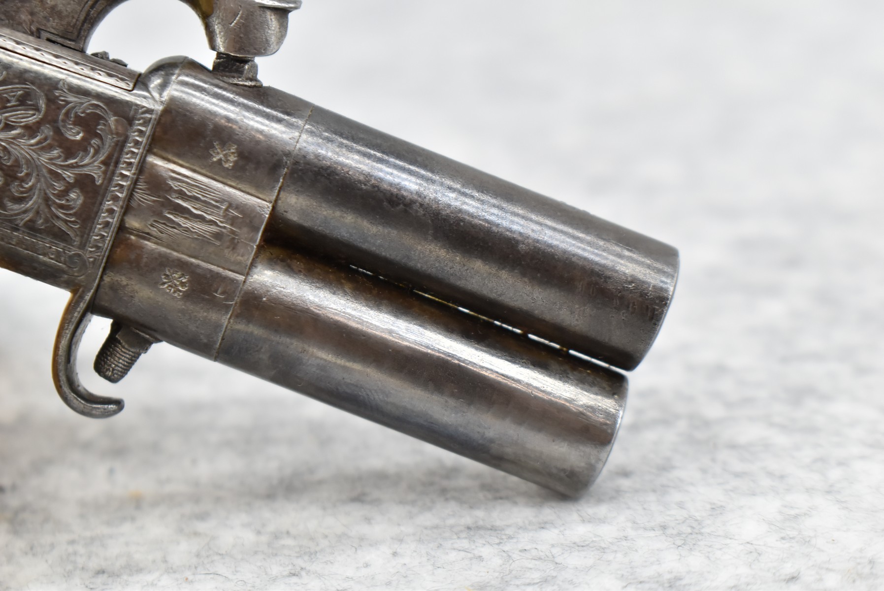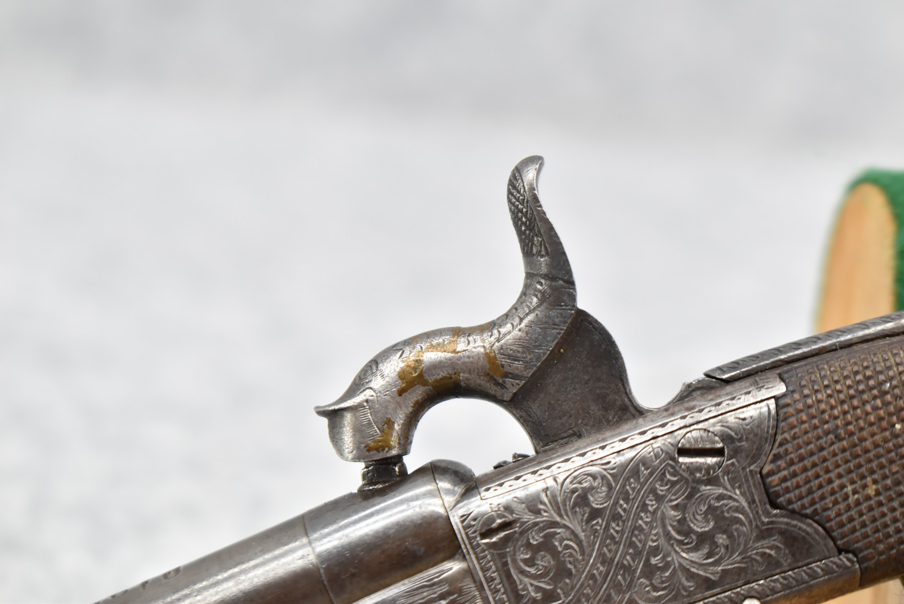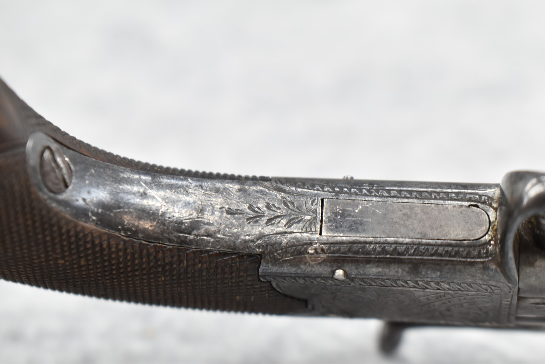 373. Early! Weatherhead-Walters & Co. – 36 Cal. Black Powder Percussion Over-Under Swivel Breech Pistol – w/2” Barrels – Gray Finish – w/Lightly Scroll Engraved Receiver – w/Checkered Wood Pistol Grip – w/Dolphin Head Hammer – w/Folding Trigger – Excellent Example