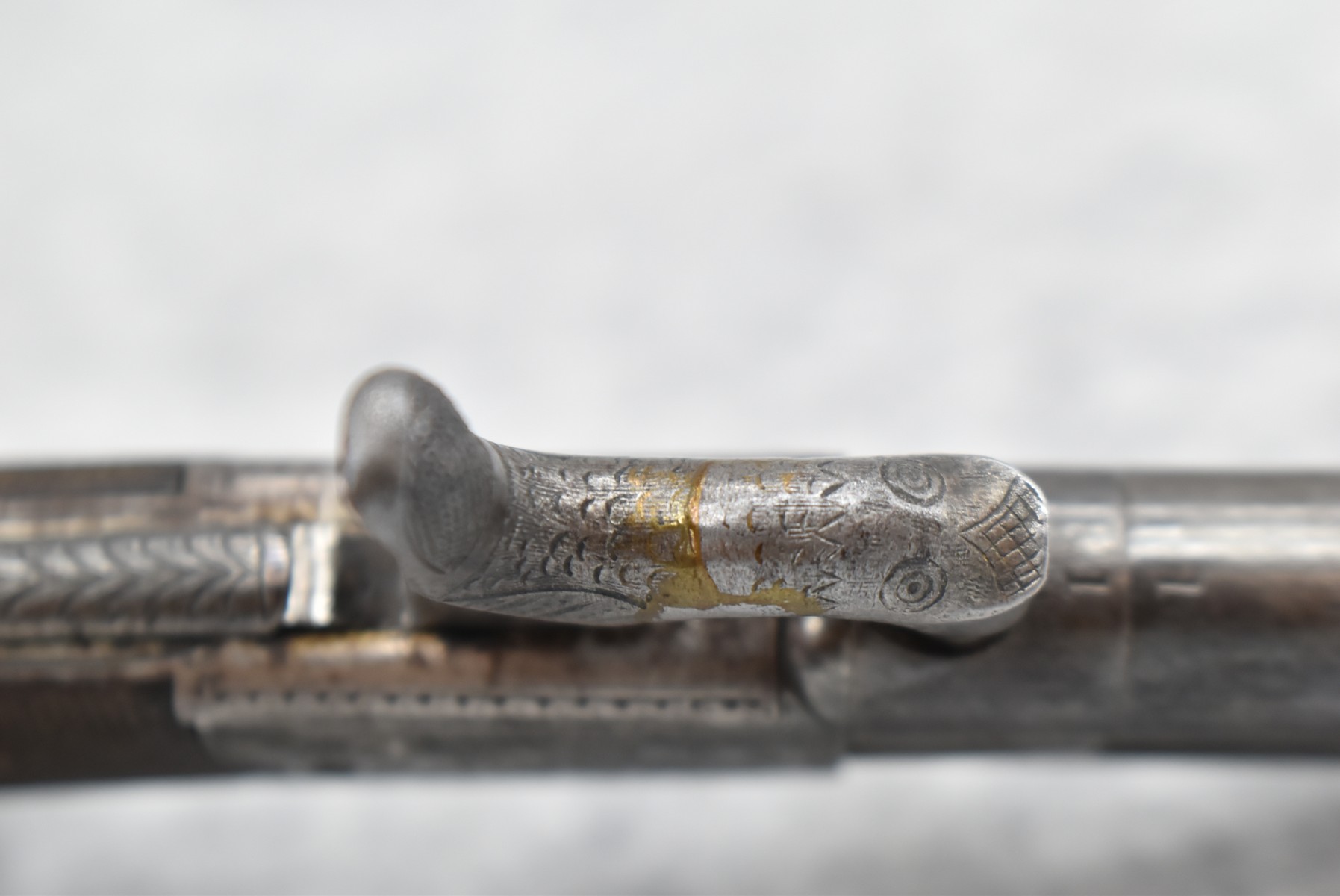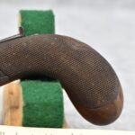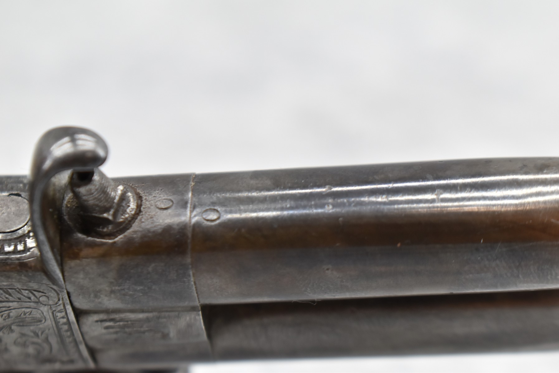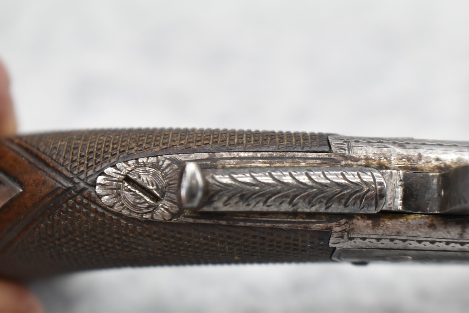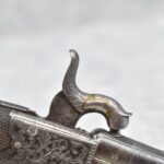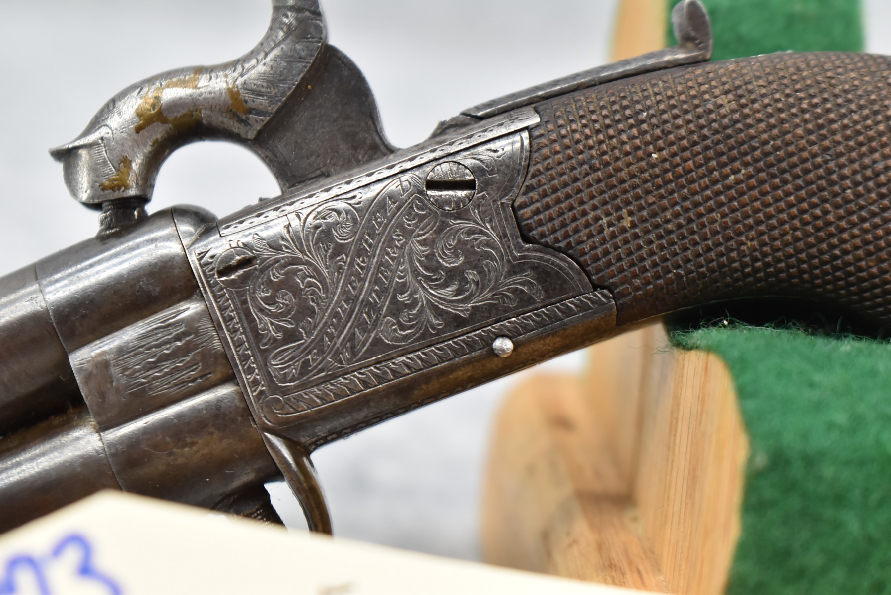 373. Early! Weatherhead-Walters & Co. – 36 Cal. Black Powder Percussion Over-Under Swivel Breech Pistol – w/2” Barrels – Gray Finish – w/Lightly Scroll Engraved Receiver – w/Checkered Wood Pistol Grip – w/Dolphin Head Hammer – w/Folding Trigger – Excellent Example