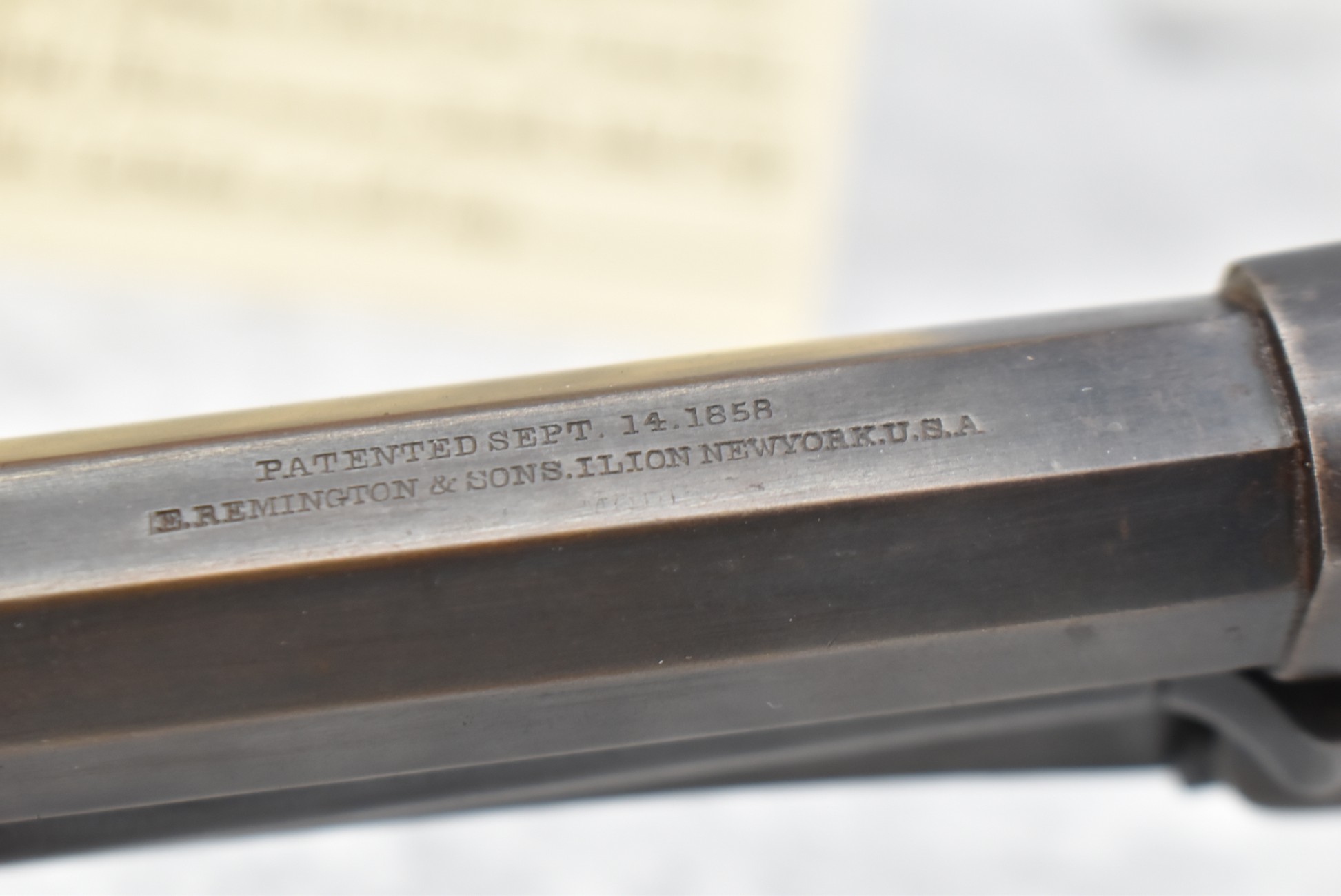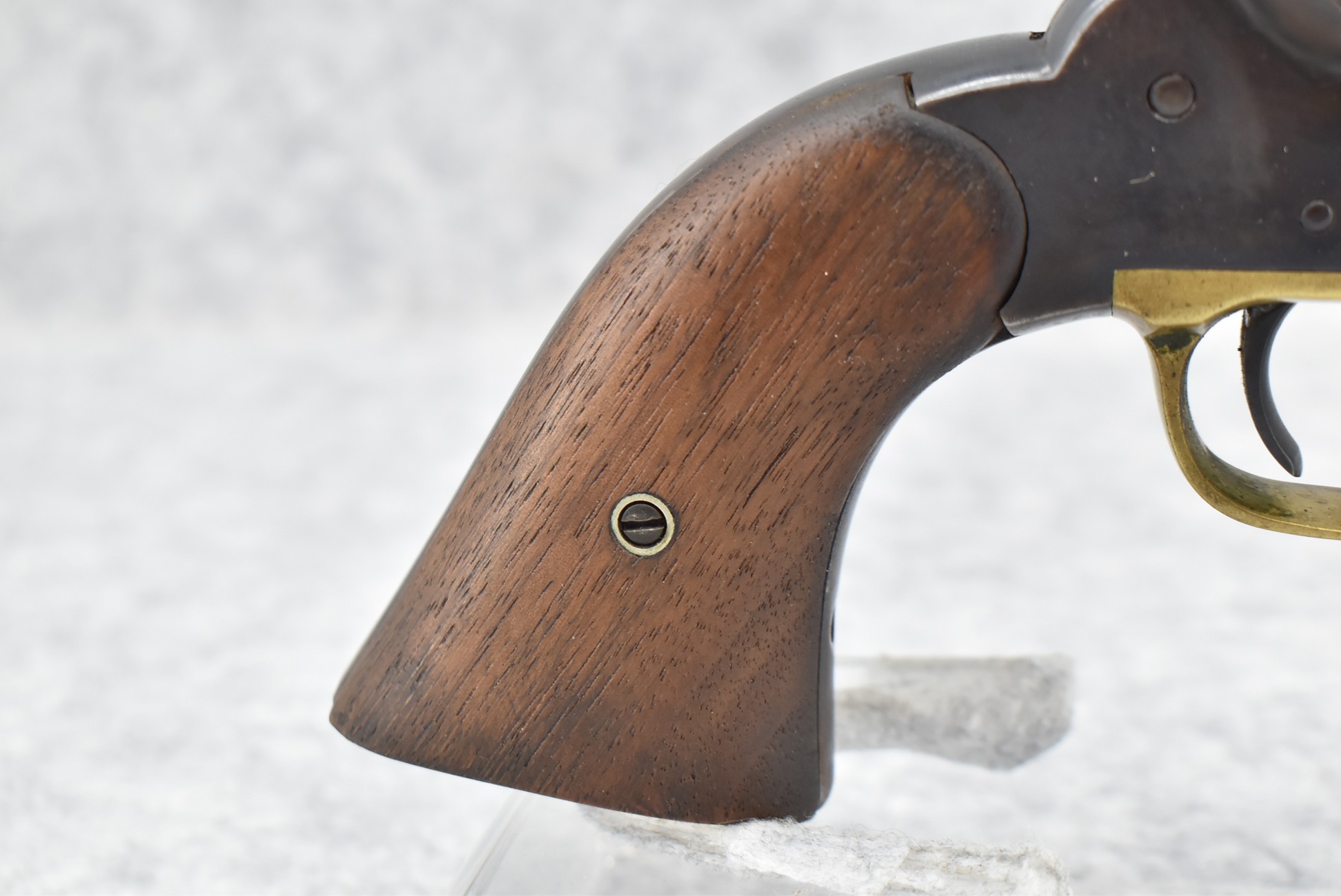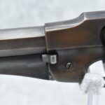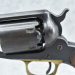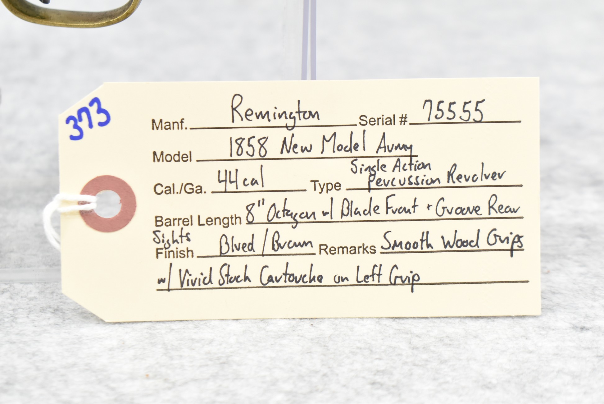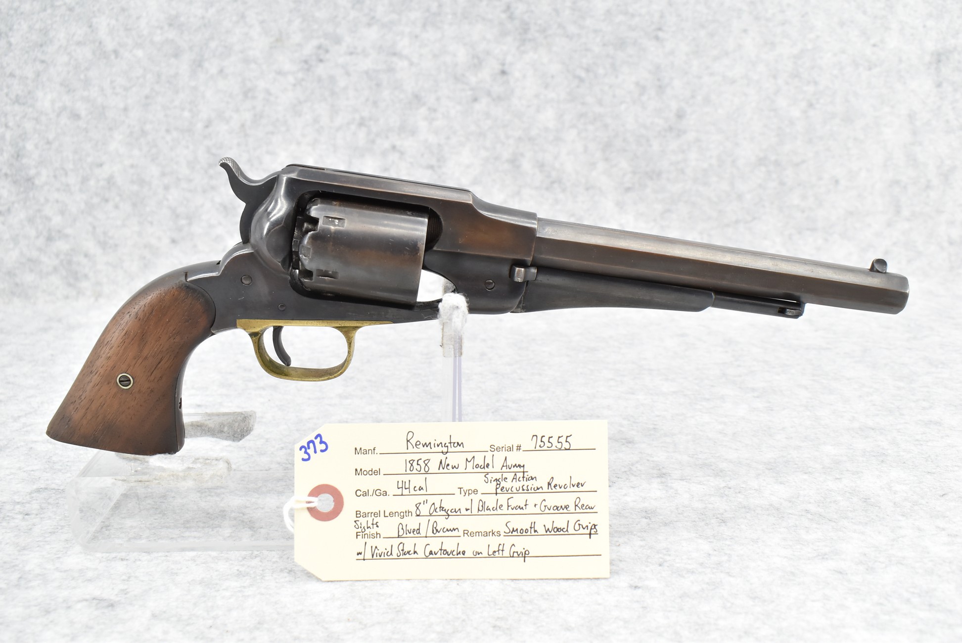 373. Remington – Mod. 1858 New Model Army – 44 Cal. Percussion Single Action Revolver – w/8” Octagon Barrel w/Blade Front & Groove Rear Sights – Blued/Brown Finish – w/Smooth Wood Grips w/Vivid Stock Cartouche on Left Grip