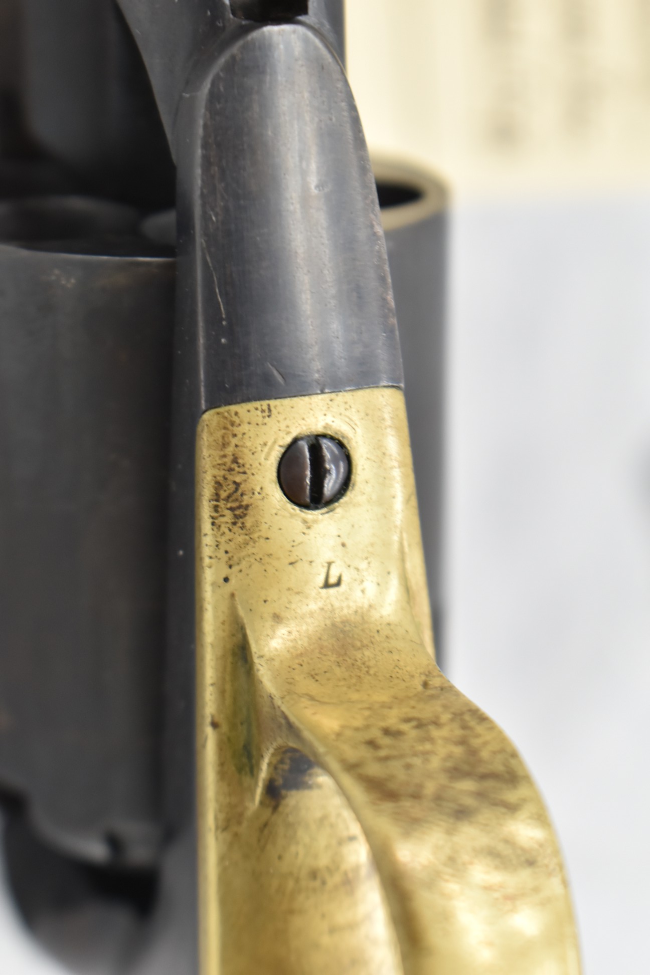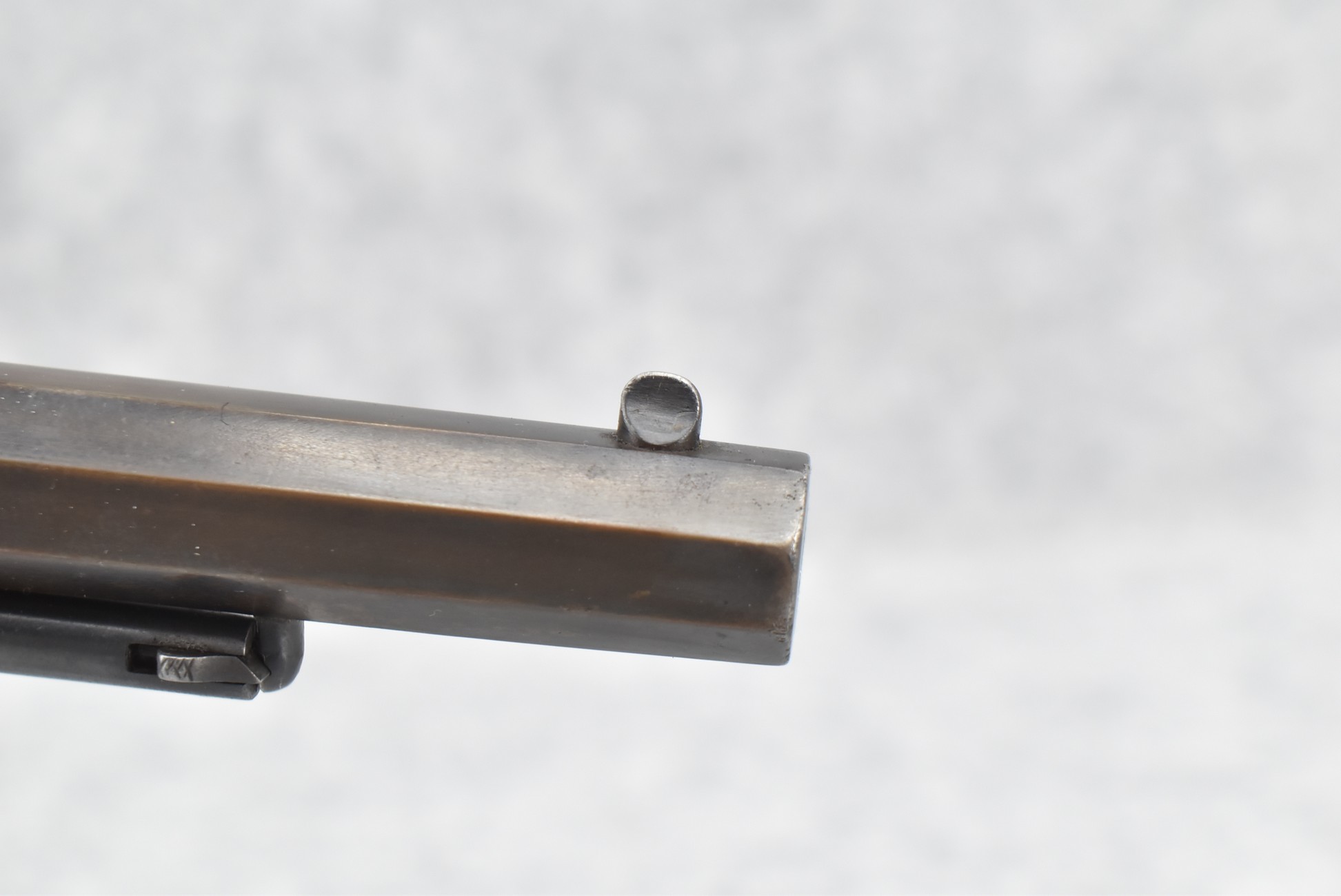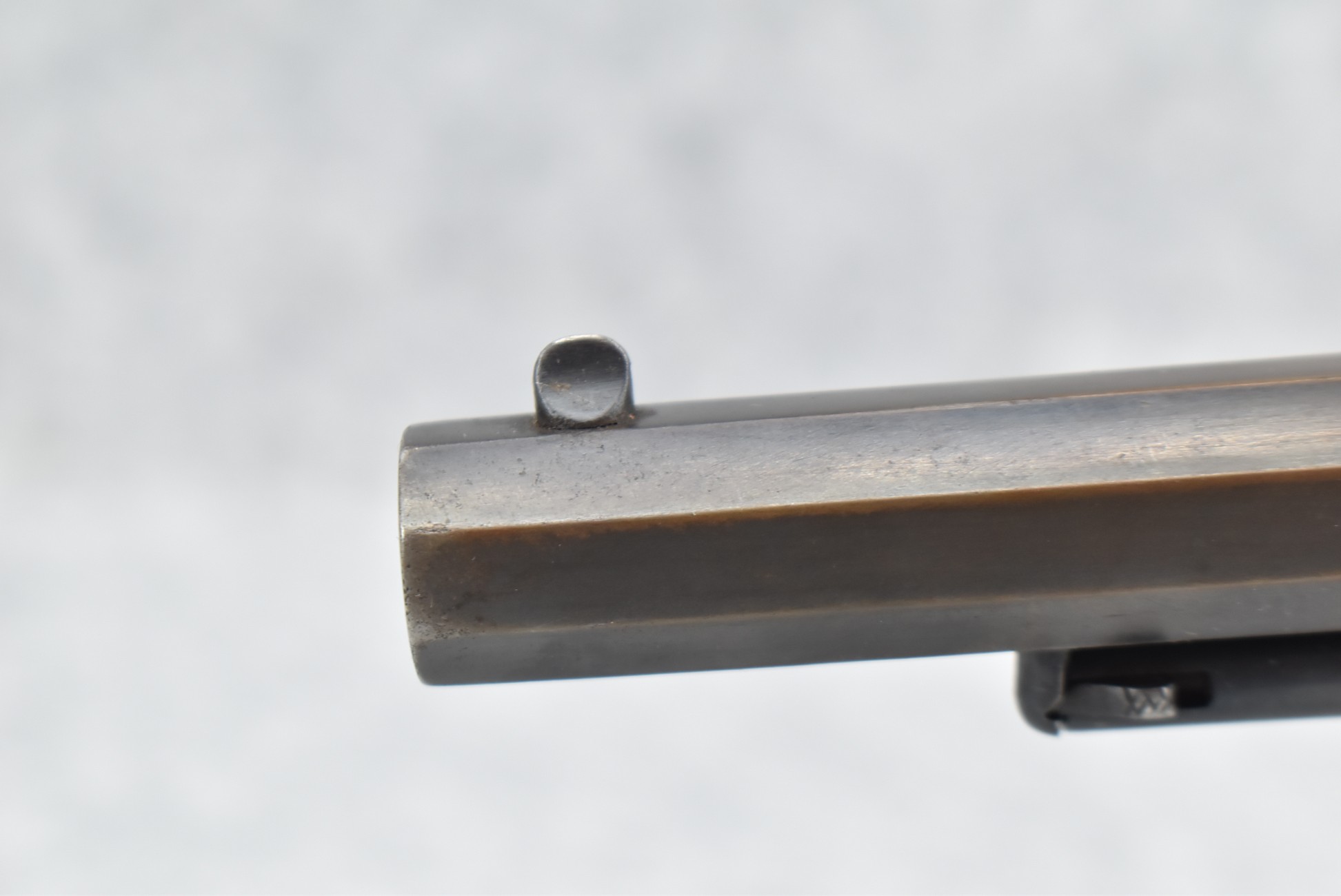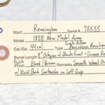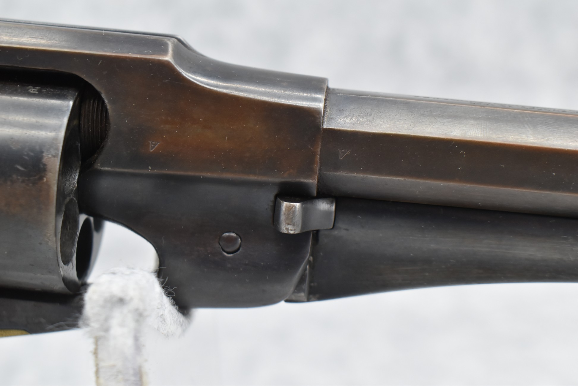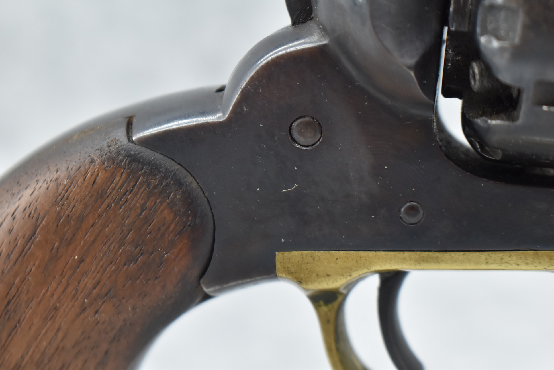 373. Remington – Mod. 1858 New Model Army – 44 Cal. Percussion Single Action Revolver – w/8” Octagon Barrel w/Blade Front & Groove Rear Sights – Blued/Brown Finish – w/Smooth Wood Grips w/Vivid Stock Cartouche on Left Grip