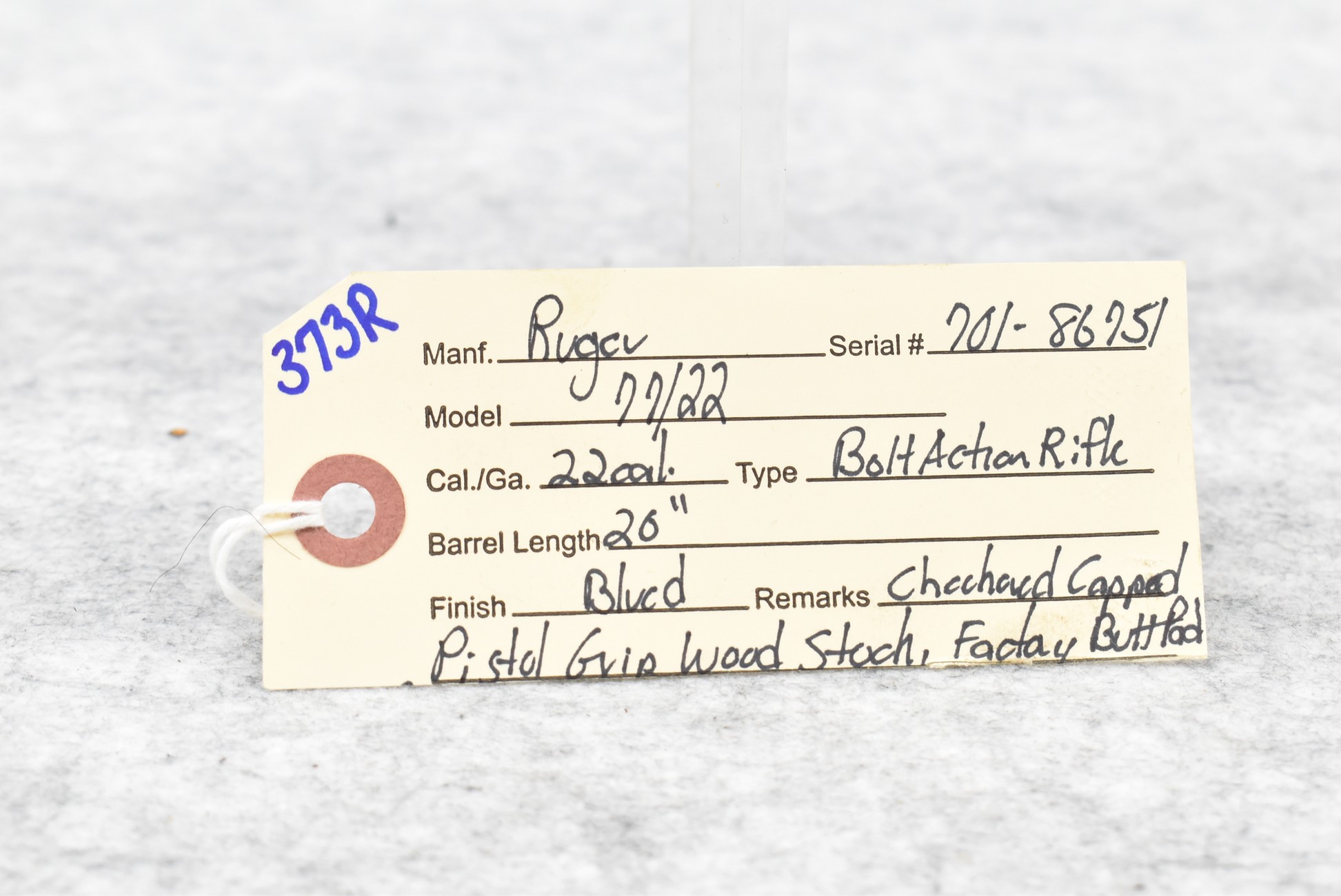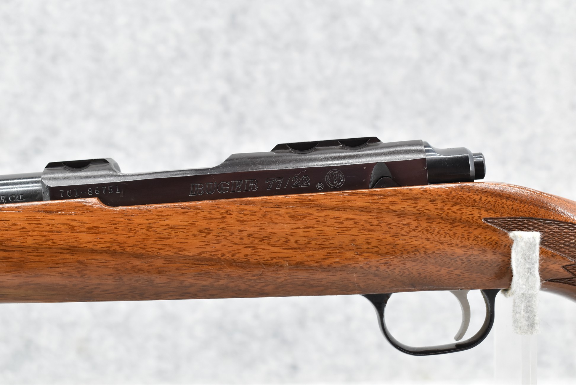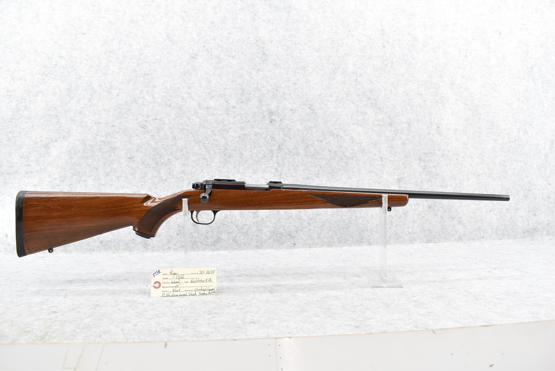 373R. Ruger – Mod. 77/22 – 22 Cal. Bolt Action Rifle – w/20” Barrel – Blued Finish – w/Checkered Capped Pistol Grip Wood Stock w/Factory Butt Pad – w/Clip