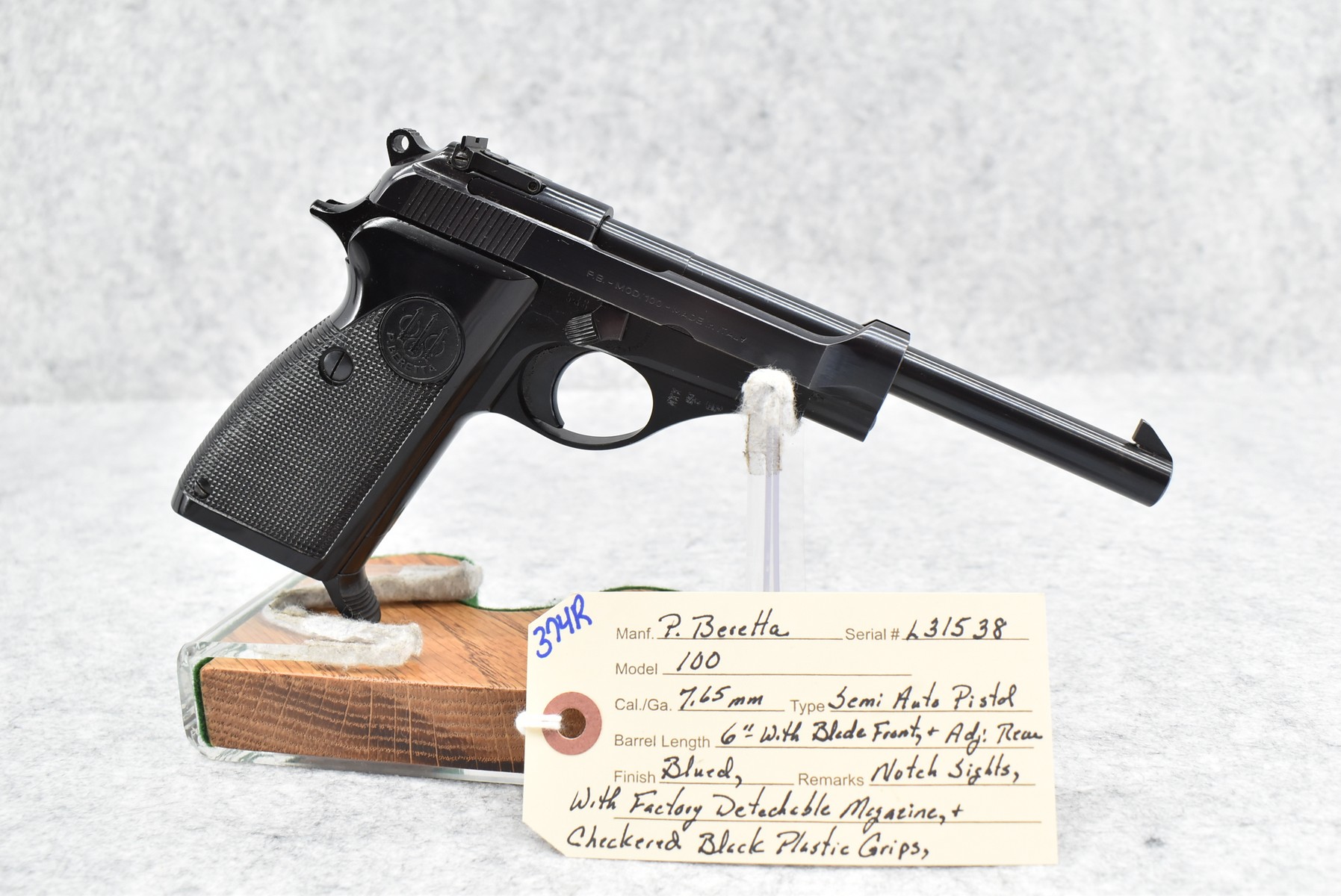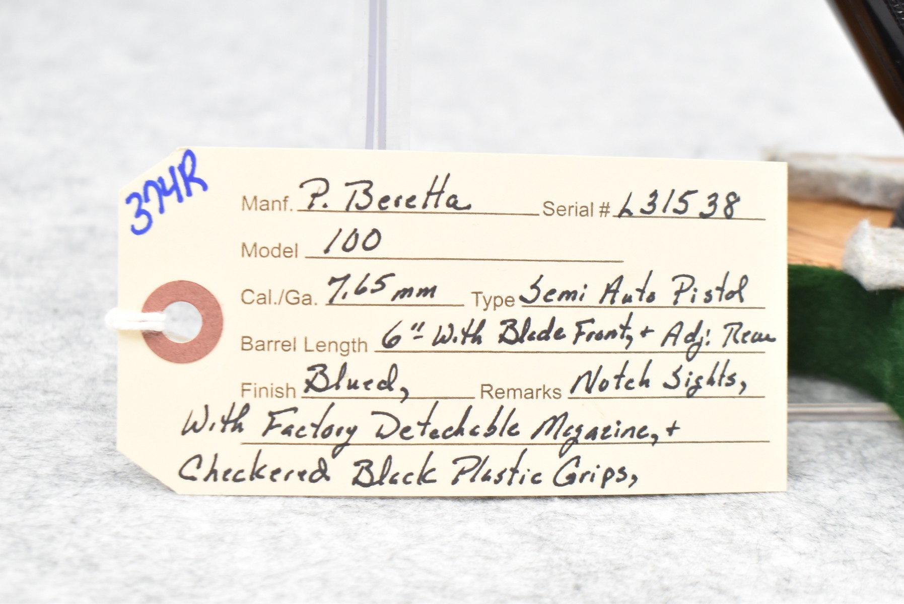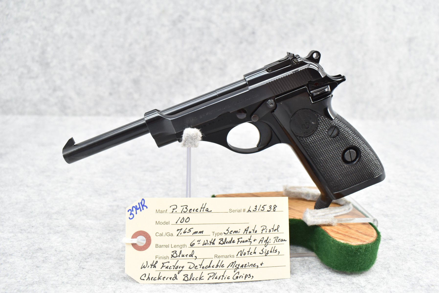 374R. Beretta – Mod. 100 – 7.65mm Cal. Semi-Auto Pistol – w/6” Barrel w/Blade Front and Adjustable Rear Notch Sights – Blued Finish – w/Checkered Black Plastic Grips – w/Factory Detachable Magazine