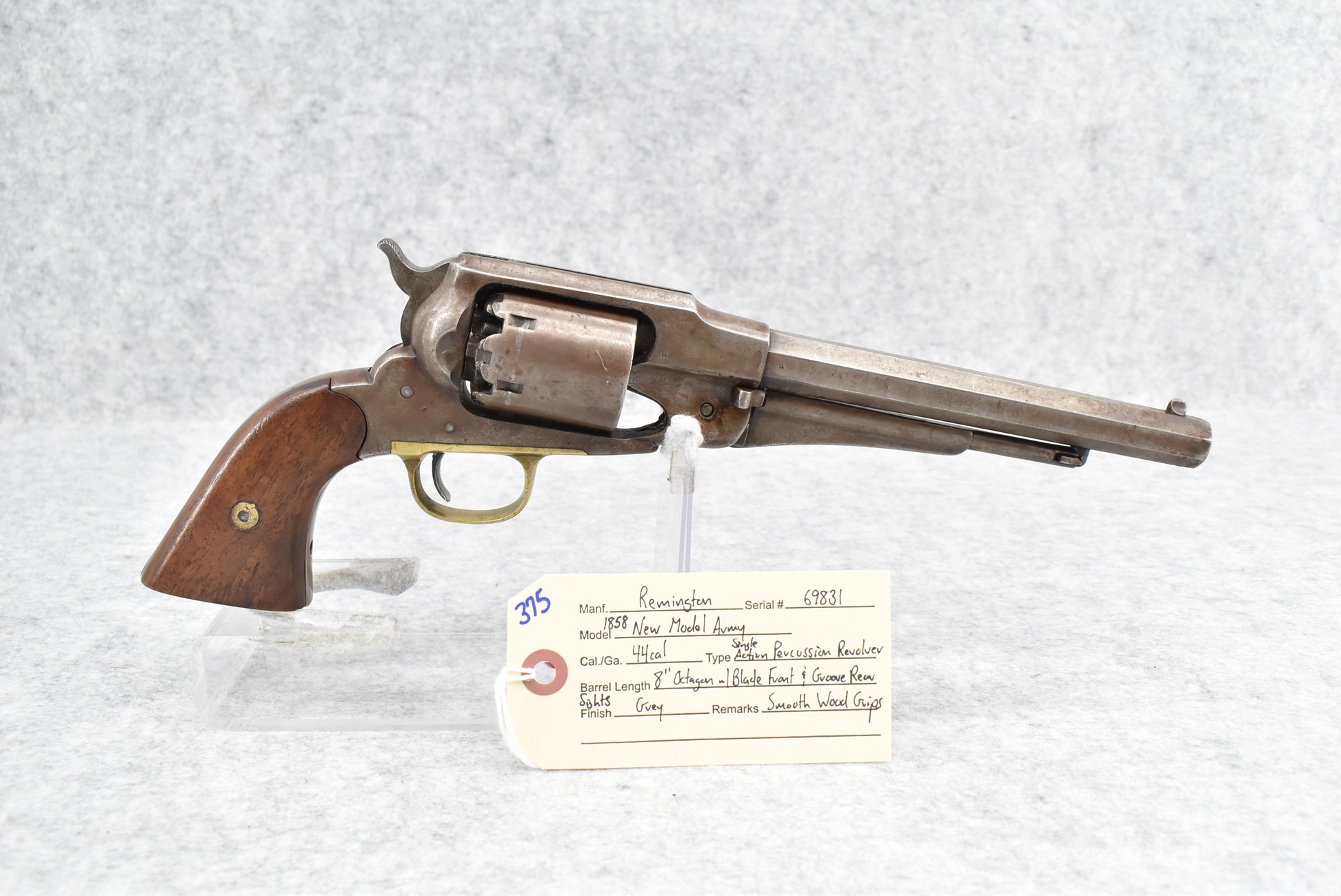 375. Remington – Mod. 1858 New Model Army – 44 Cal. Percussion Single Action Revolver – w/8” Octagon Barrel w/Blade Front & Groove Rear Sights – Gray Finish – w/Smooth Wood Grips
