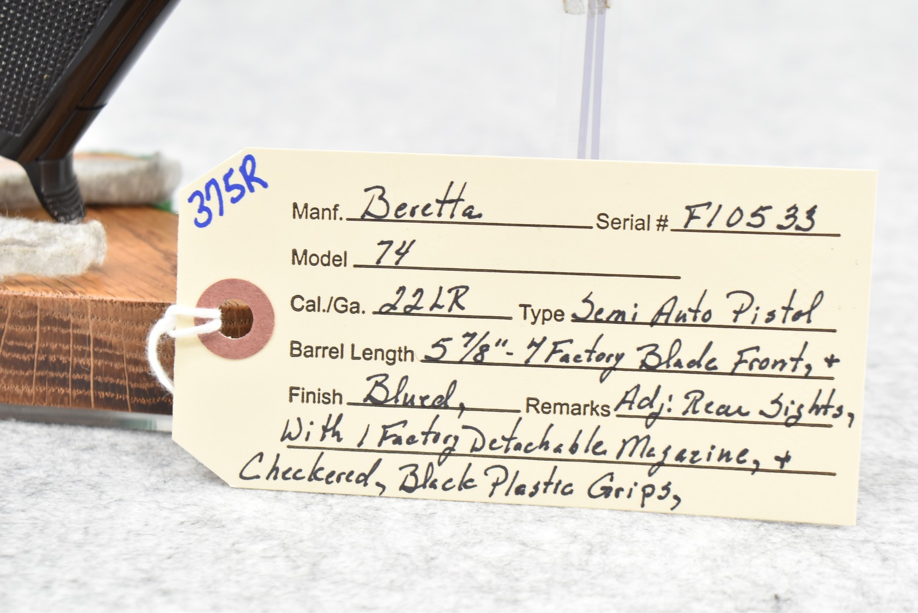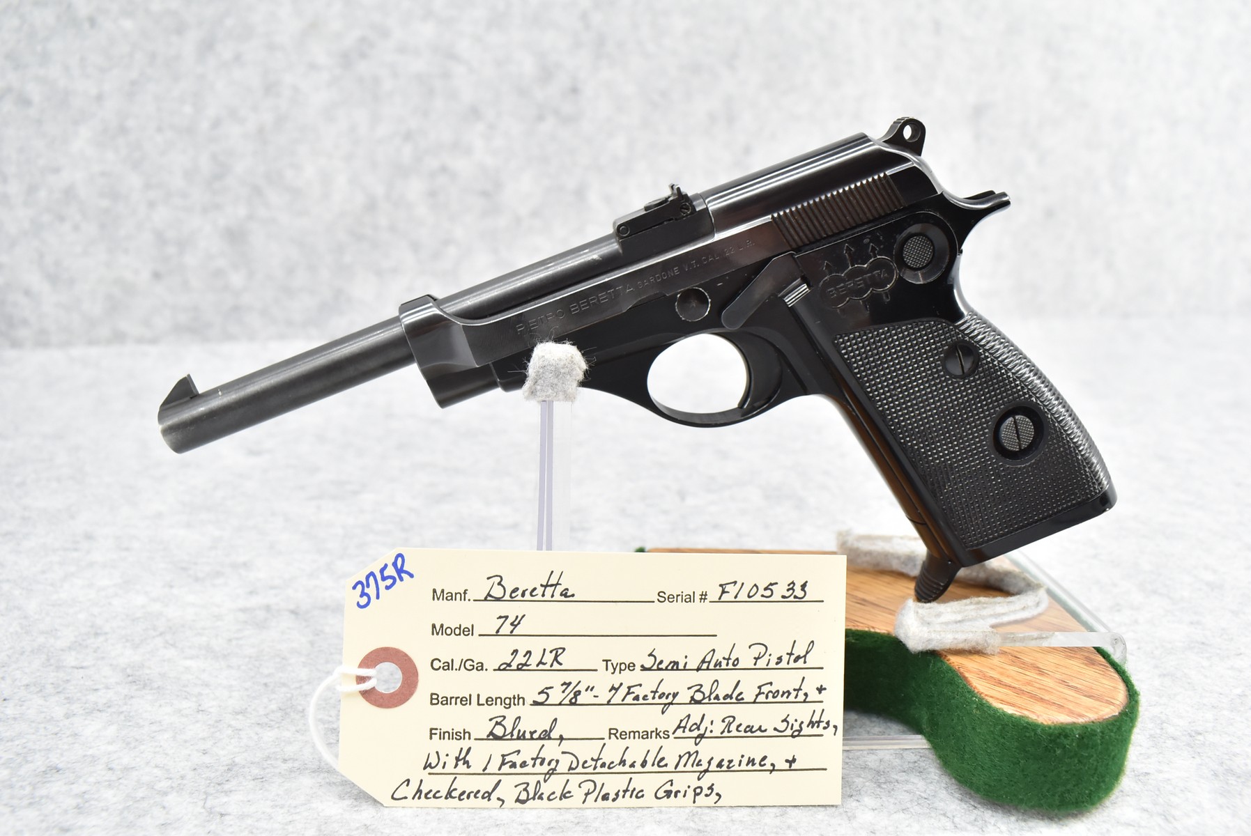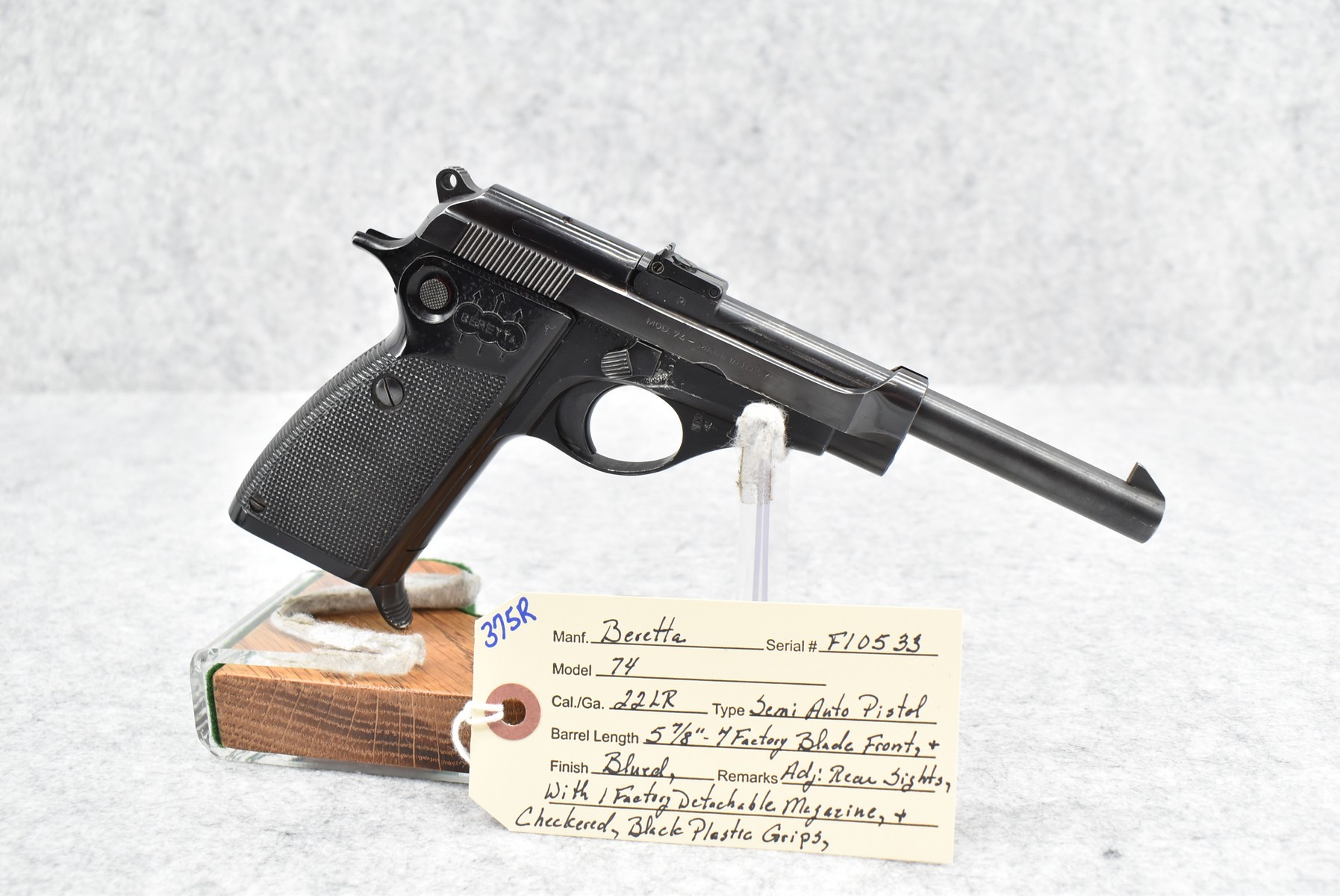 375R. Beretta – Mod. 74 – 22LR Cal. Semi-Auto Pistol – w/5 7/8” Barrel w/Factory Blade Front and Adjustable Rear Sights – Blued Finish – w/Checkered Black Plastic Grips – w/1 Factory Detachable Magazine