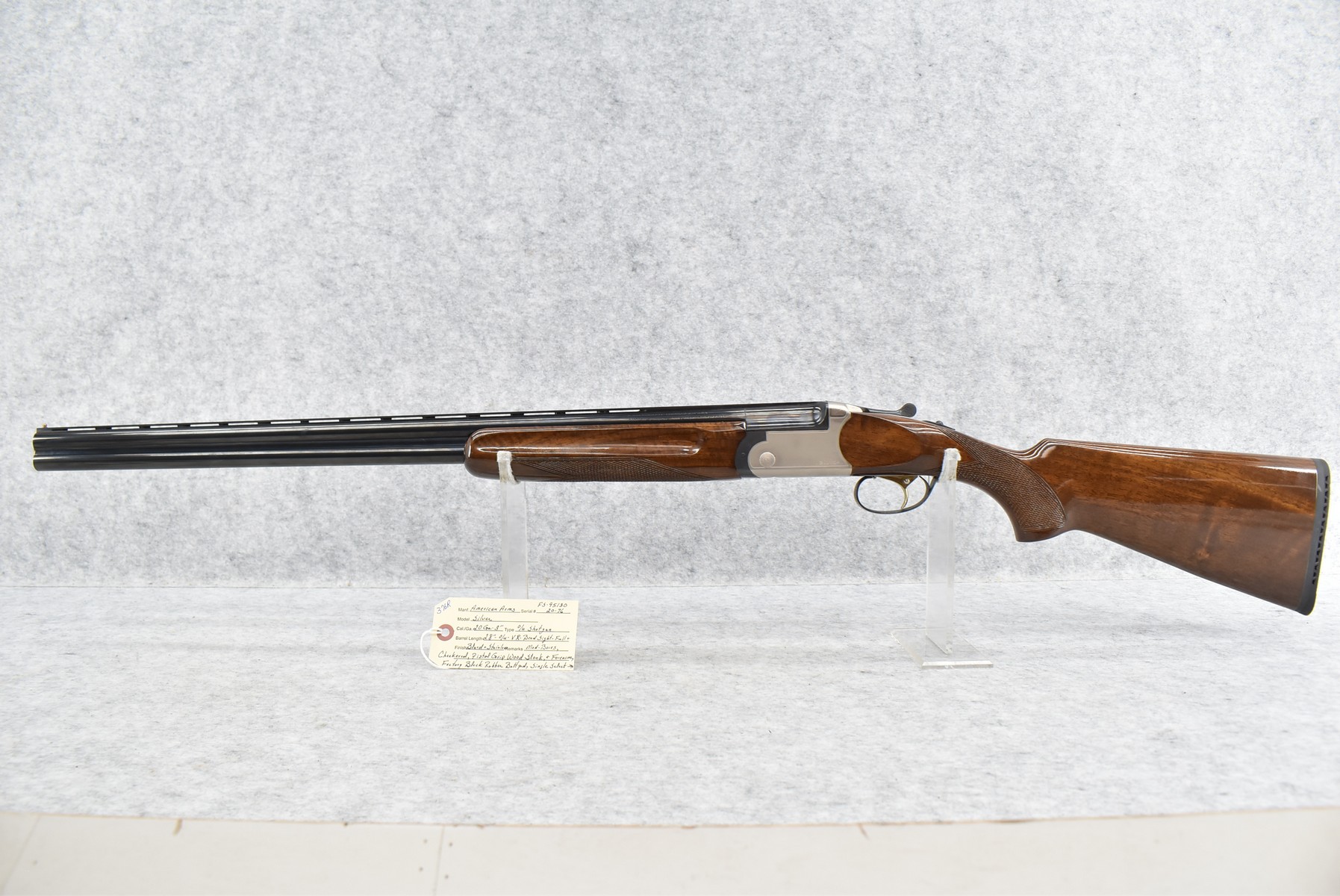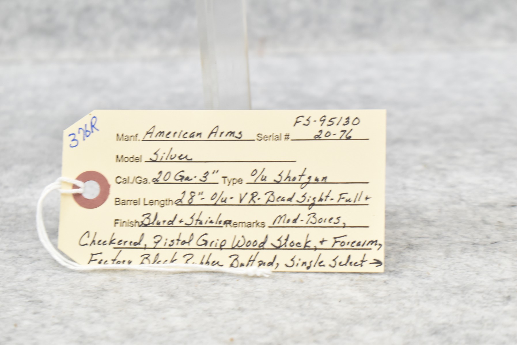 376R. American Arms – Mod. Silver – 20ga. 3” Over-Under Shotgun – w/28” Full & Mod. Choked, Vent-Rib Barrels w/Bead Sight – Blued/Stainless Finish – w/Checkered Pistol Grip Wood Stocks w/Factory Butt Pad – w/Single Select Trigger