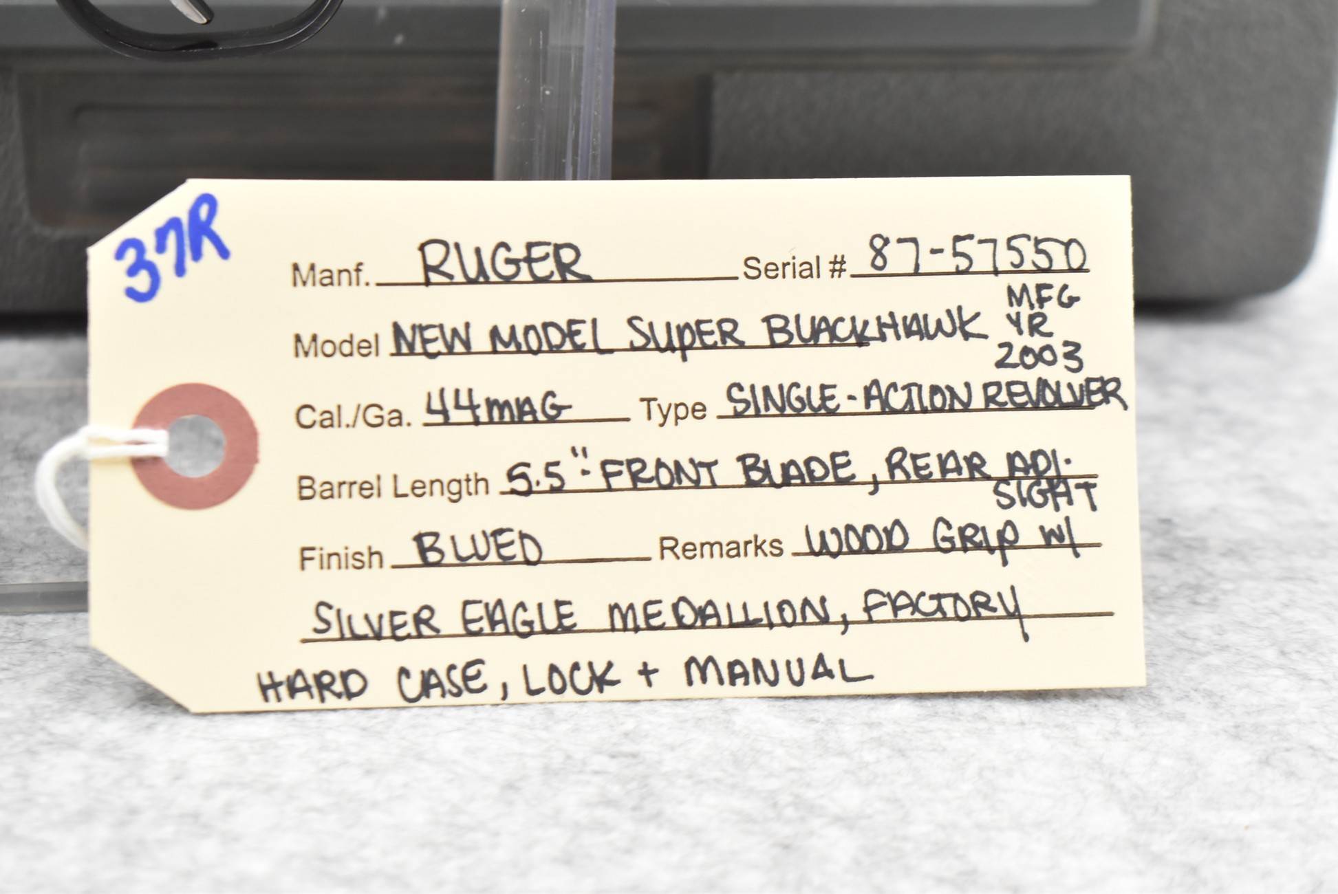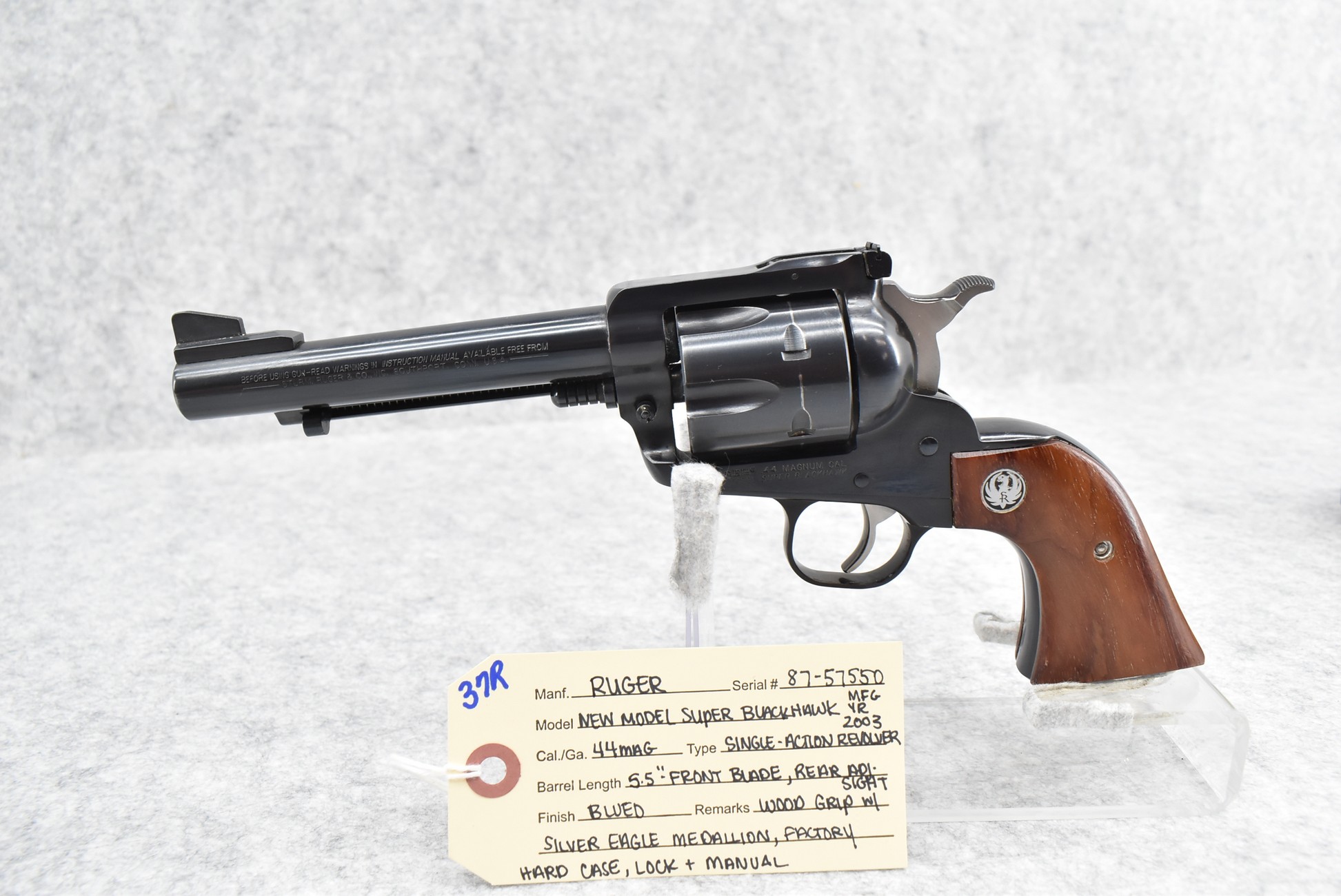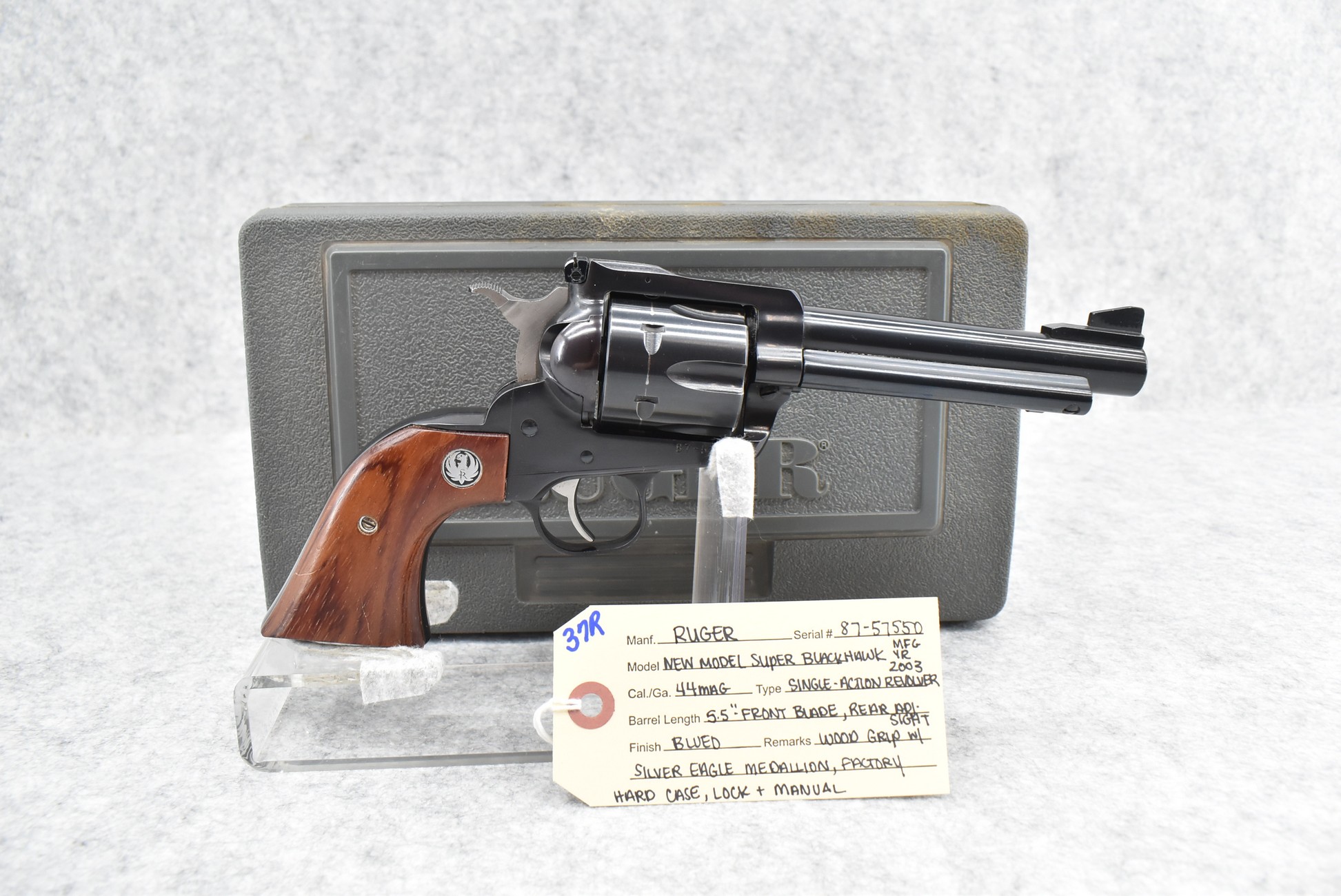 37R. Ruger – Mod. New Model Super Blackhawk – 44 Mag. Cal. Single Action Revolver – w/5½” Barrel w/Blade Front and Adjustable Rear Sights – Blued Finish – w/Wood Grips w/Silver Eagle Medallion – Manufactured 2003 – w/Factory Hard Case and Manual