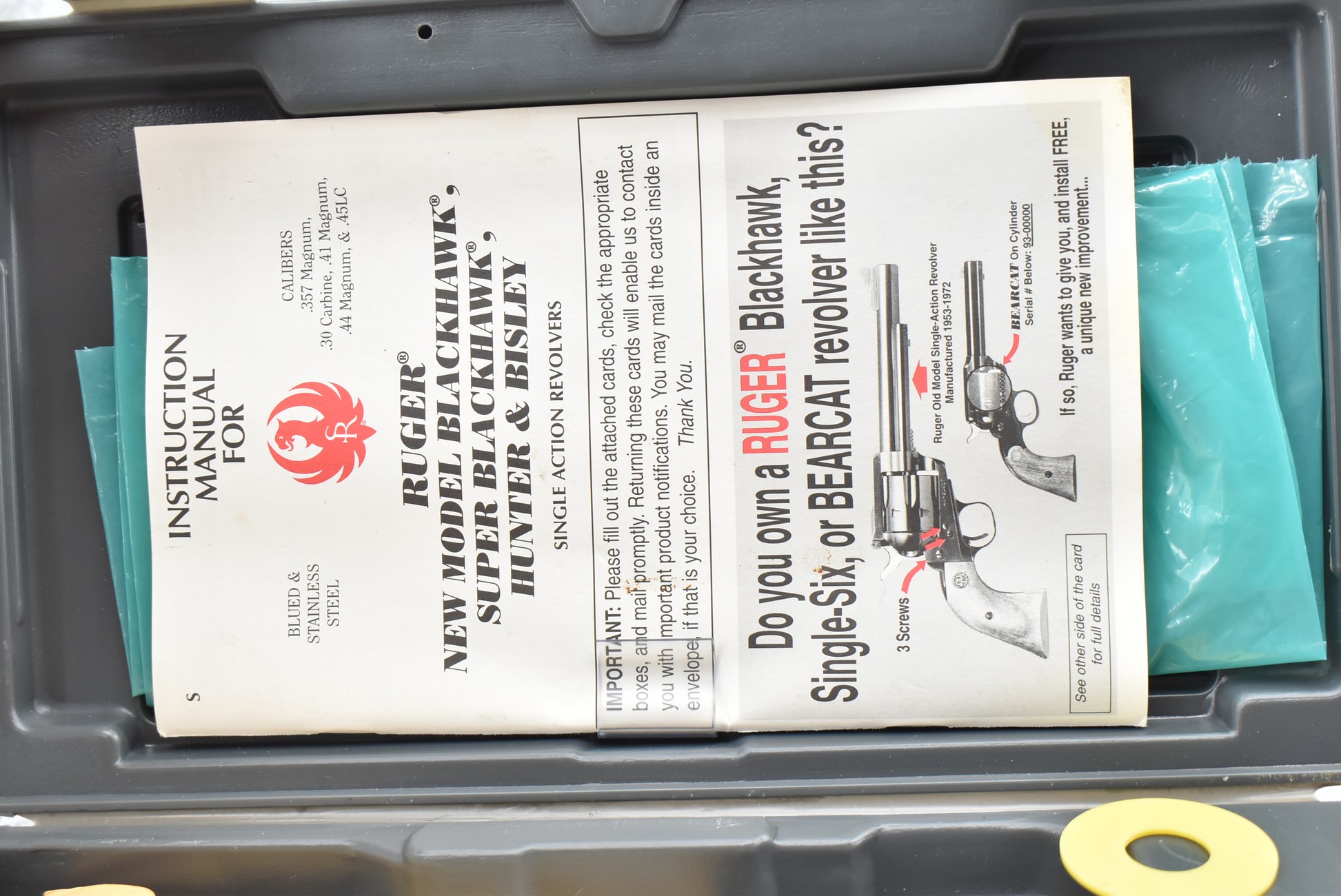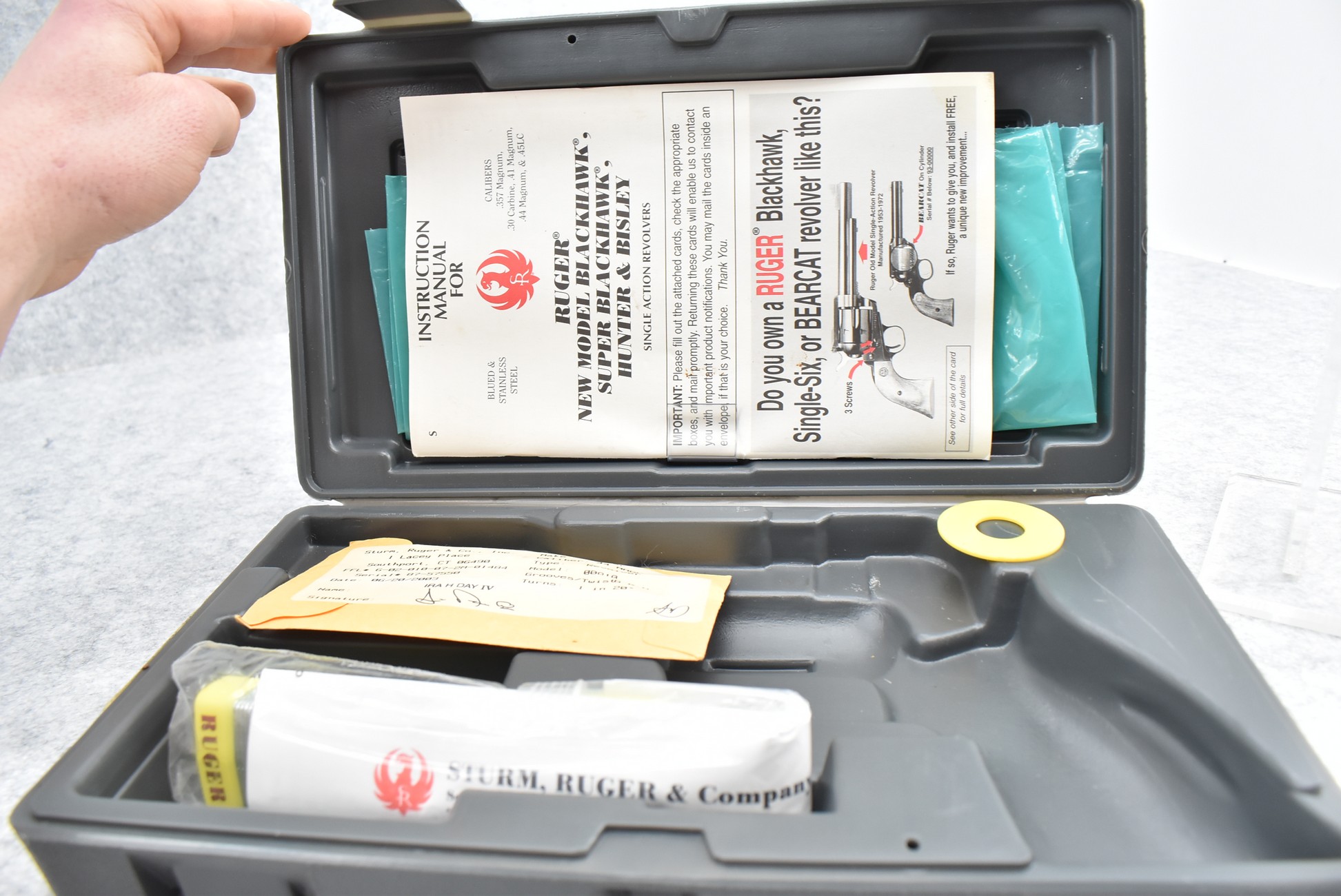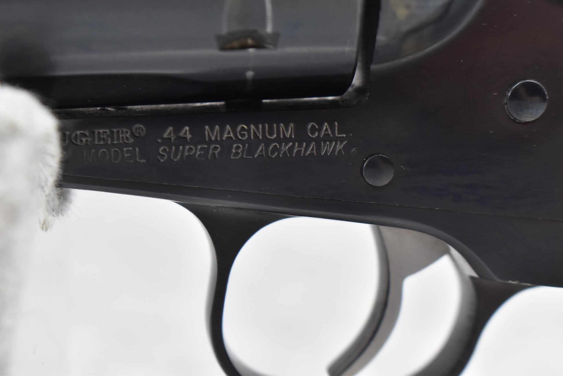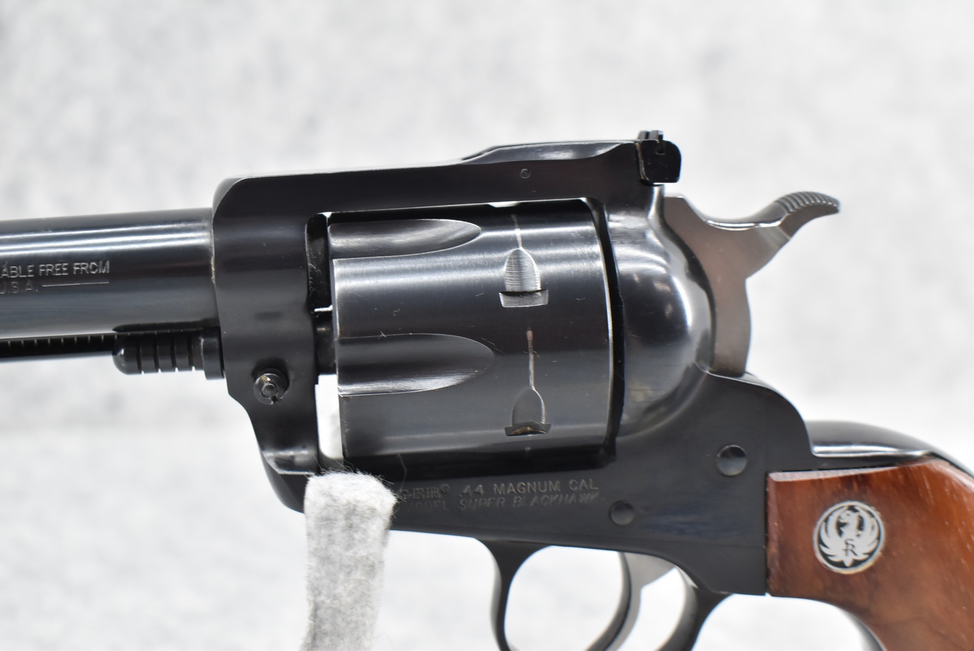 37R. Ruger – Mod. New Model Super Blackhawk – 44 Mag. Cal. Single Action Revolver – w/5½” Barrel w/Blade Front and Adjustable Rear Sights – Blued Finish – w/Wood Grips w/Silver Eagle Medallion – Manufactured 2003 – w/Factory Hard Case and Manual