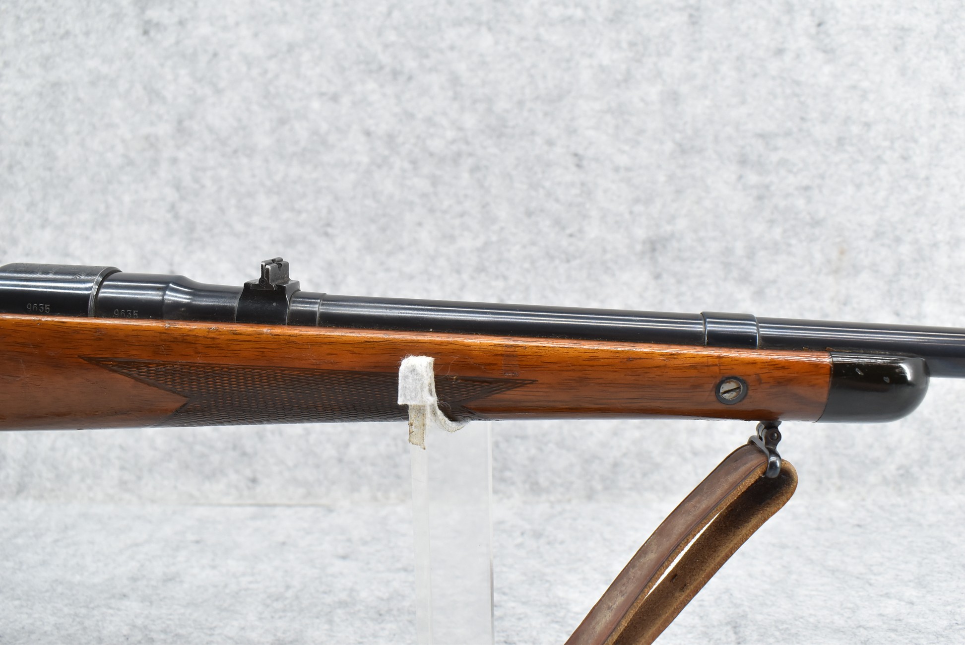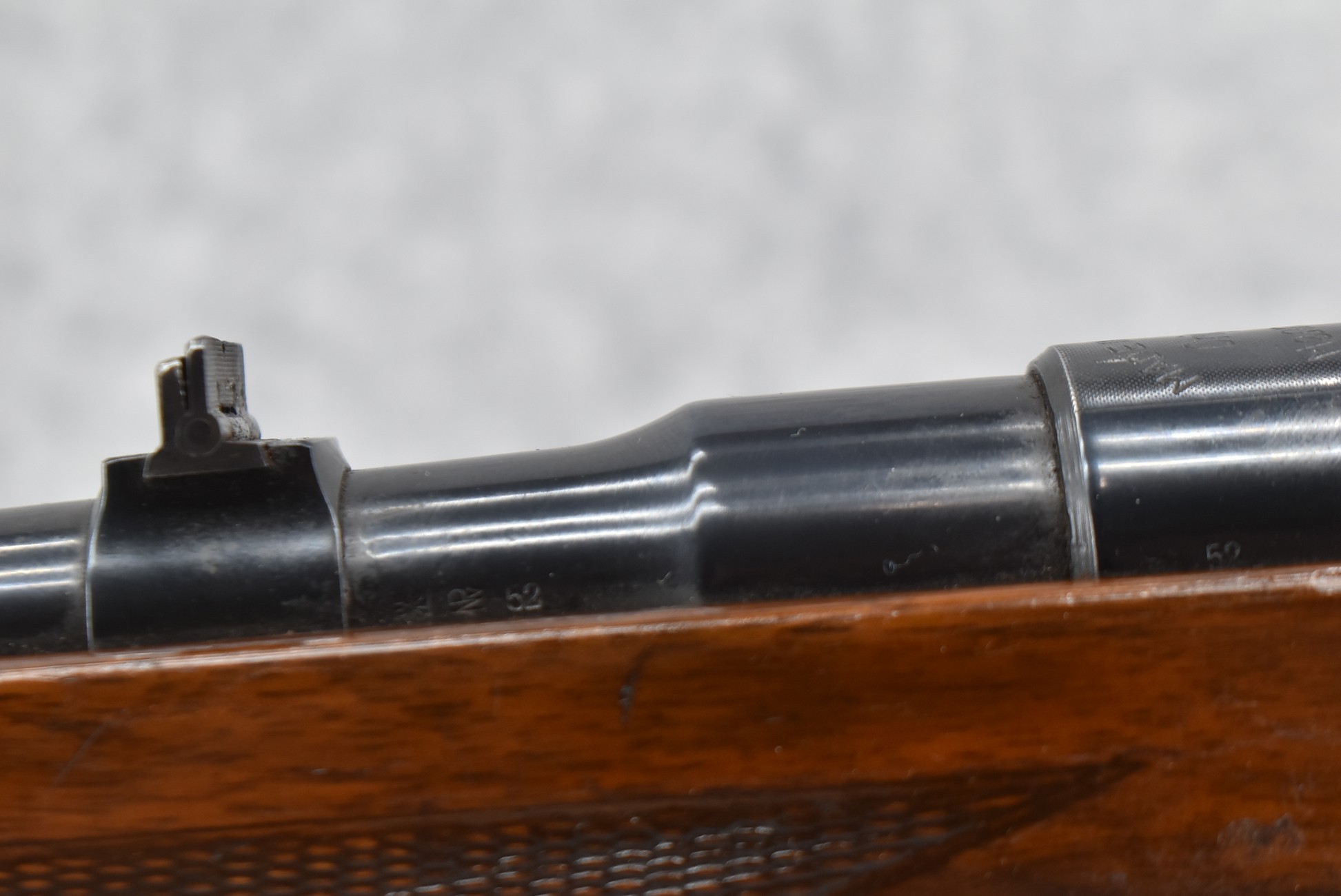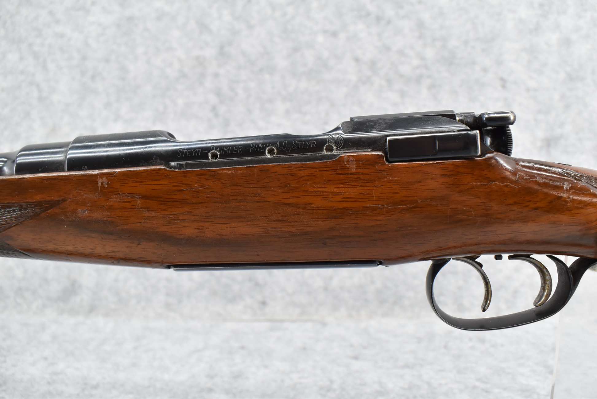37R. Steyr – Mod. 50 Mannlicher-Schoenauer – 30-06 Cal. Bolt Action Rifle – w/24” Barrel w/Beaded Front & 2-Leaf Rear Sights – Blued Finish – w/Checkered Capped Pistol Grip Wood Stock w/Factory Butt Plate – w/Double Set Triggers – Receiver Had Been Side Drilled & Tapped