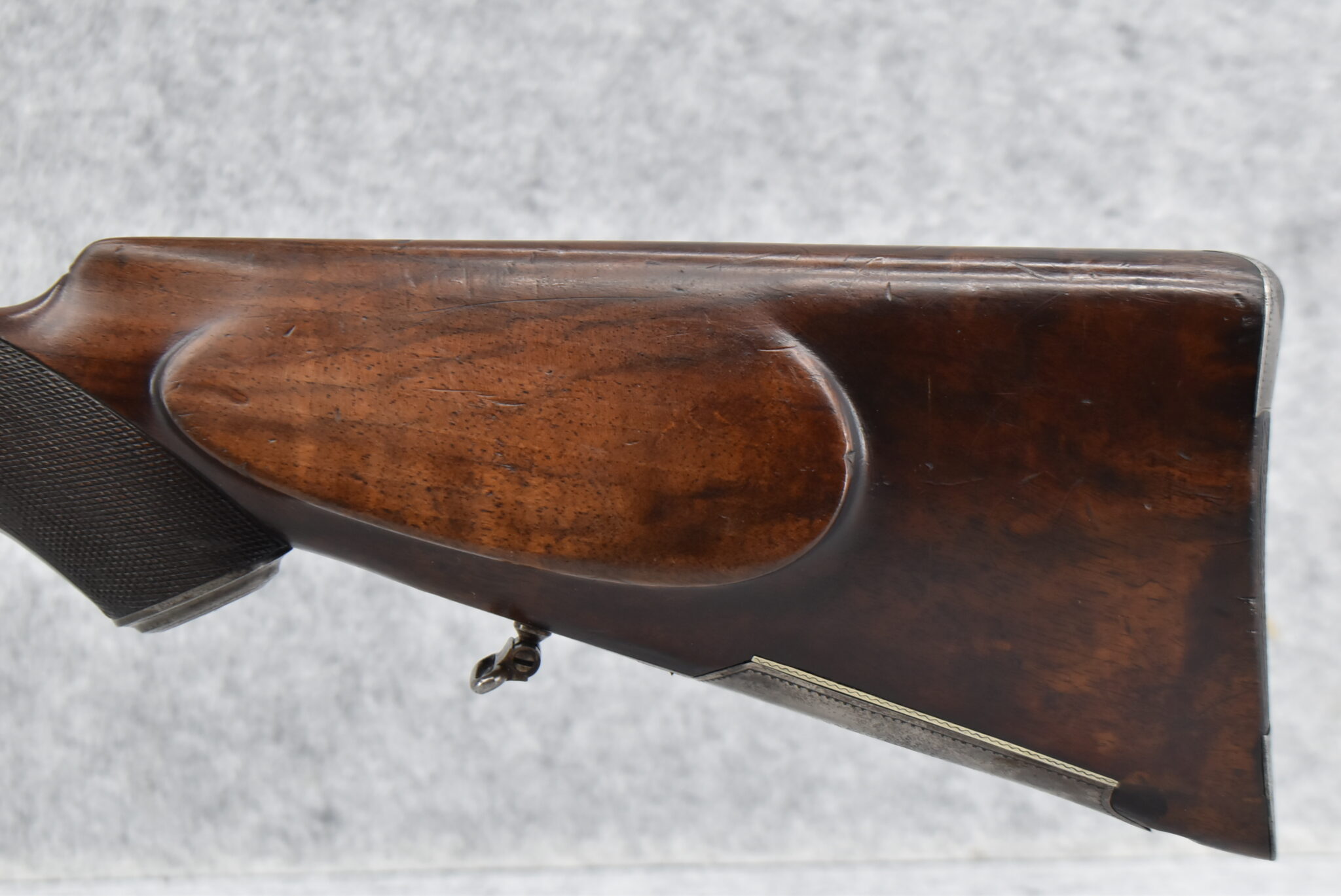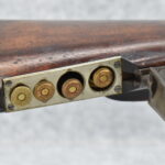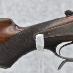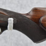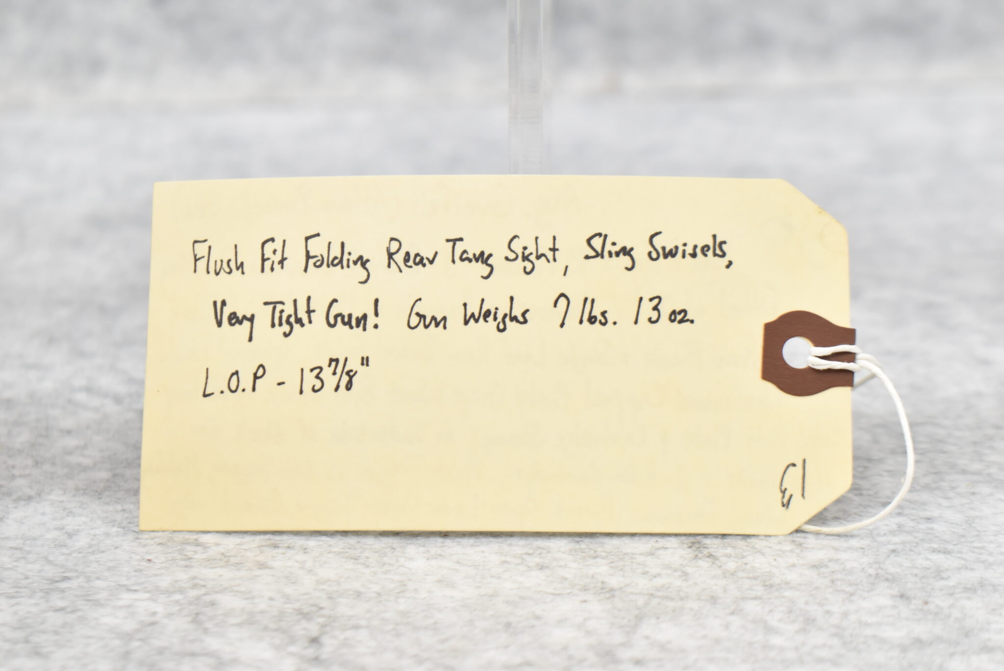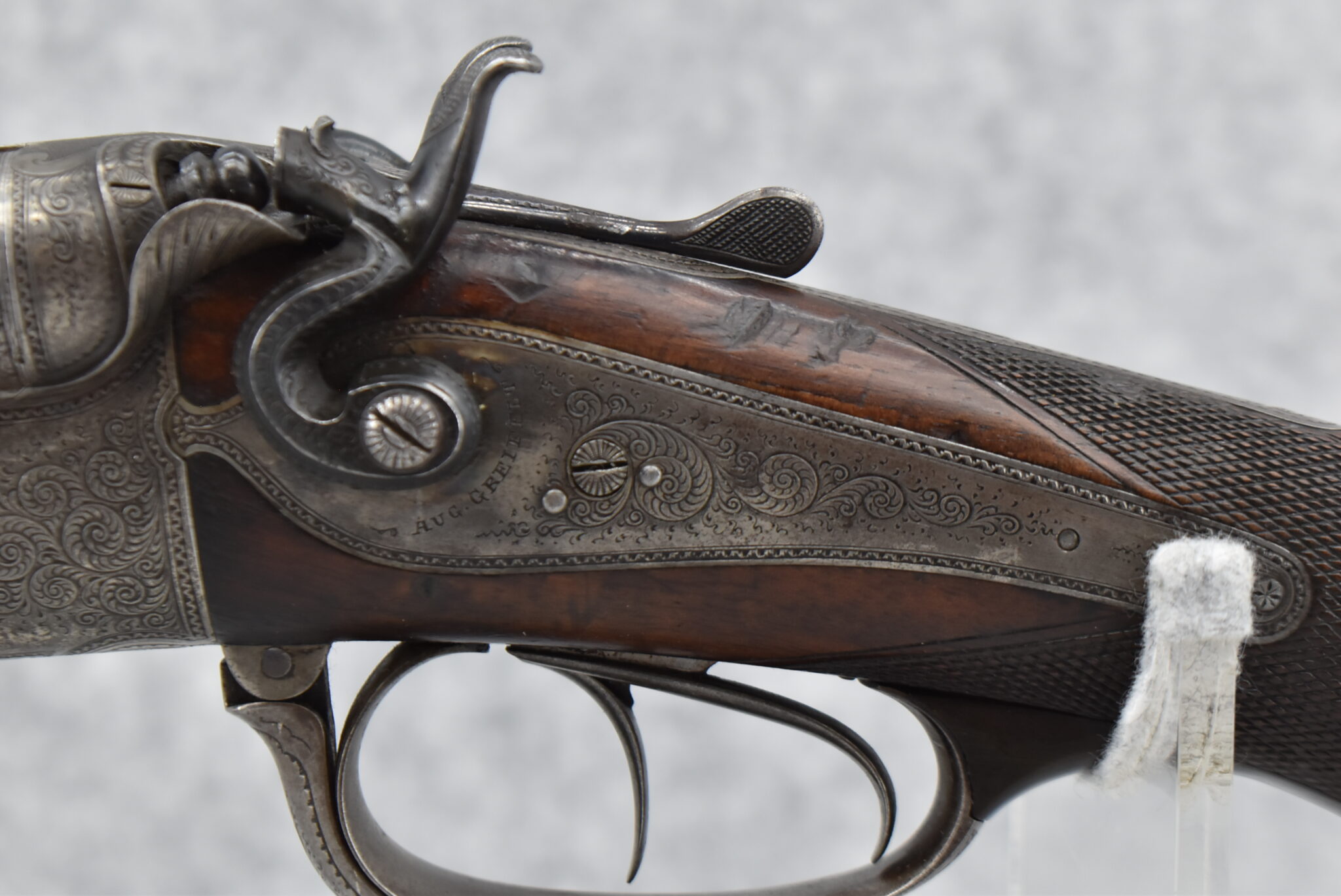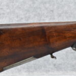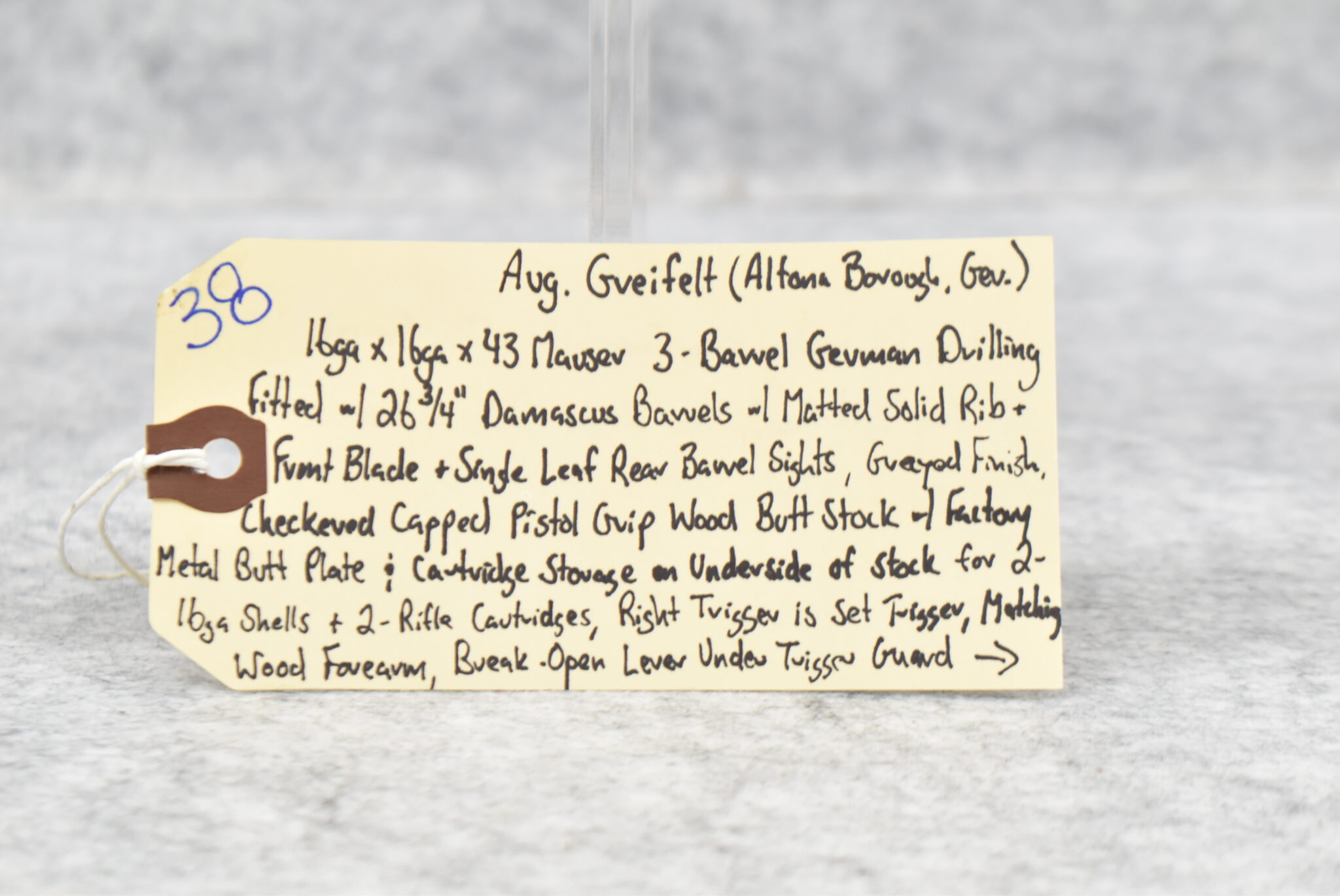 38. Aug. Greifelt (Altona Borough, Ger.) – 16ga. X 16ga. X 43 Mauser Cal. 3-Barrel German Drilling – Fitted w/26 ¾” Damascus Barrels w/Matted Solid Rib & Front Blade & Single Leaf Rear Barrel Sights – Grayed Finish – w/Checkered Capped Pistol Grip Wood Butt Stock w/Factory Metal Butt Plate w/Cartridge Storage on Underside of Stock for Two 16ga. Shells & Two Rifle Cartridges w/Matching Wood Forearm – w/Double Triggers w/the Right Trigger Being a Set Trigger – w/Double Hammers – w/Break-Open Lever Under Trigger Guard – w/Flush Fit Folding Rear Tang Sight – Sling Swivels – Very Tight Gun! – LOP 13 7/8” – Gun Weighs 7lbs. 13oz.