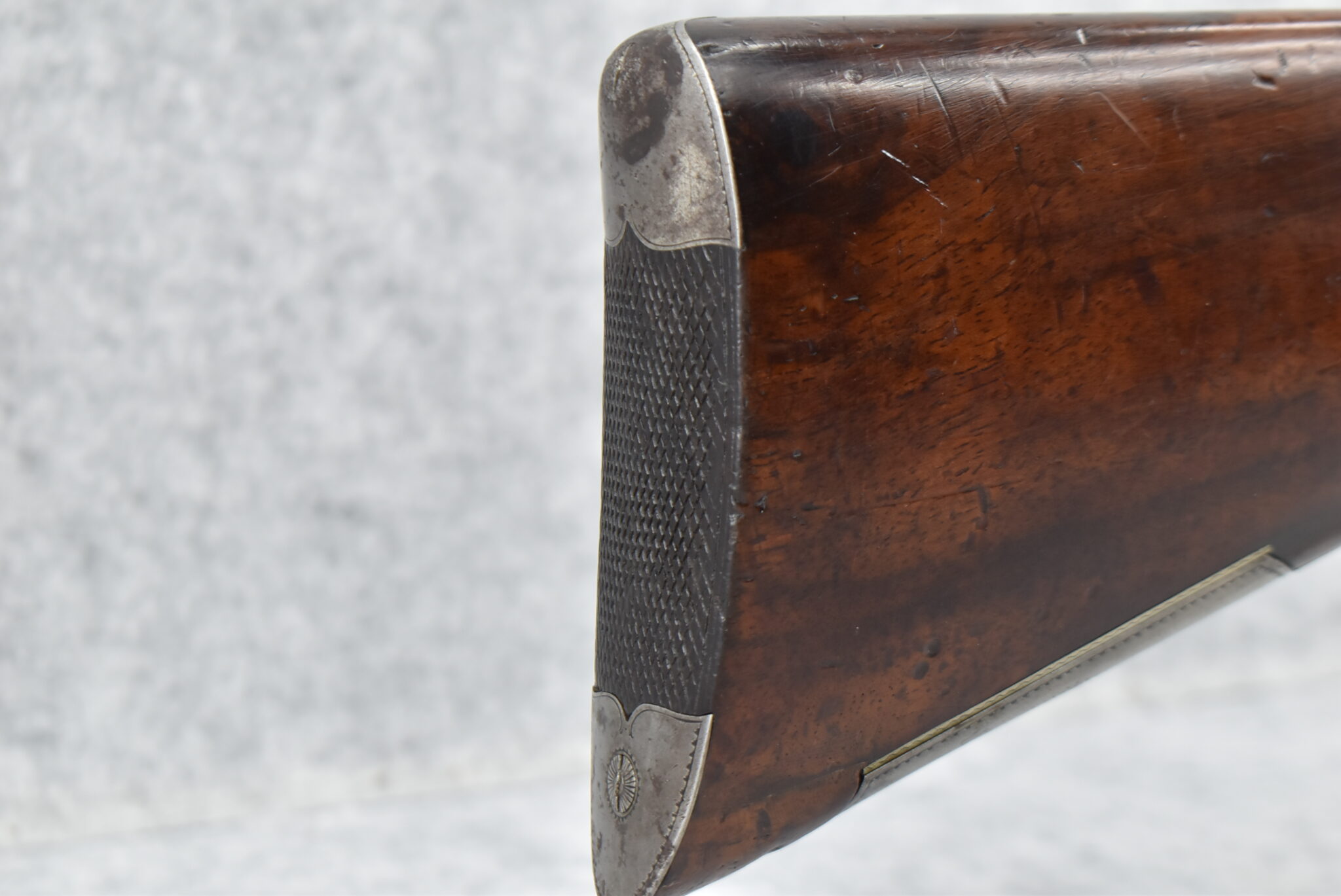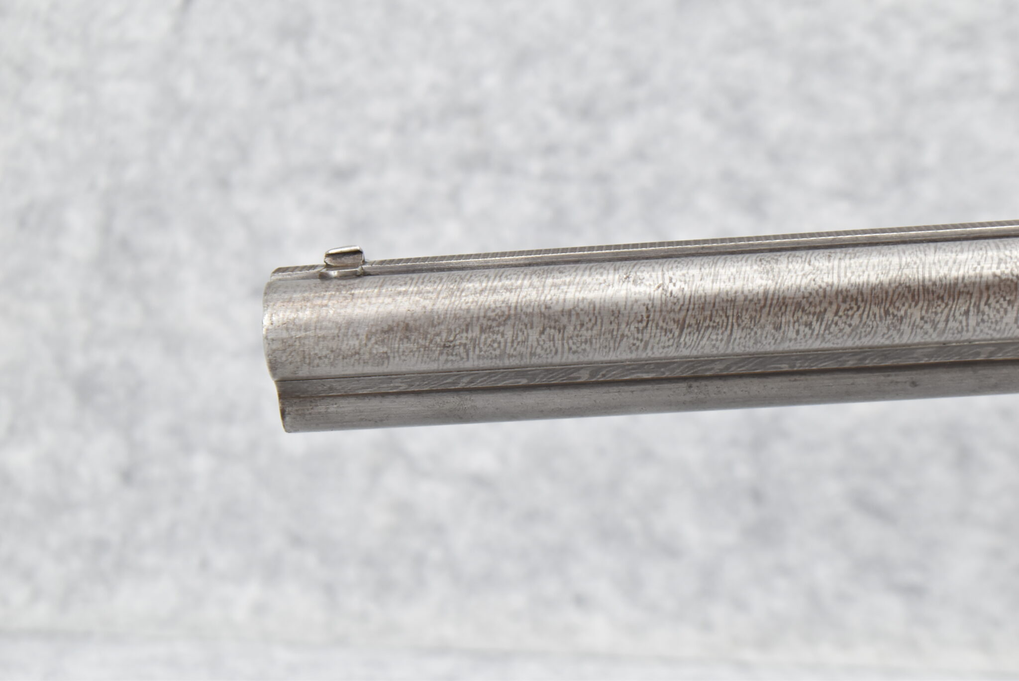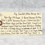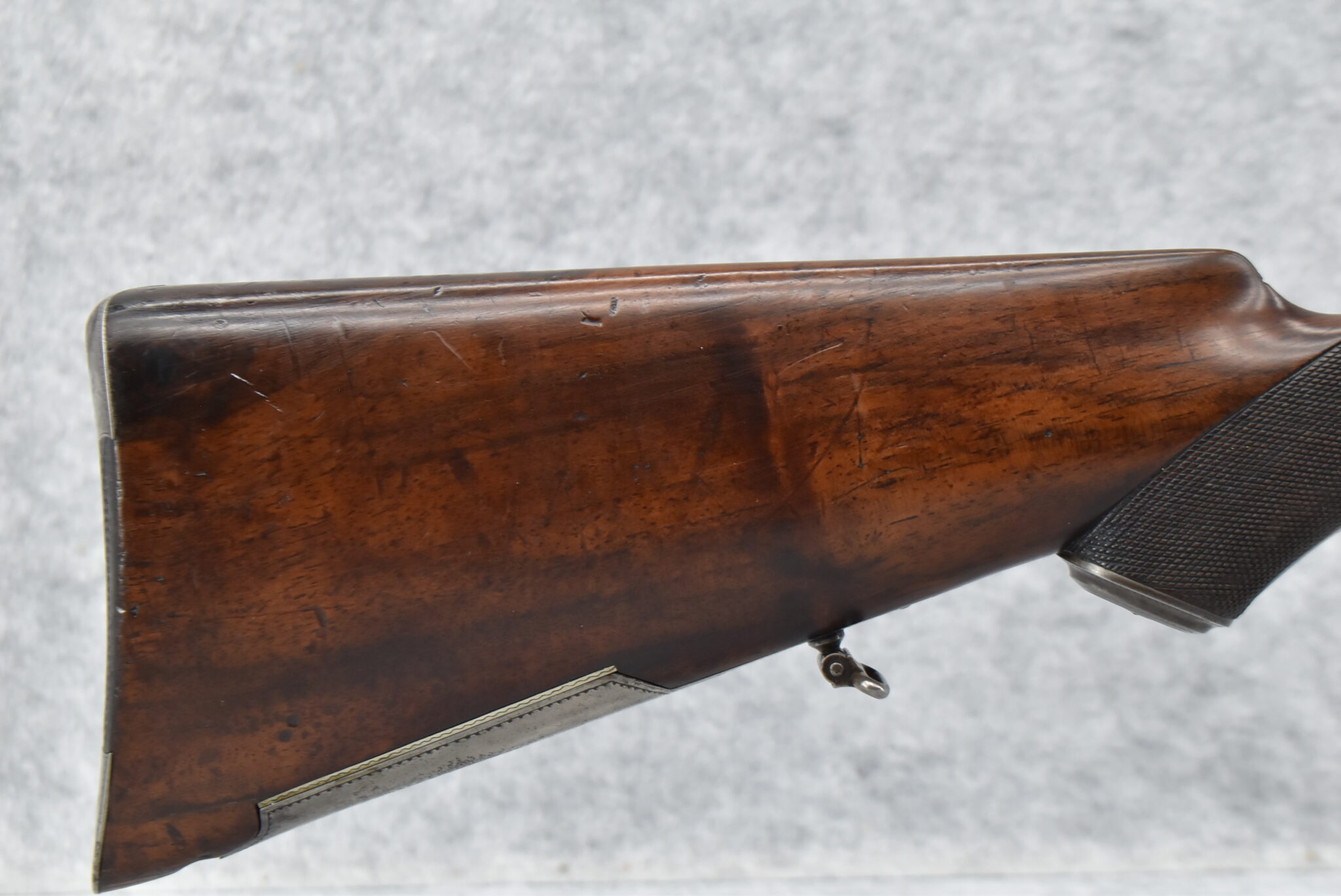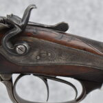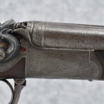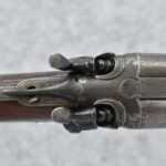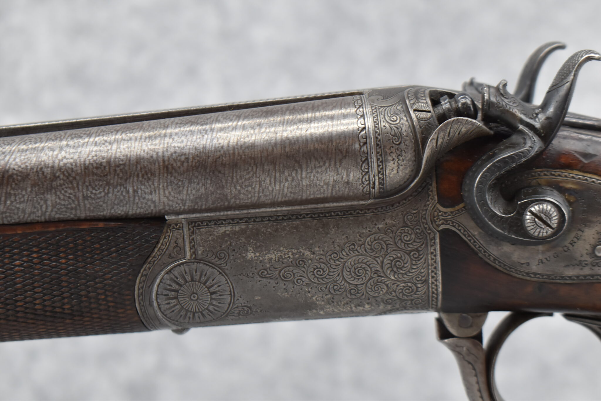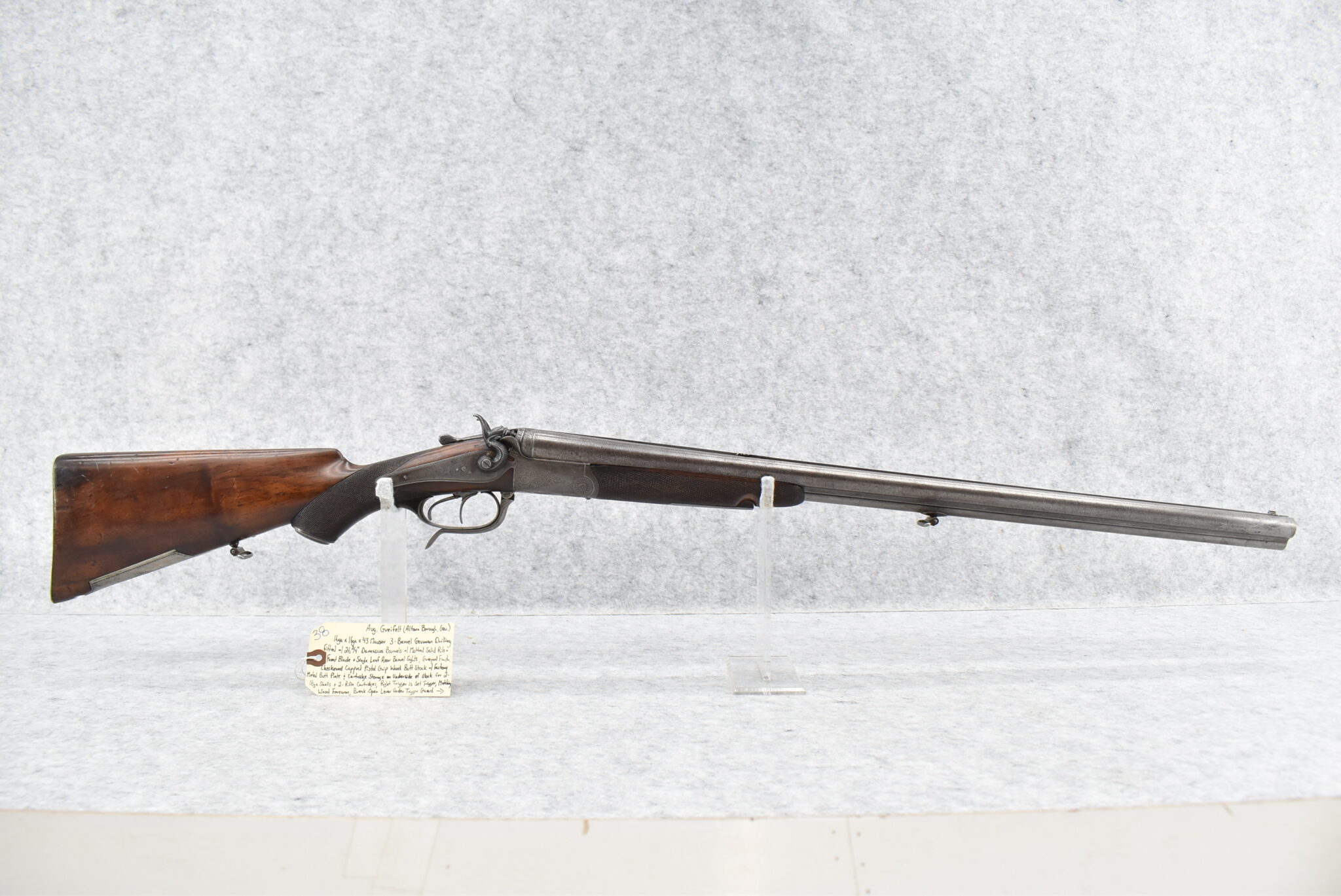 38. Aug. Greifelt (Altona Borough, Ger.) – 16ga. X 16ga. X 43 Mauser Cal. 3-Barrel German Drilling – Fitted w/26 ¾” Damascus Barrels w/Matted Solid Rib & Front Blade & Single Leaf Rear Barrel Sights – Grayed Finish – w/Checkered Capped Pistol Grip Wood Butt Stock w/Factory Metal Butt Plate w/Cartridge Storage on Underside of Stock for Two 16ga. Shells & Two Rifle Cartridges w/Matching Wood Forearm – w/Double Triggers w/the Right Trigger Being a Set Trigger – w/Double Hammers – w/Break-Open Lever Under Trigger Guard – w/Flush Fit Folding Rear Tang Sight – Sling Swivels – Very Tight Gun! – LOP 13 7/8” – Gun Weighs 7lbs. 13oz.
