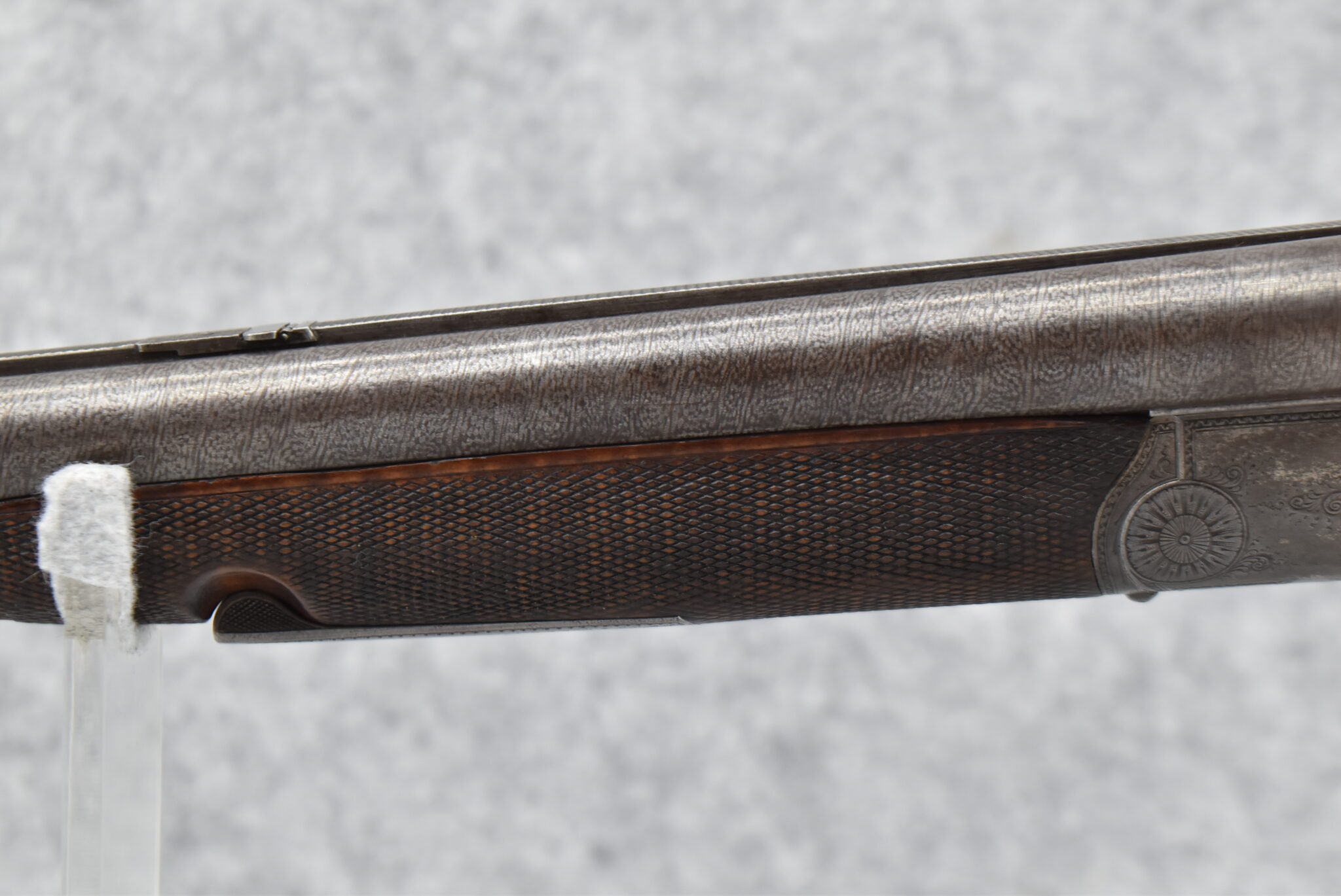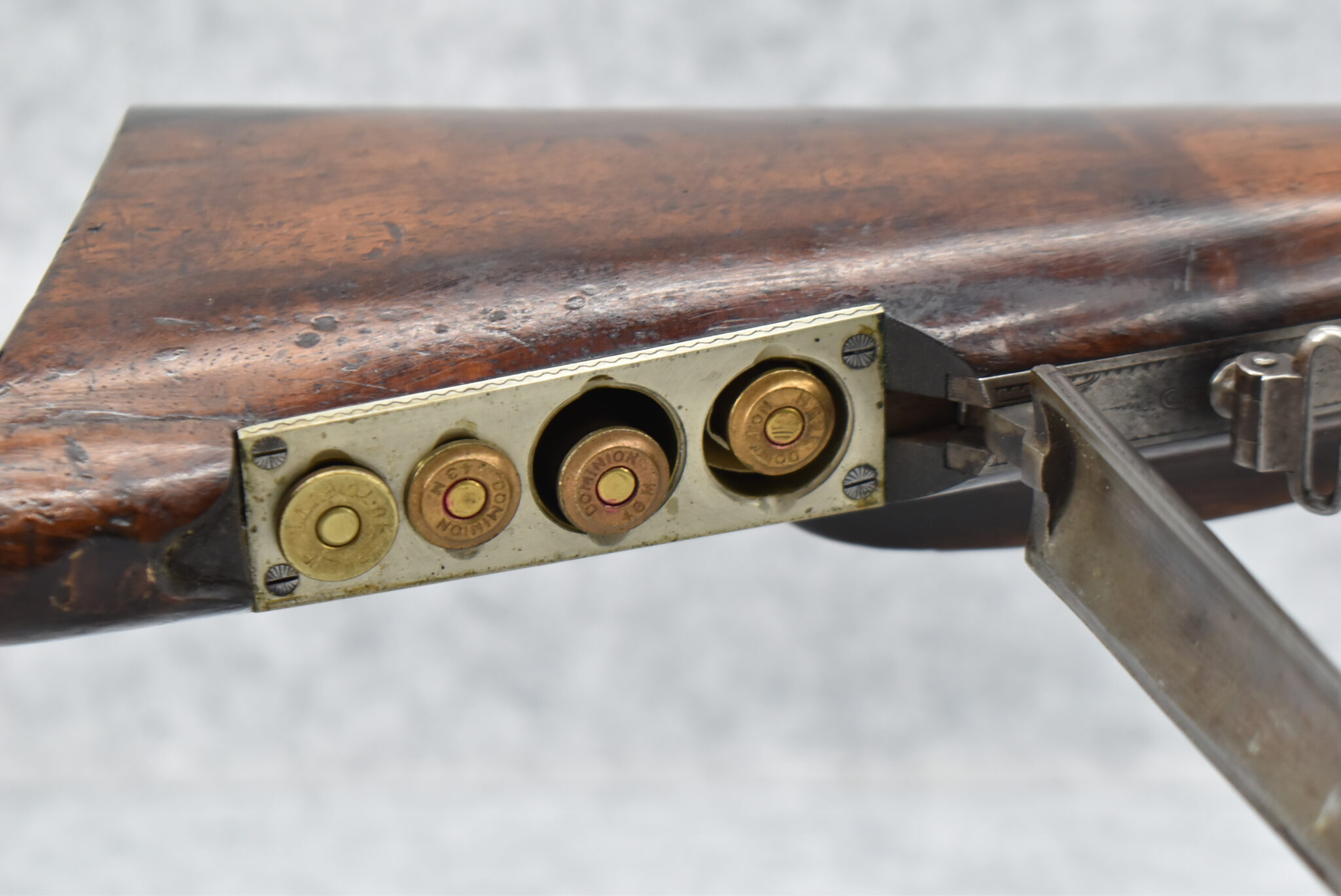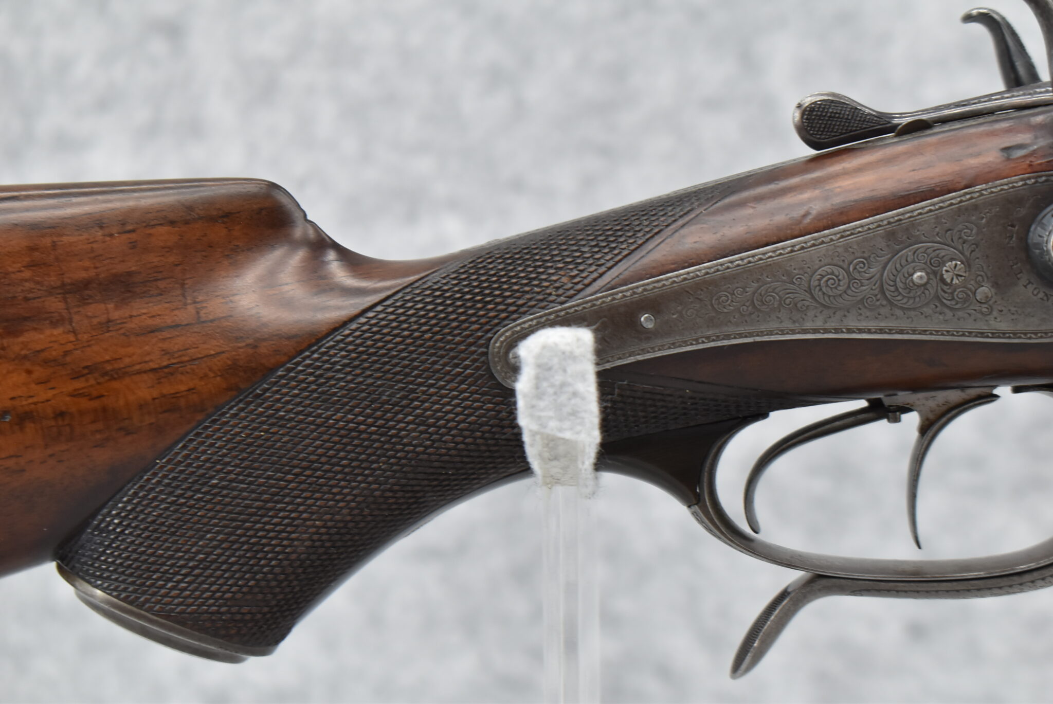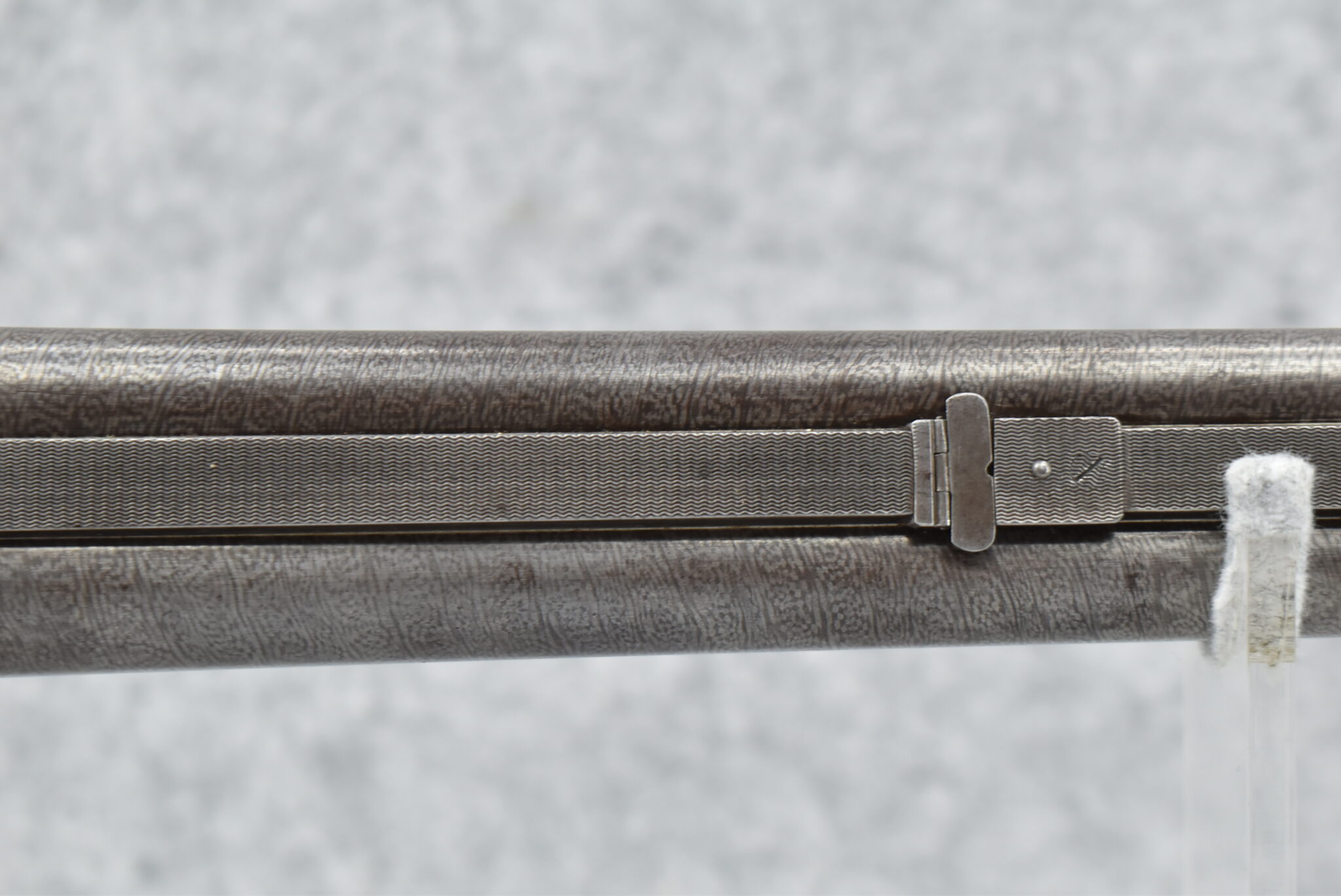 38. Aug. Greifelt (Altona Borough, Ger.) – 16ga. X 16ga. X 43 Mauser Cal. 3-Barrel German Drilling – Fitted w/26 ¾” Damascus Barrels w/Matted Solid Rib & Front Blade & Single Leaf Rear Barrel Sights – Grayed Finish – w/Checkered Capped Pistol Grip Wood Butt Stock w/Factory Metal Butt Plate w/Cartridge Storage on Underside of Stock for Two 16ga. Shells & Two Rifle Cartridges w/Matching Wood Forearm – w/Double Triggers w/the Right Trigger Being a Set Trigger – w/Double Hammers – w/Break-Open Lever Under Trigger Guard – w/Flush Fit Folding Rear Tang Sight – Sling Swivels – Very Tight Gun! – LOP 13 7/8” – Gun Weighs 7lbs. 13oz.