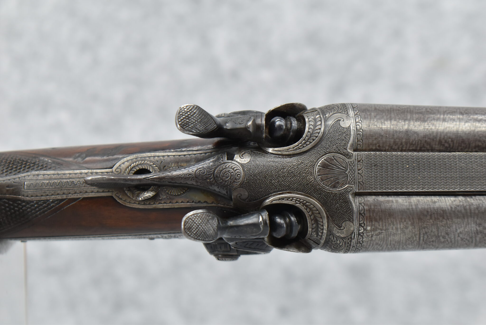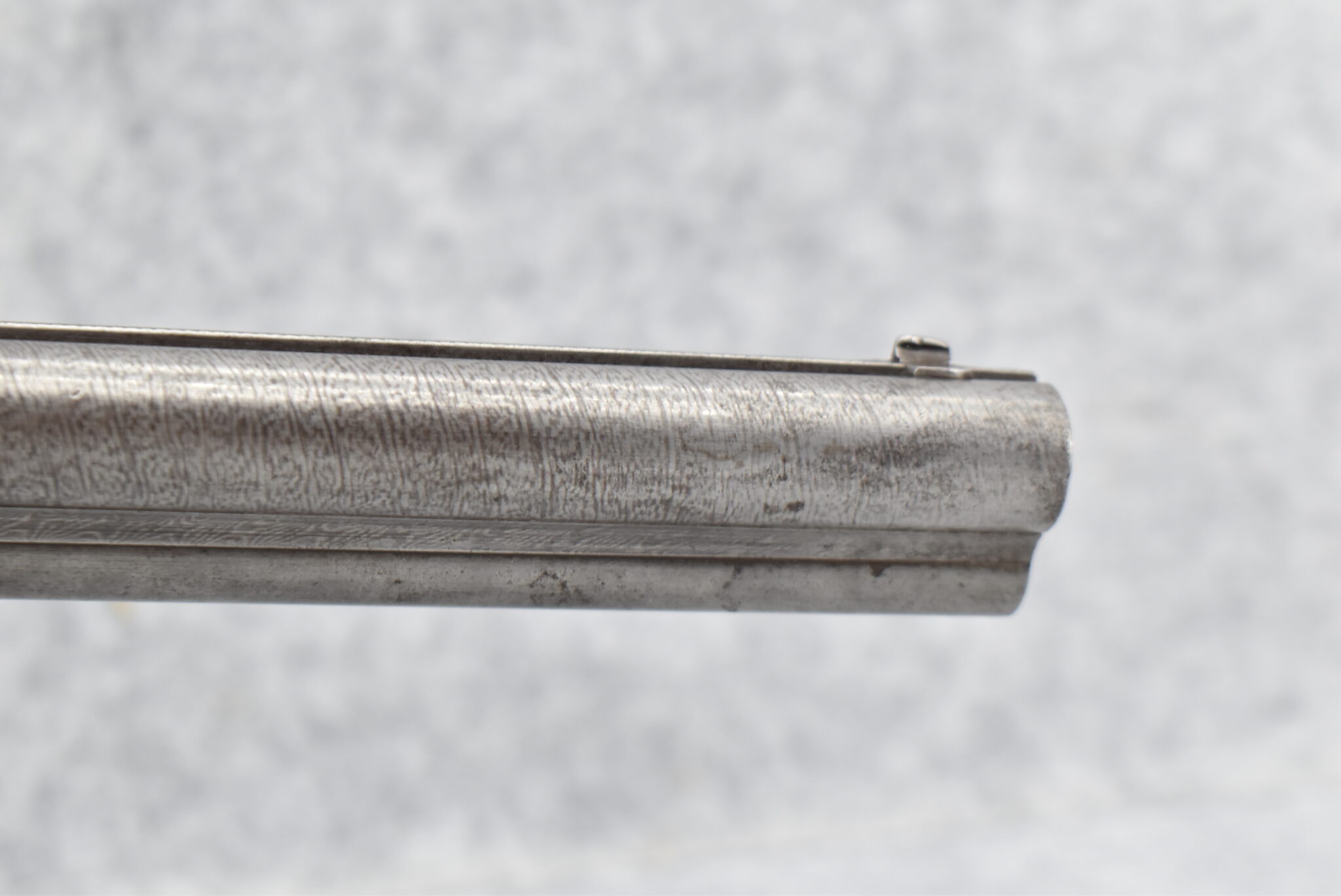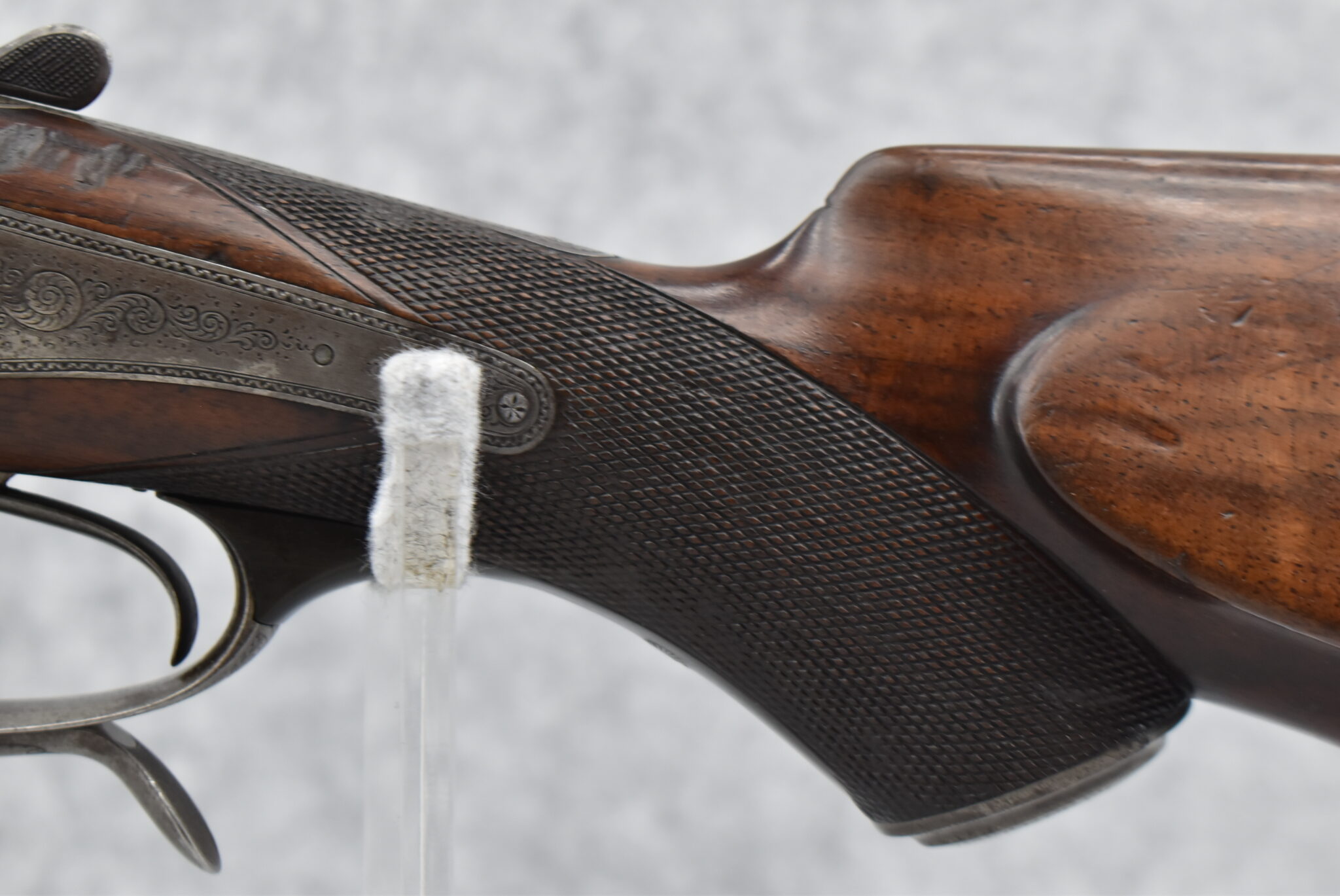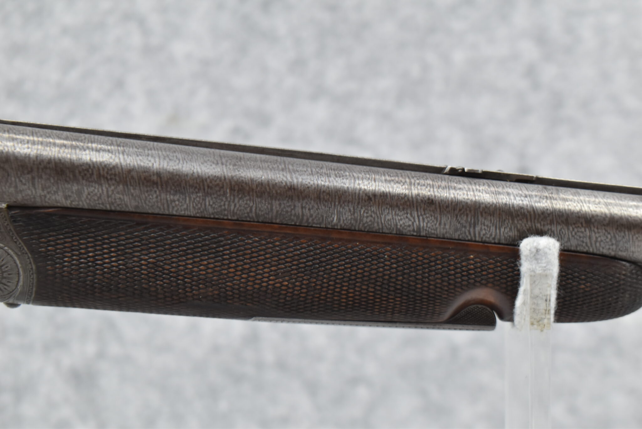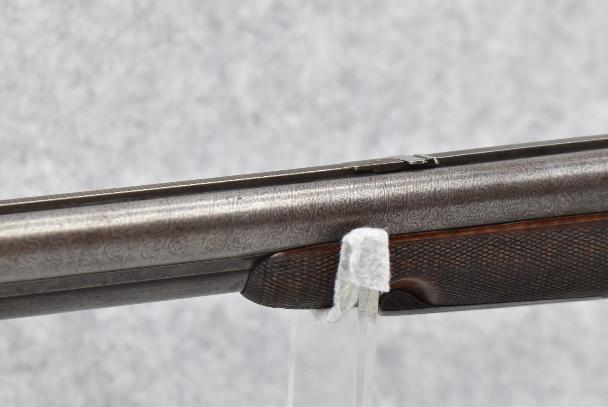 38. Aug. Greifelt (Altona Borough, Ger.) – 16ga. X 16ga. X 43 Mauser Cal. 3-Barrel German Drilling – Fitted w/26 ¾” Damascus Barrels w/Matted Solid Rib & Front Blade & Single Leaf Rear Barrel Sights – Grayed Finish – w/Checkered Capped Pistol Grip Wood Butt Stock w/Factory Metal Butt Plate w/Cartridge Storage on Underside of Stock for Two 16ga. Shells & Two Rifle Cartridges w/Matching Wood Forearm – w/Double Triggers w/the Right Trigger Being a Set Trigger – w/Double Hammers – w/Break-Open Lever Under Trigger Guard – w/Flush Fit Folding Rear Tang Sight – Sling Swivels – Very Tight Gun! – LOP 13 7/8” – Gun Weighs 7lbs. 13oz.