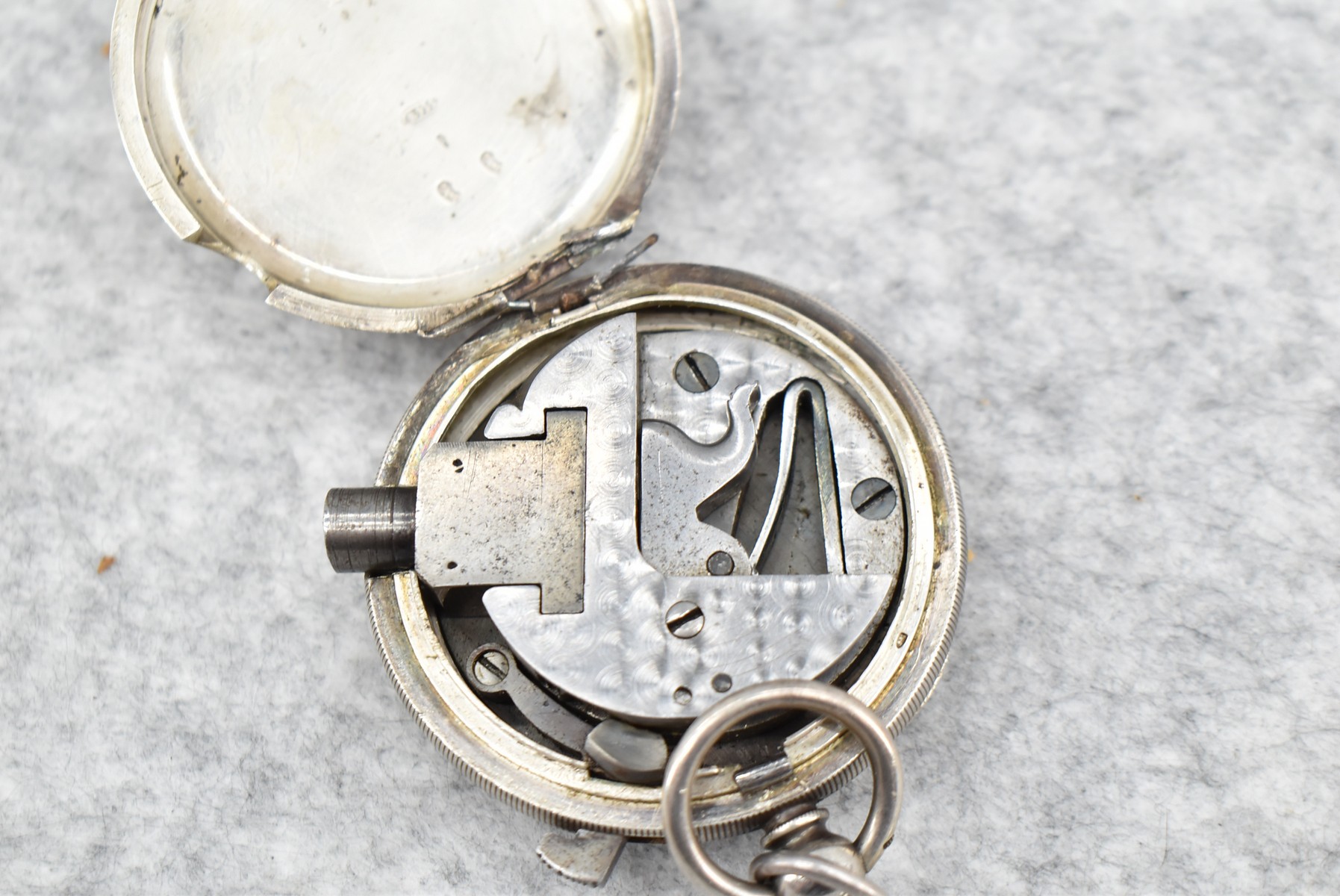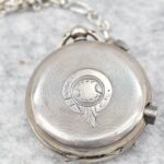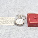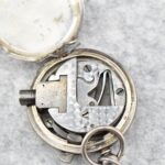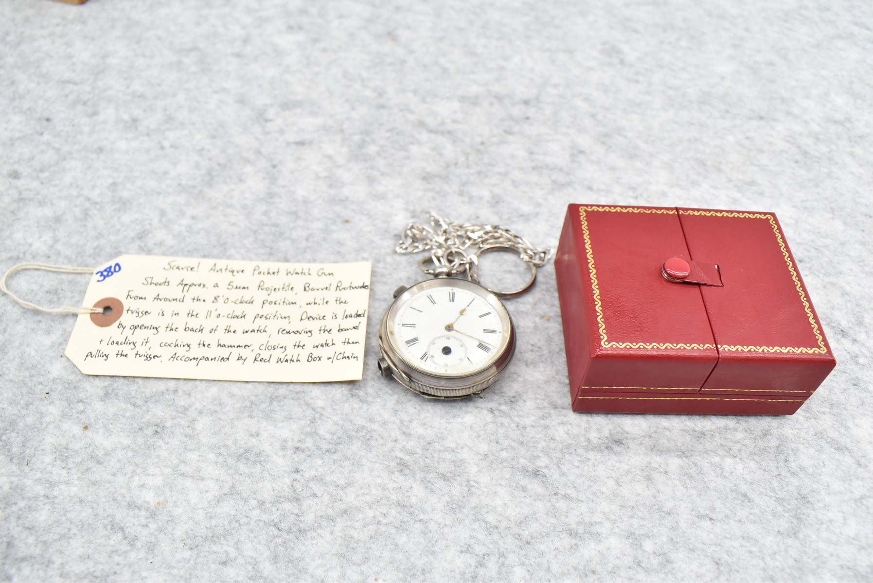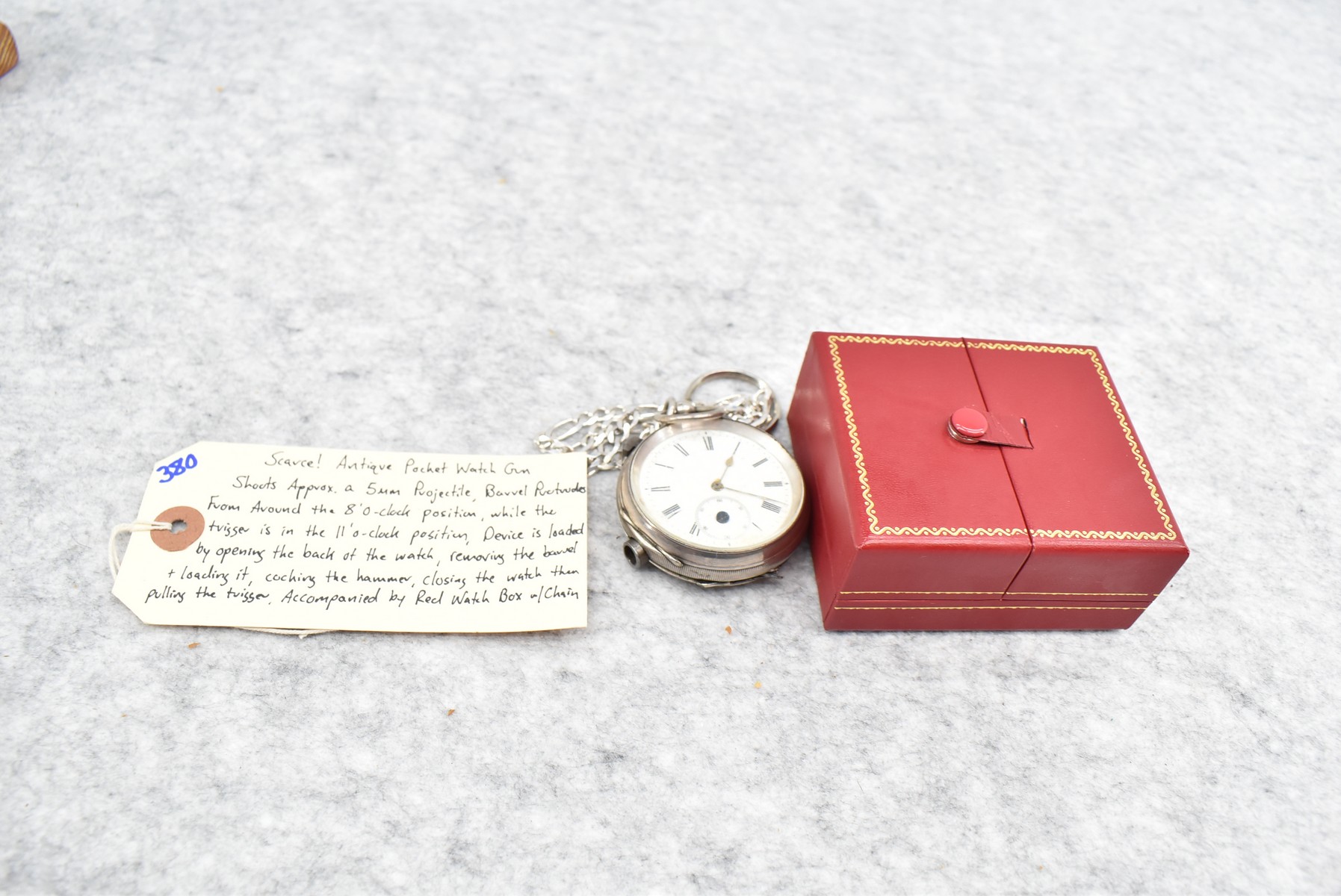 380. Scarce! Antique Pocket Watch Gun – Shoots Approx. a 5mm Projectile – Barrel Protrudes From Around the 8’ O-Clock Position While the Trigger is in the 11’ O-Clock Position – Device is Loaded by Opening the Back of the Watch, Removing the Barrel & Loading it, Cocking the Hammer, Closing the Watch Then Pulling the Trigger – Accompanied by Red Watch Box w/Chain