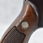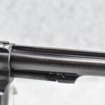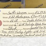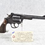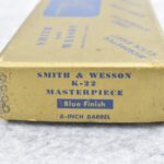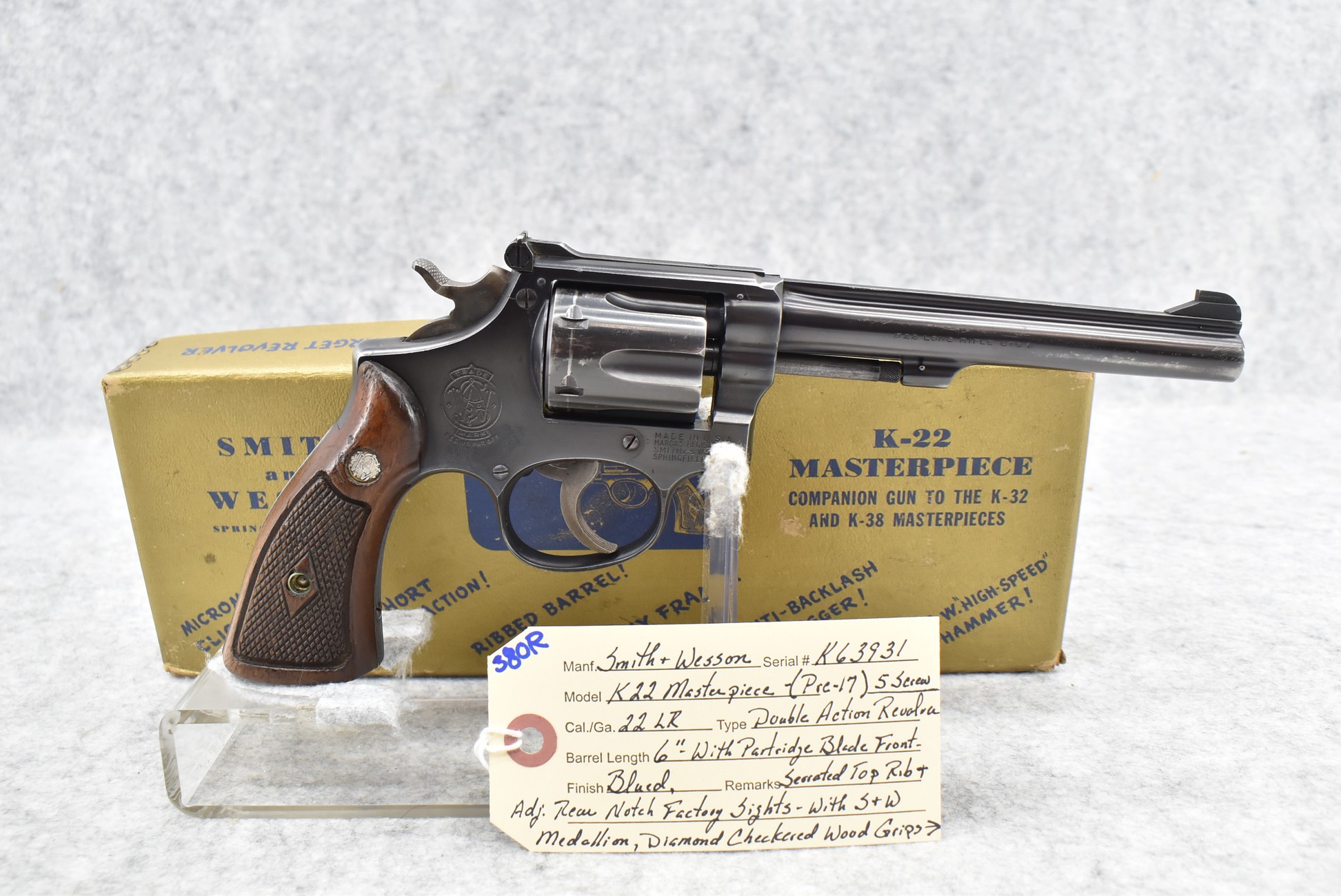 380R. Smith & Wesson – Mod. K22 Masterpiece (Pre-17, 5-Screw) – 22LR Cal. Double Action Revolver – w/6” Barrel w/Serrated Top Rib w/Partridge Blade Front & Adj. Rear Notch Factory Sights – Blued Finish – w/S&W Medallion Diamond Checkered Wood Grips – w/Original Gold & Blue 2pc. Factory Box, Cleaning Rod & Screwdriver – All Matching Numbers Including Box – Mfg. 1948