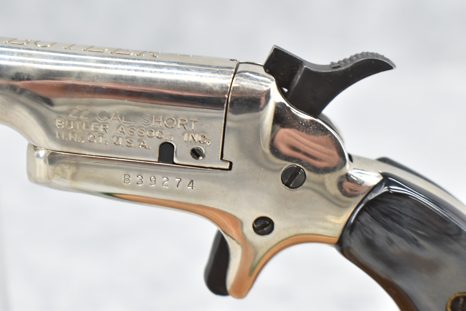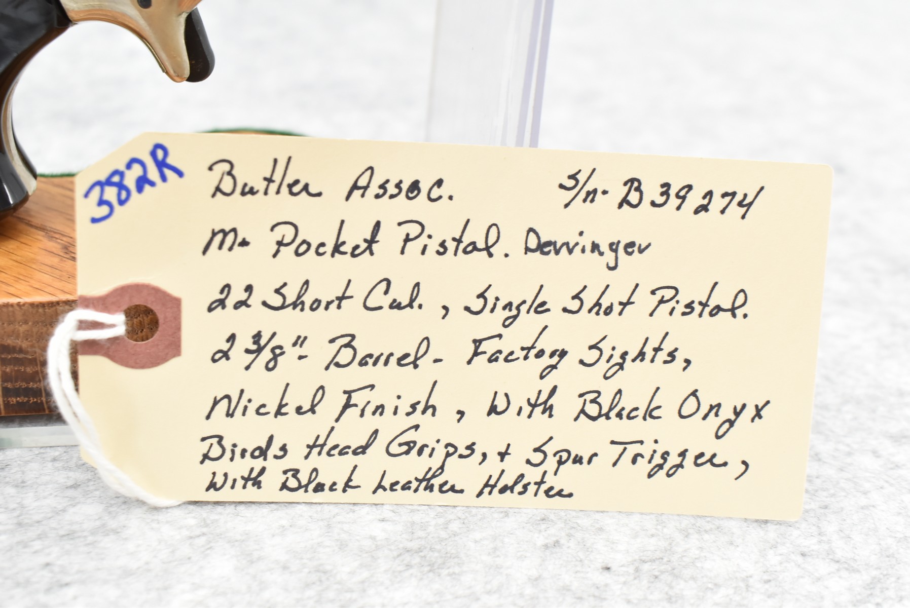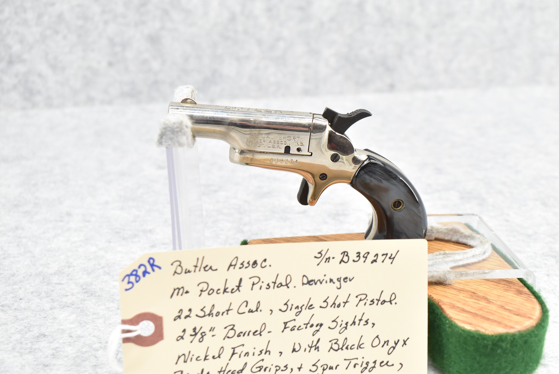 382R. Butler Assoc. – Mod. Pocket Pistol Derringer – 22 Short Cal. Single Shot Pistol – w/2 3/8” Barrel w/Factory Sights – Nickel Finish – w/Black Onyx Birds Head Grips – w/Spur Trigger – w/Black Leather Holster